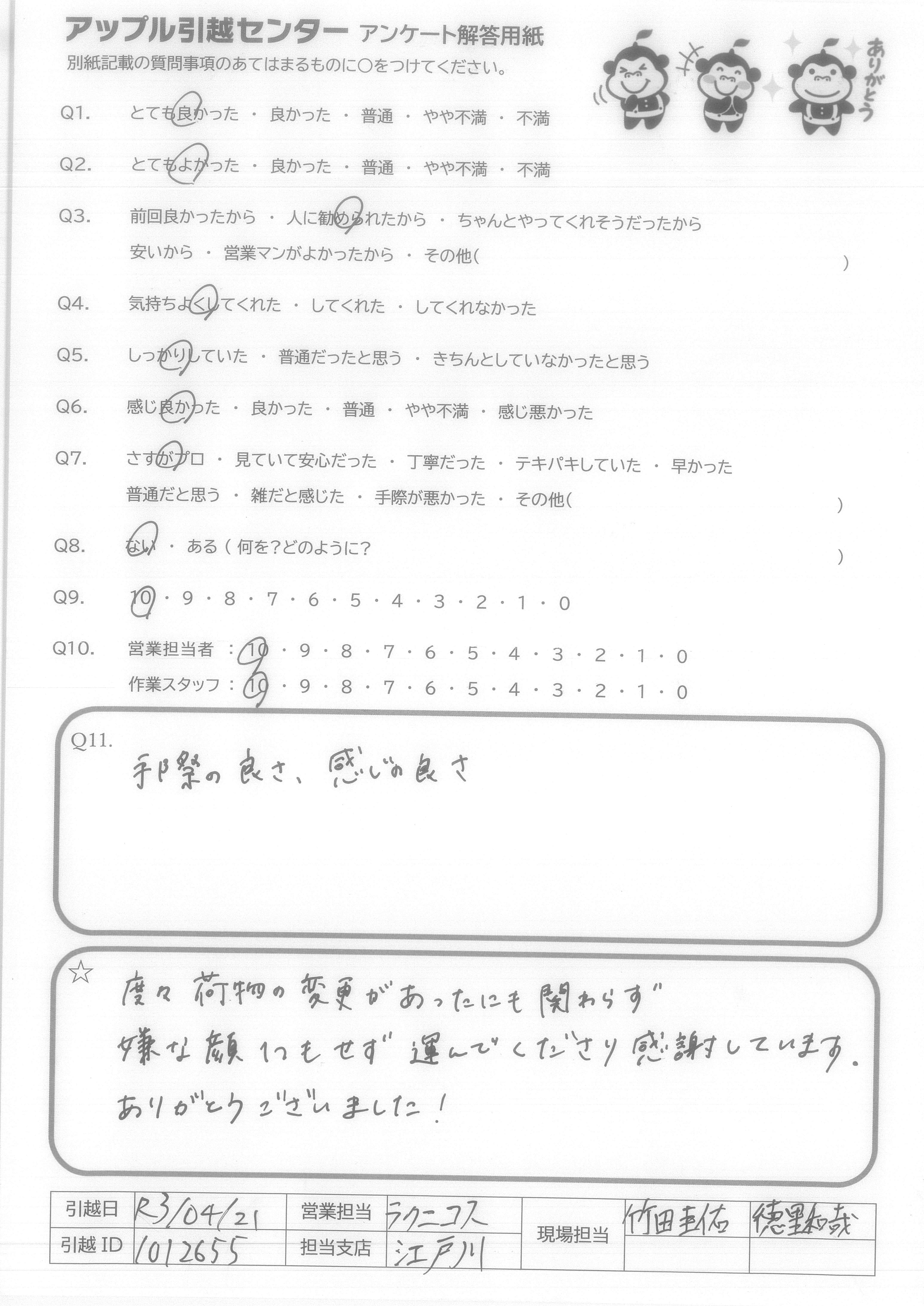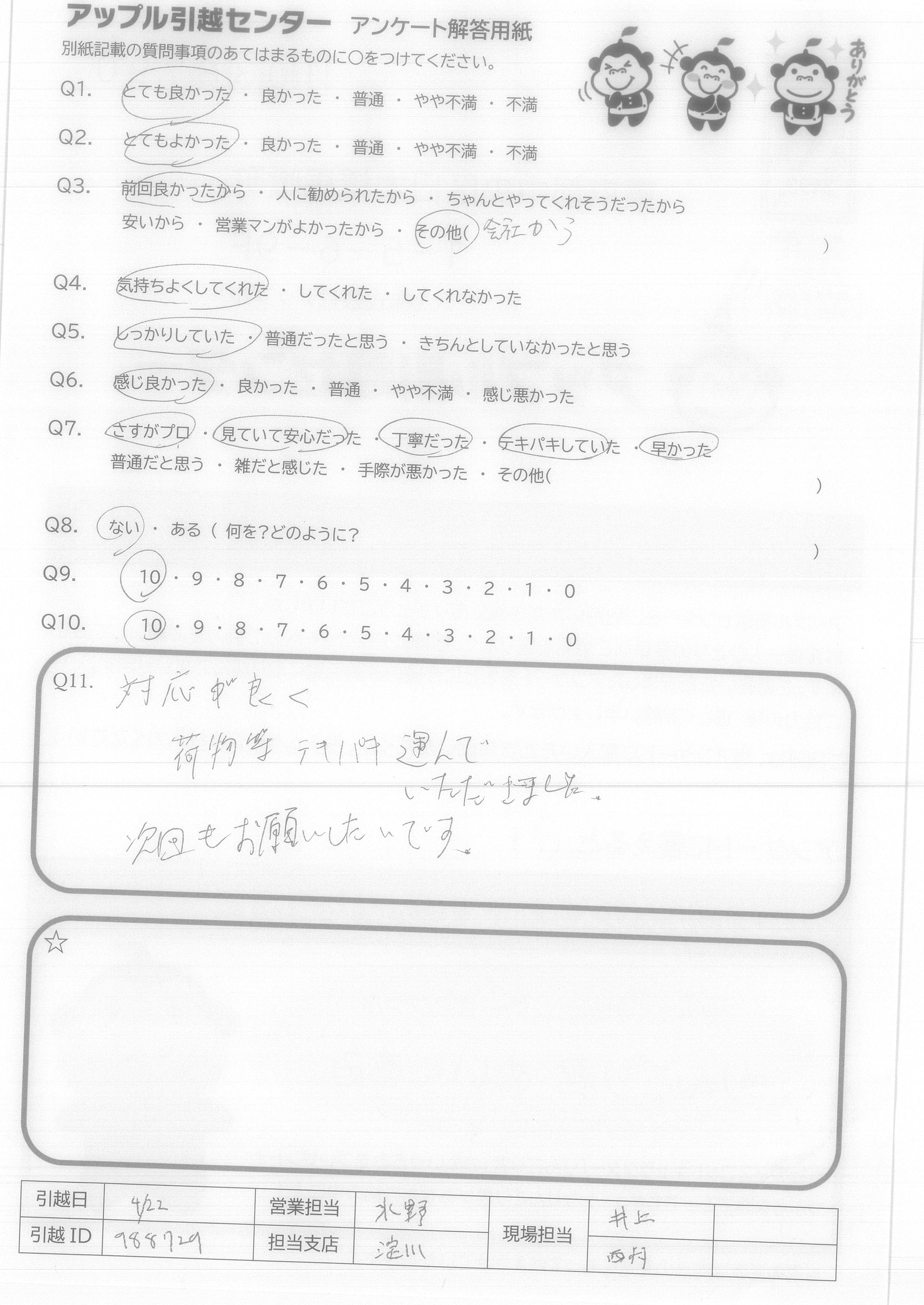 A.大変満足しています。 ありがとうございました。 また引越す時はアップルさんに頼みたいと思います。