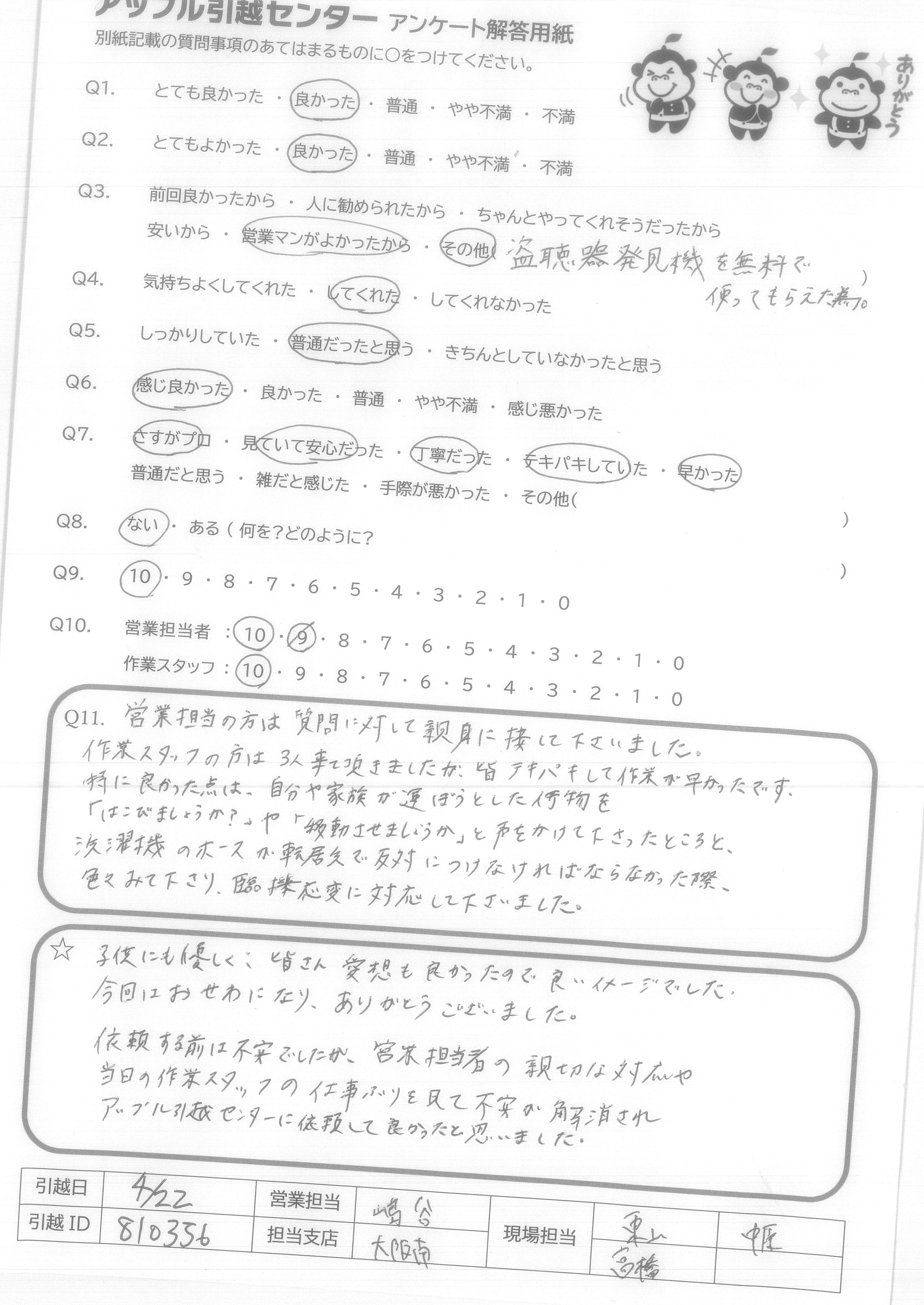 A.子供にも優しく、皆さん愛想も良かったので良いイメージでした。今回はお世話になり、ありがとうございました。依頼する前は不安でしたが、営業担当者の親切な対応や当日の作業スタッフの仕事ぶりを見て不安が解消されアップル引越センターに依頼して良かったと思いました。