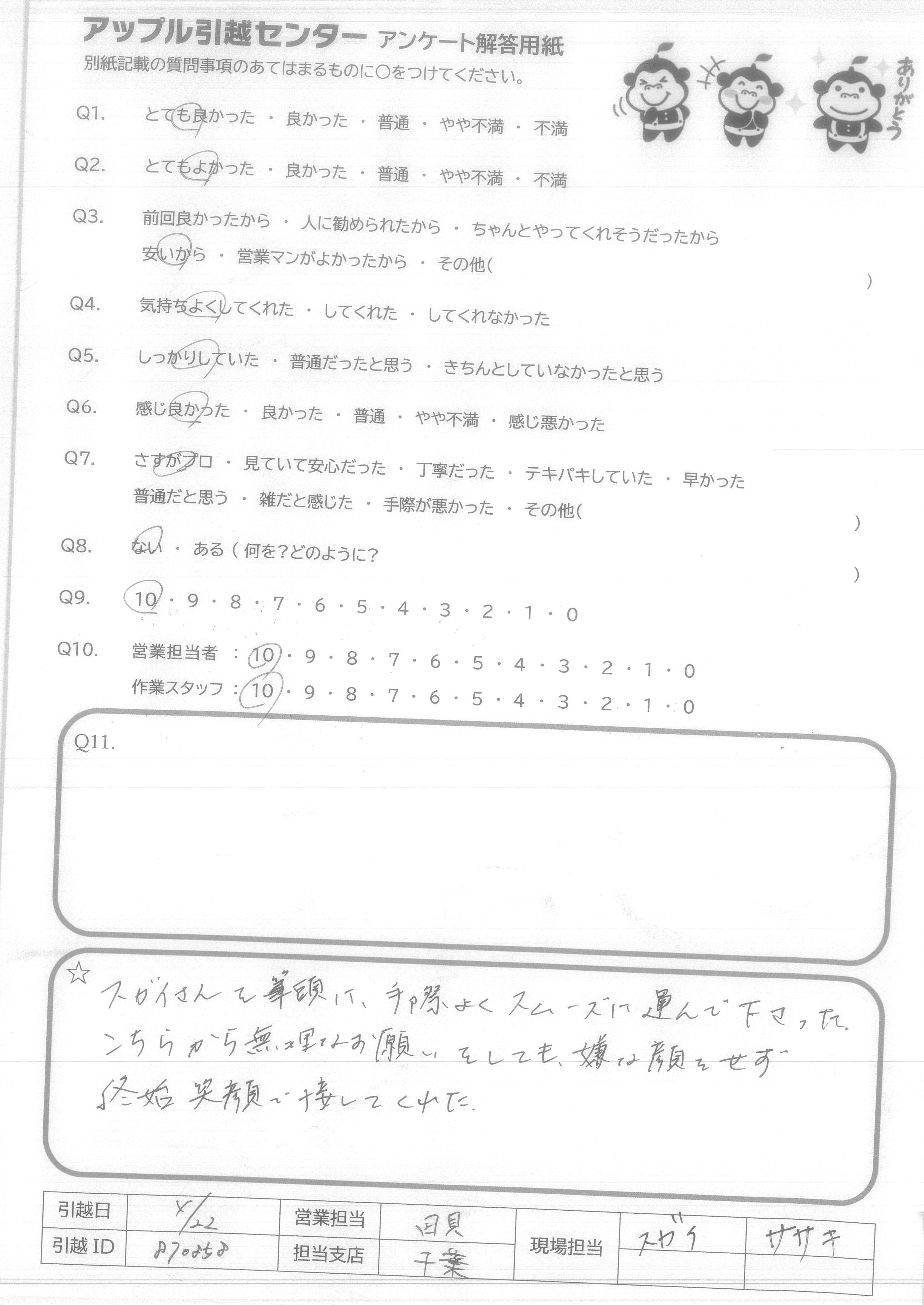 A.前回3年ほど前にお願いした際に費用の安さと作業のクオリティに感動し、また引越しをするときは絶対にお願いしようと思っていました。今回も前回と変わらず丁寧な対応をしていただきました。渋滞で新居へ向かうのがかなり遅くなってしまいかなりお待たせしてしまいましたが、ゆっくりお越し下さいとの言葉をいただき、焦っていた私はとても安心しました。暑い中での引っ越しでしたがお疲れさまでした。ありがとうございました。 またいつか引越しするときにはよろしくお願い致します!