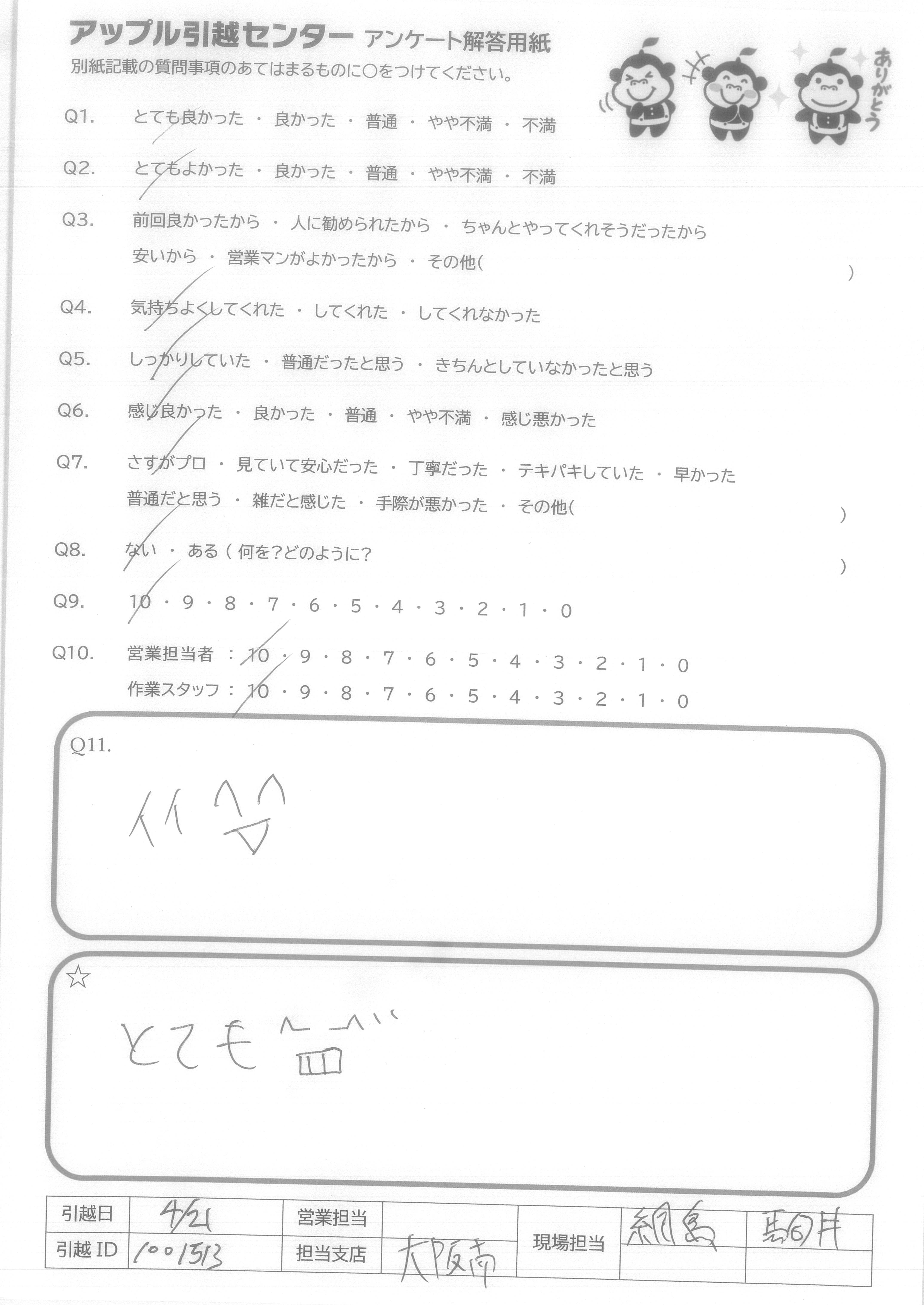 引越し日:2021年04月21日 エリア:大阪府大阪市生野区