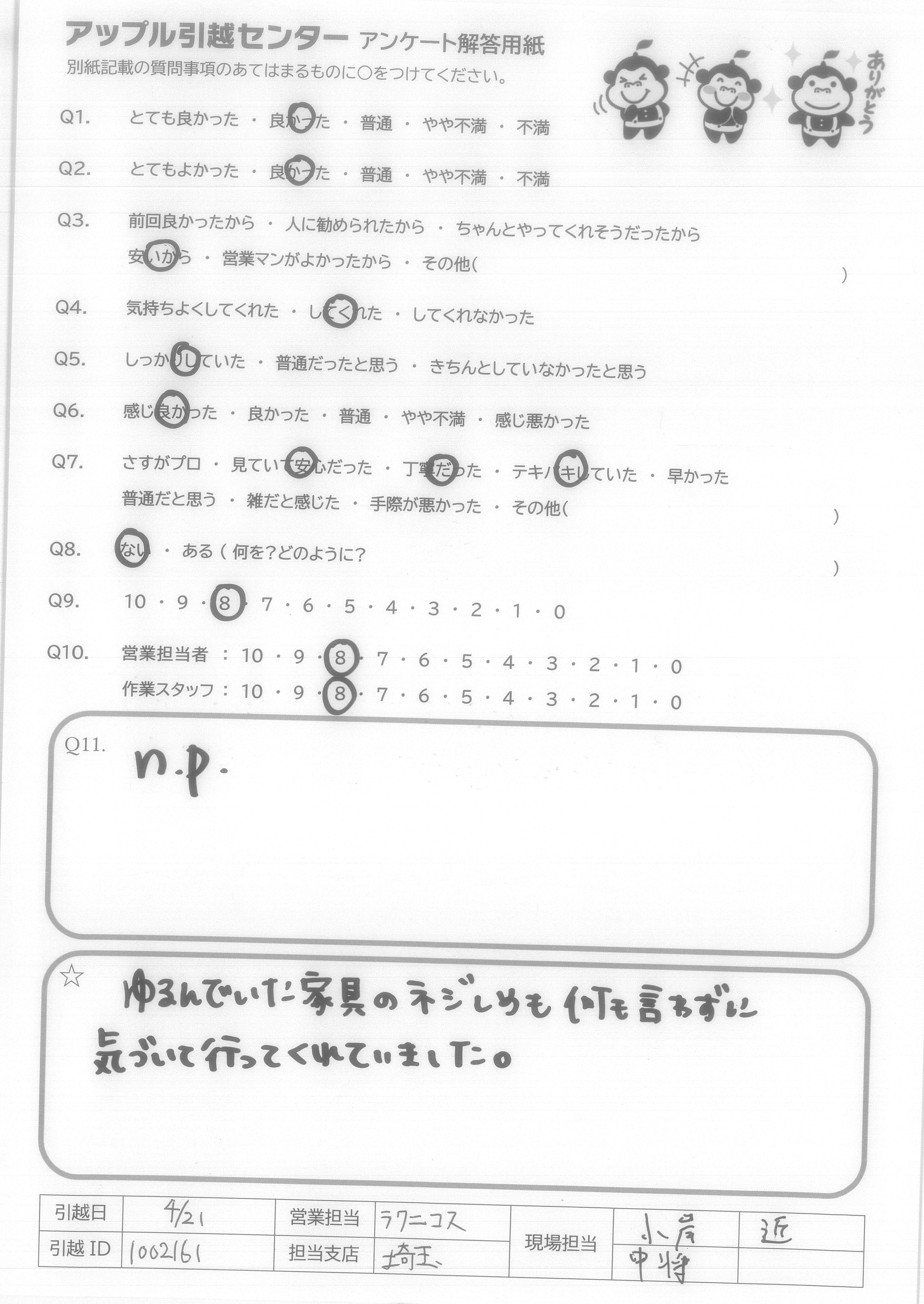 A.私1人での引越しで、当日までこんぽうetcできてなかったのに、きちんと対応してくださったり、新居に家具など、どう置けばいいかアドバイスしてくれたり本当に感謝しかないです。