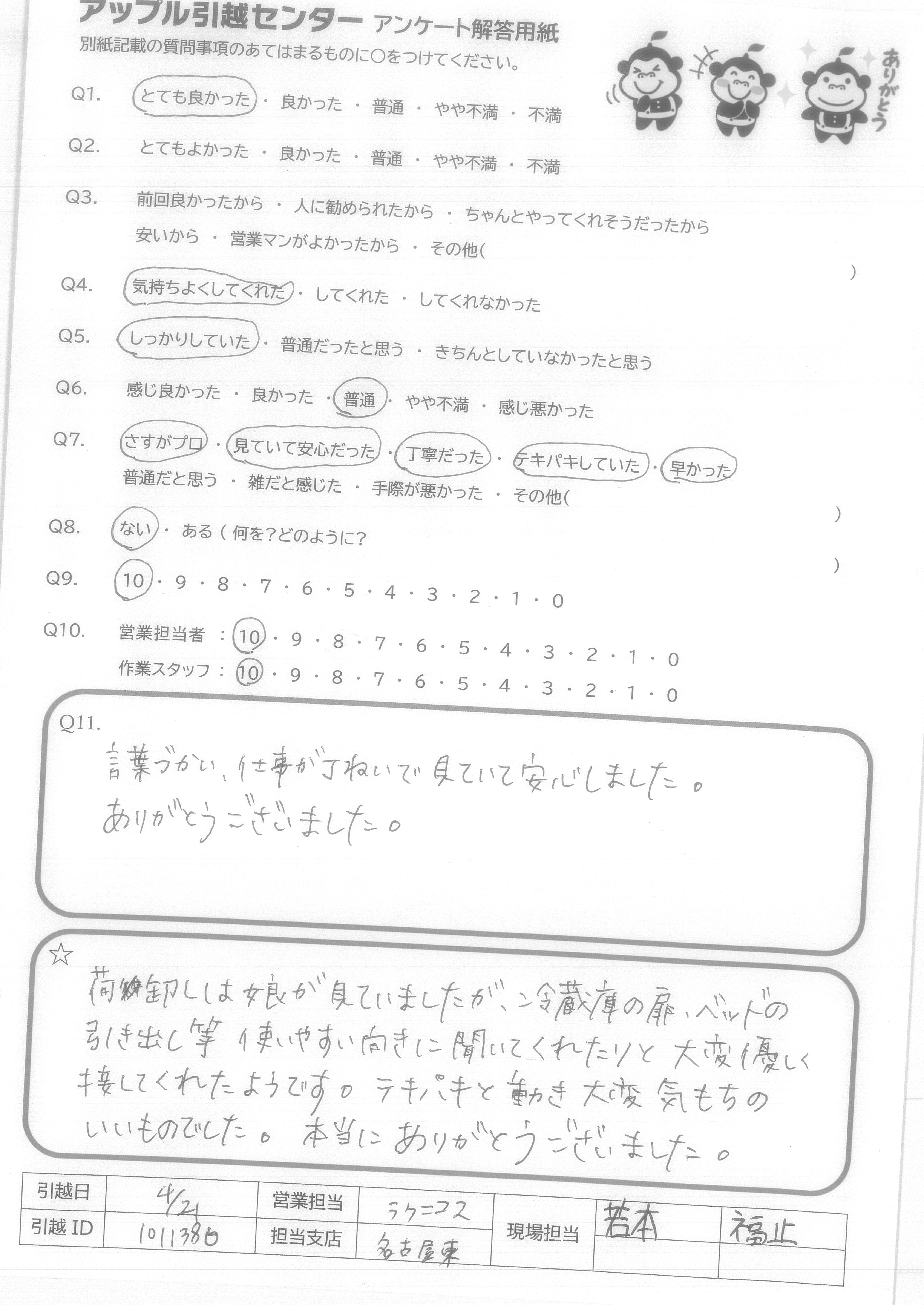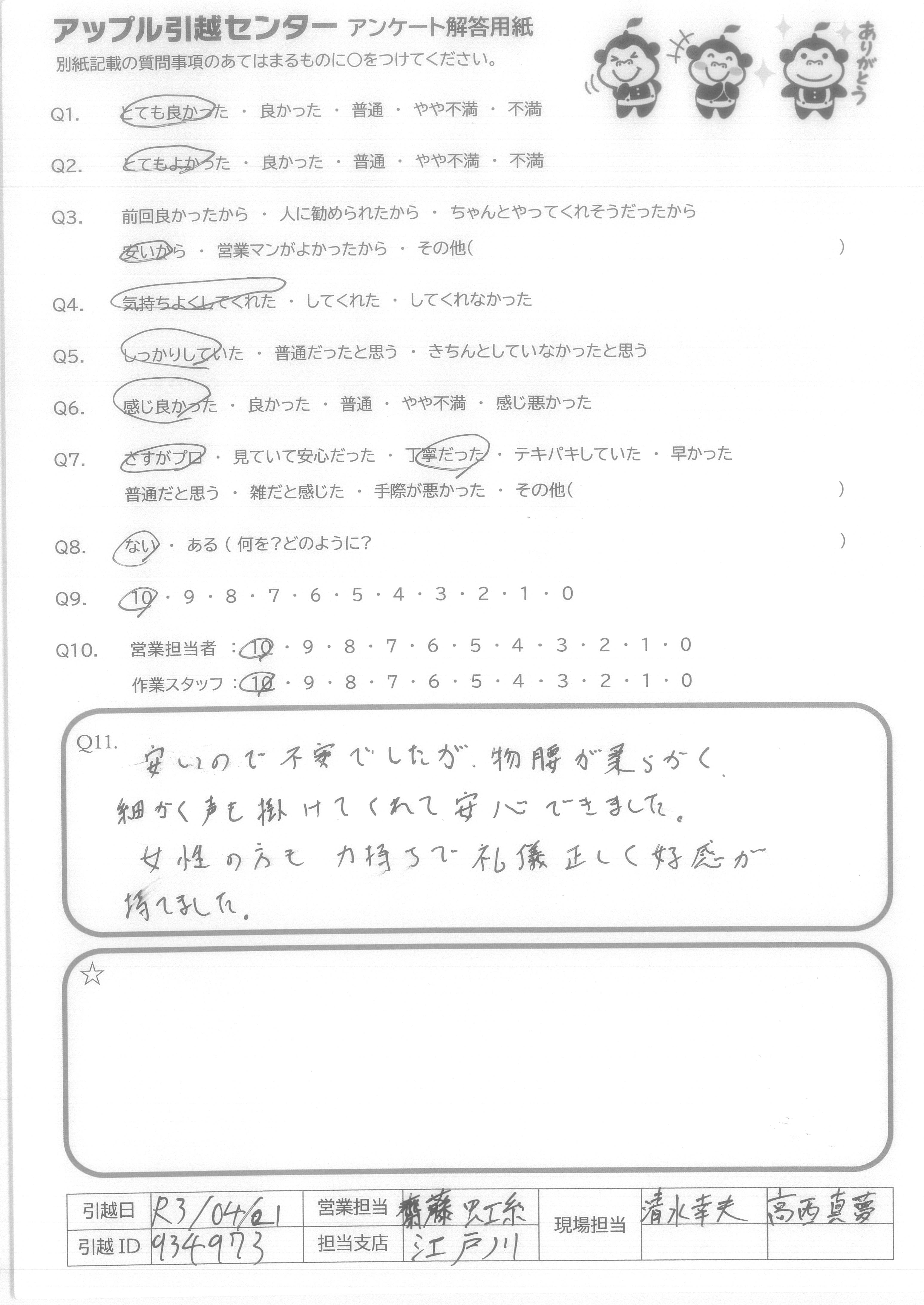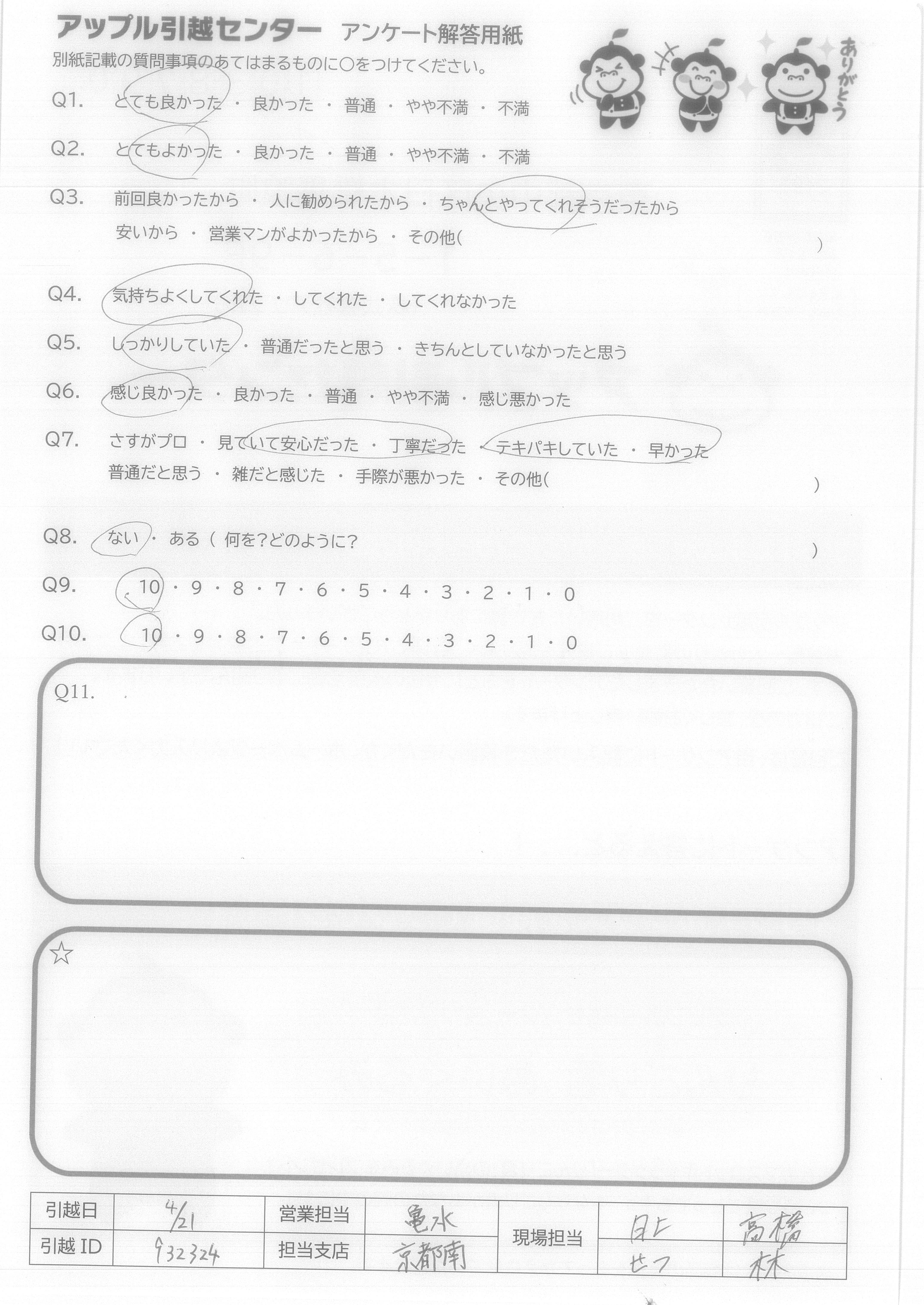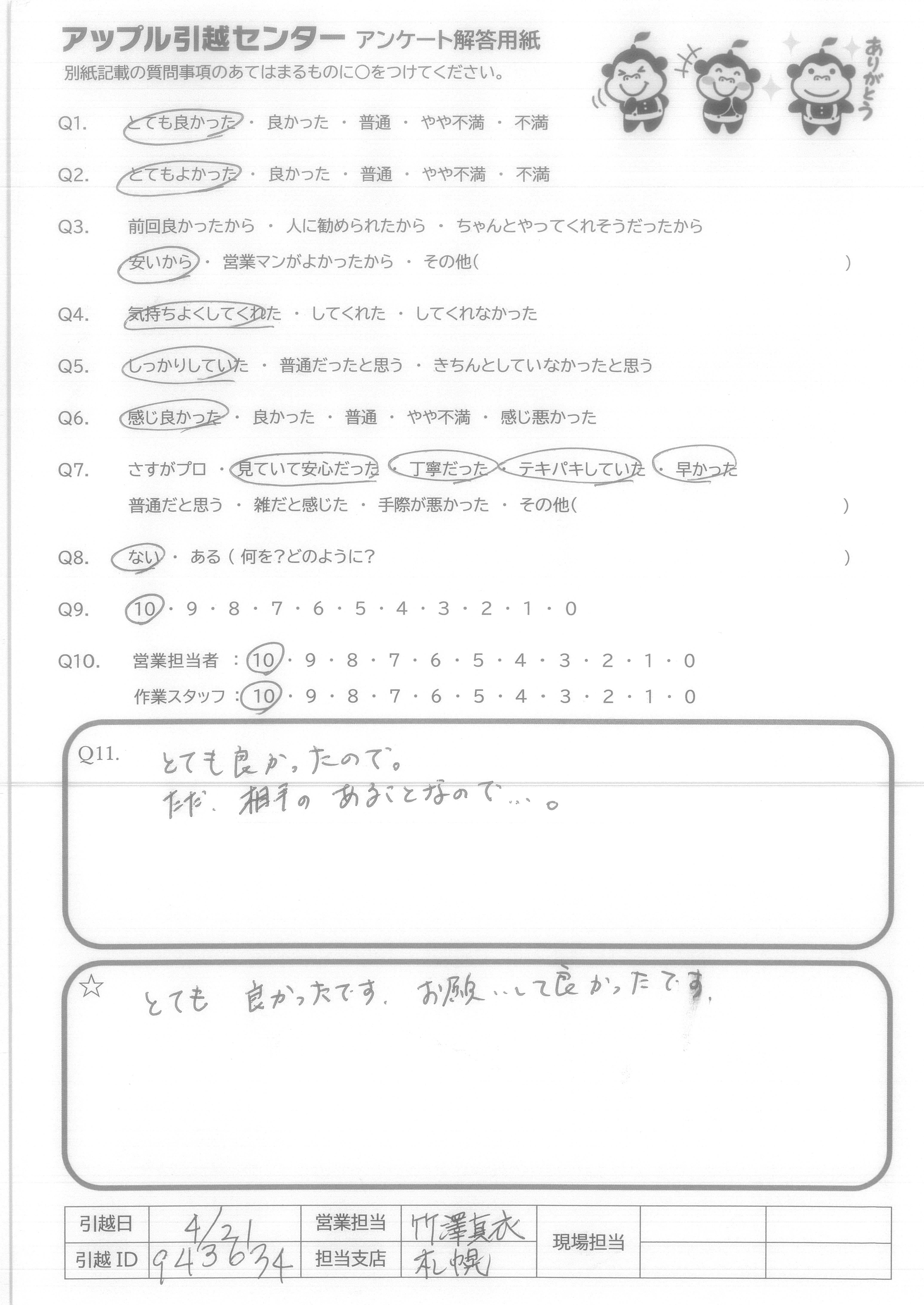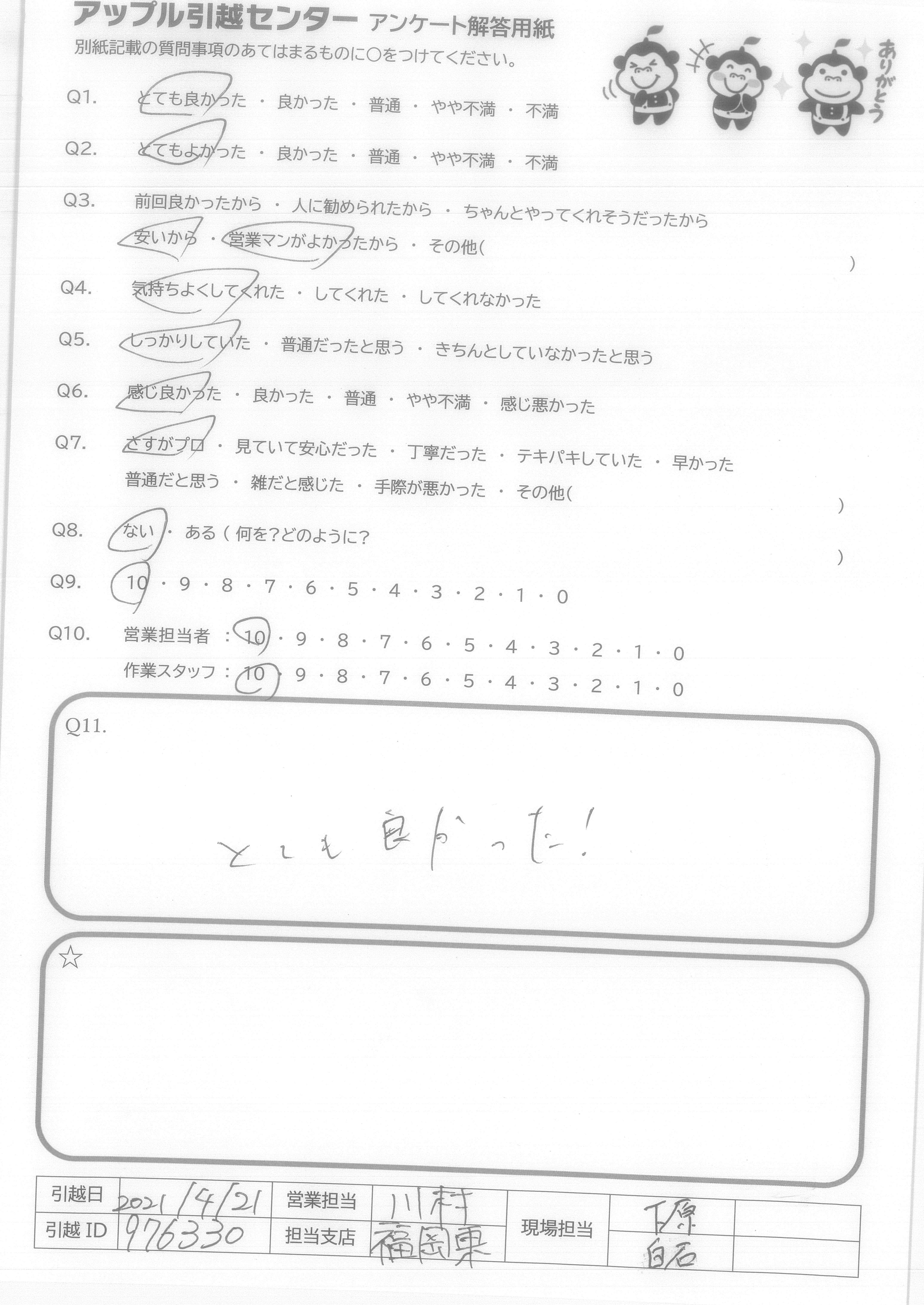 A.今まで色々な引っ越し業者を利用しましたが、御社のスタッフの皆さんの対応が一番良かったです。金額も安いのに、丁寧にテキパキと愛想良く作業していただけて大満足です。不用品の回収もとても助かりました。本当にありがとうございました!