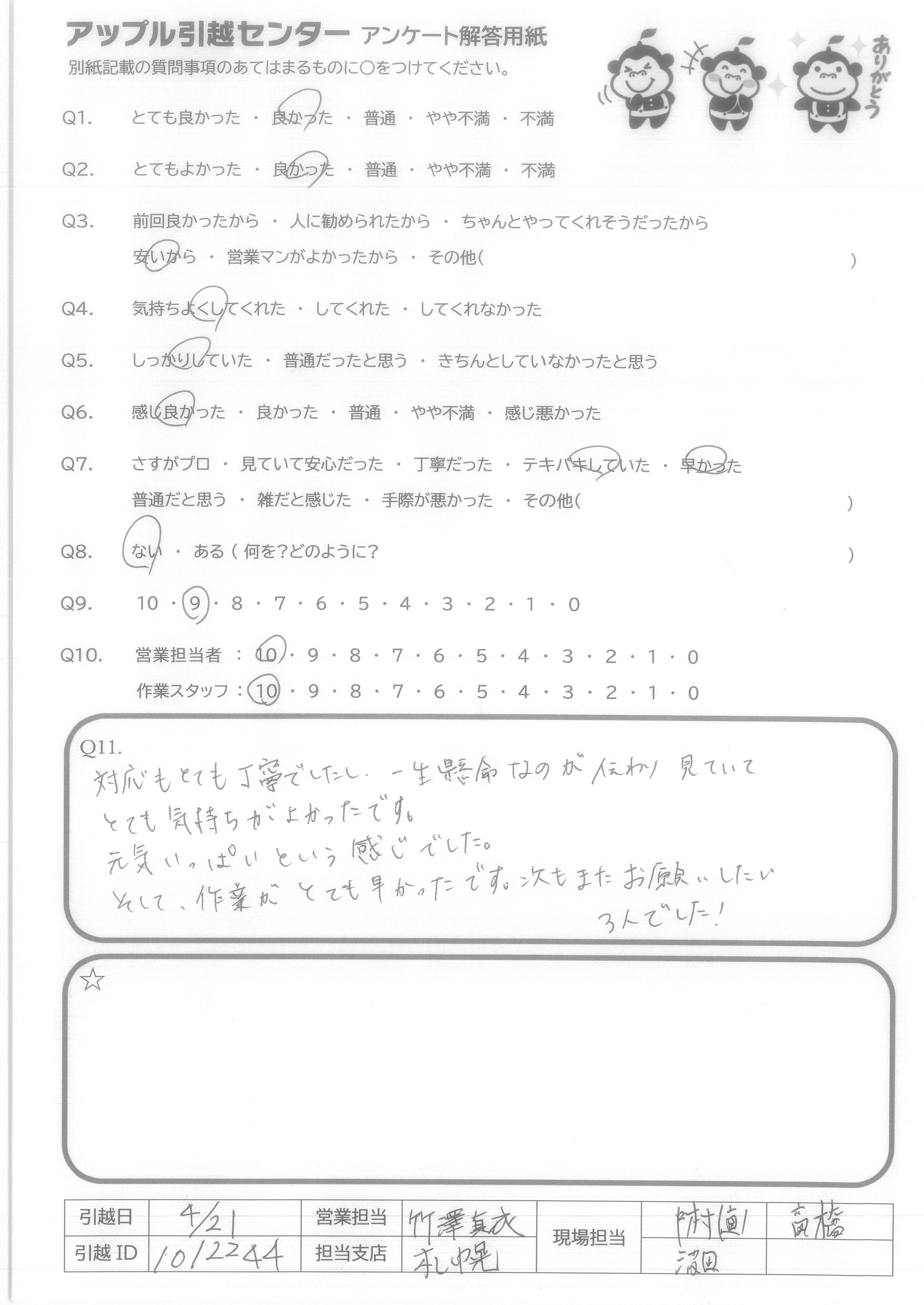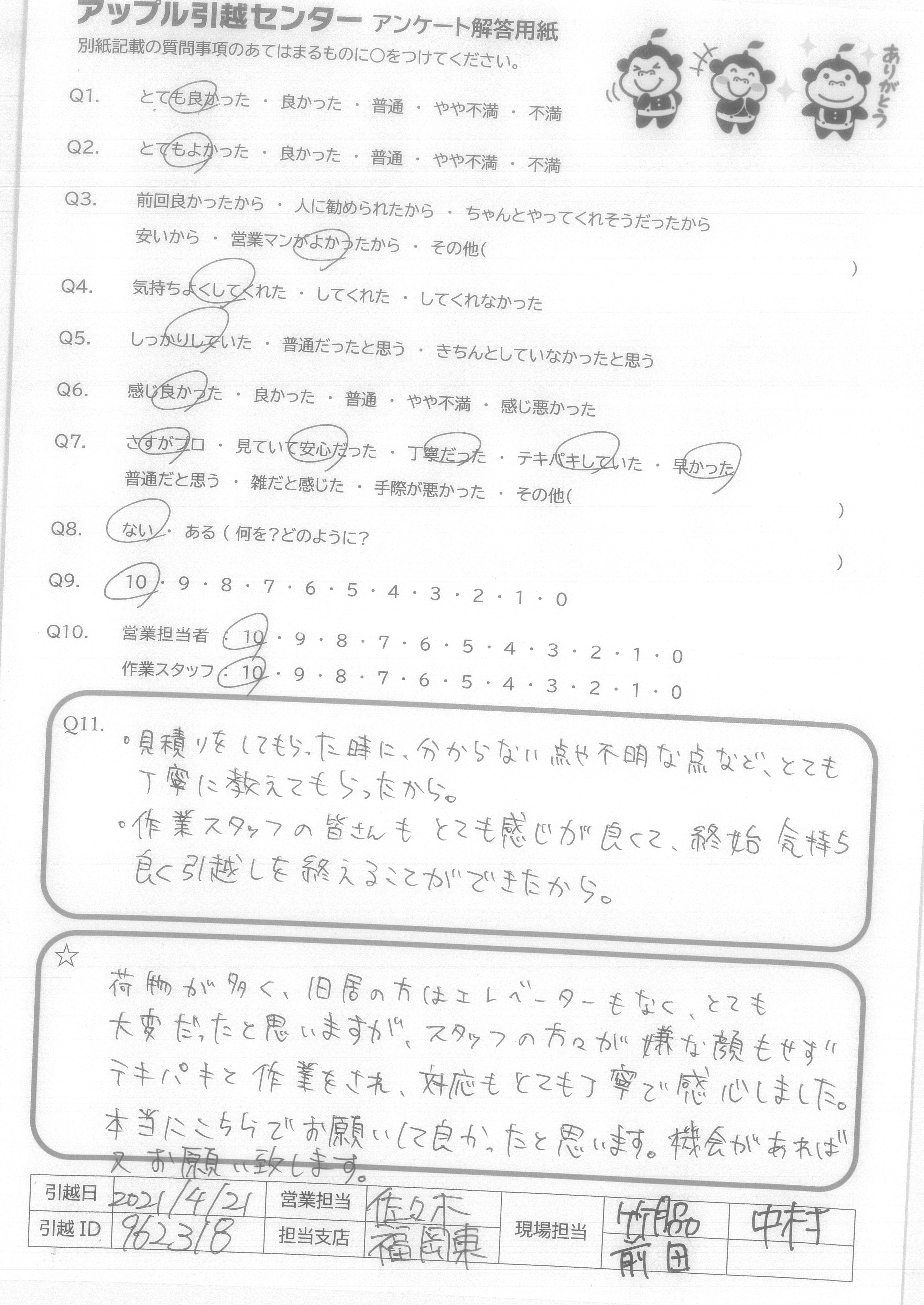 A.見積もりをしてくださった方も、引っ越しの作業員の方も、丁寧な言葉遣いとテキパキとした仕事ぷりが気持ちよかったから。