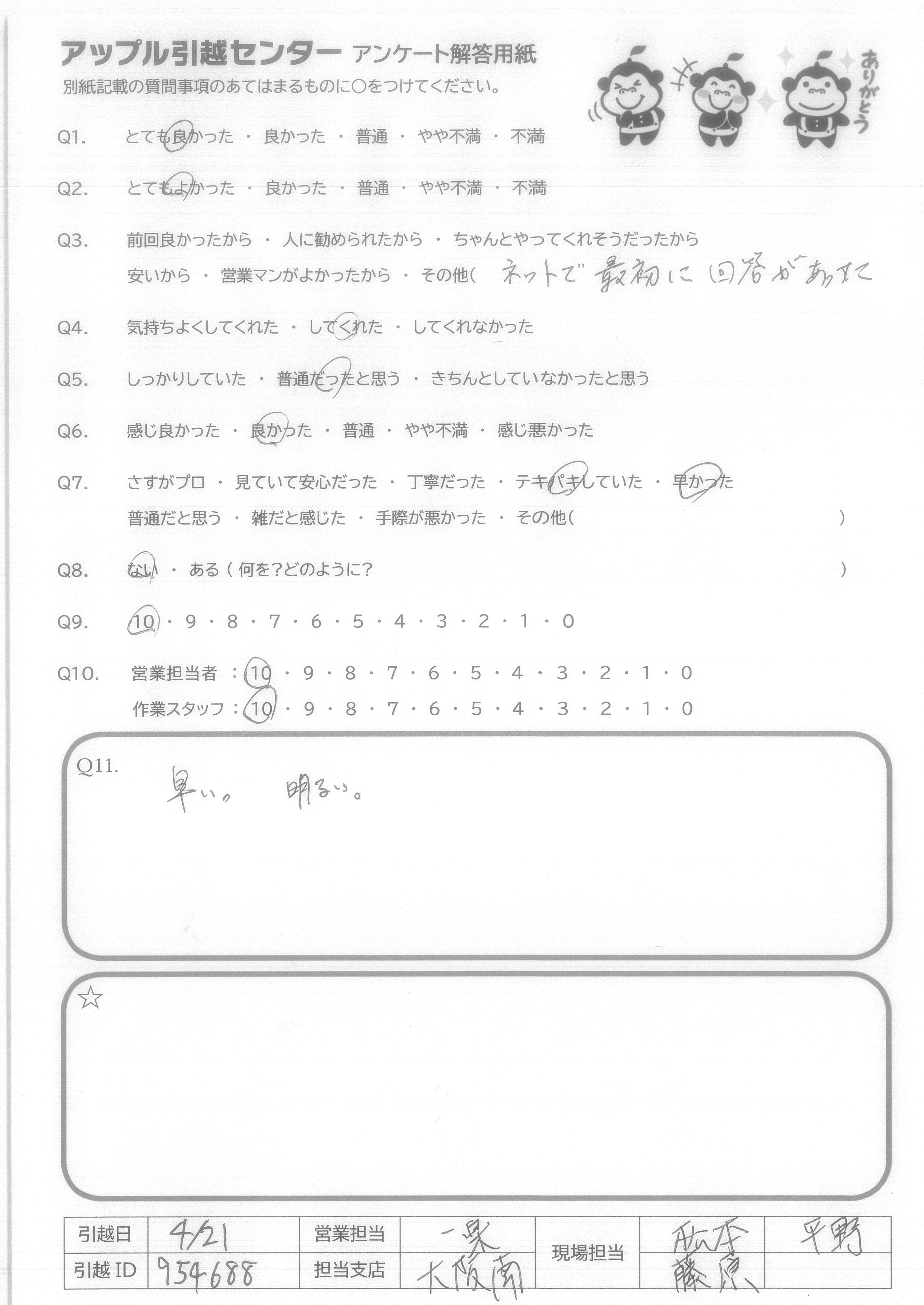 引越し日:2021年04月20日 エリア:大阪府大阪市城東区