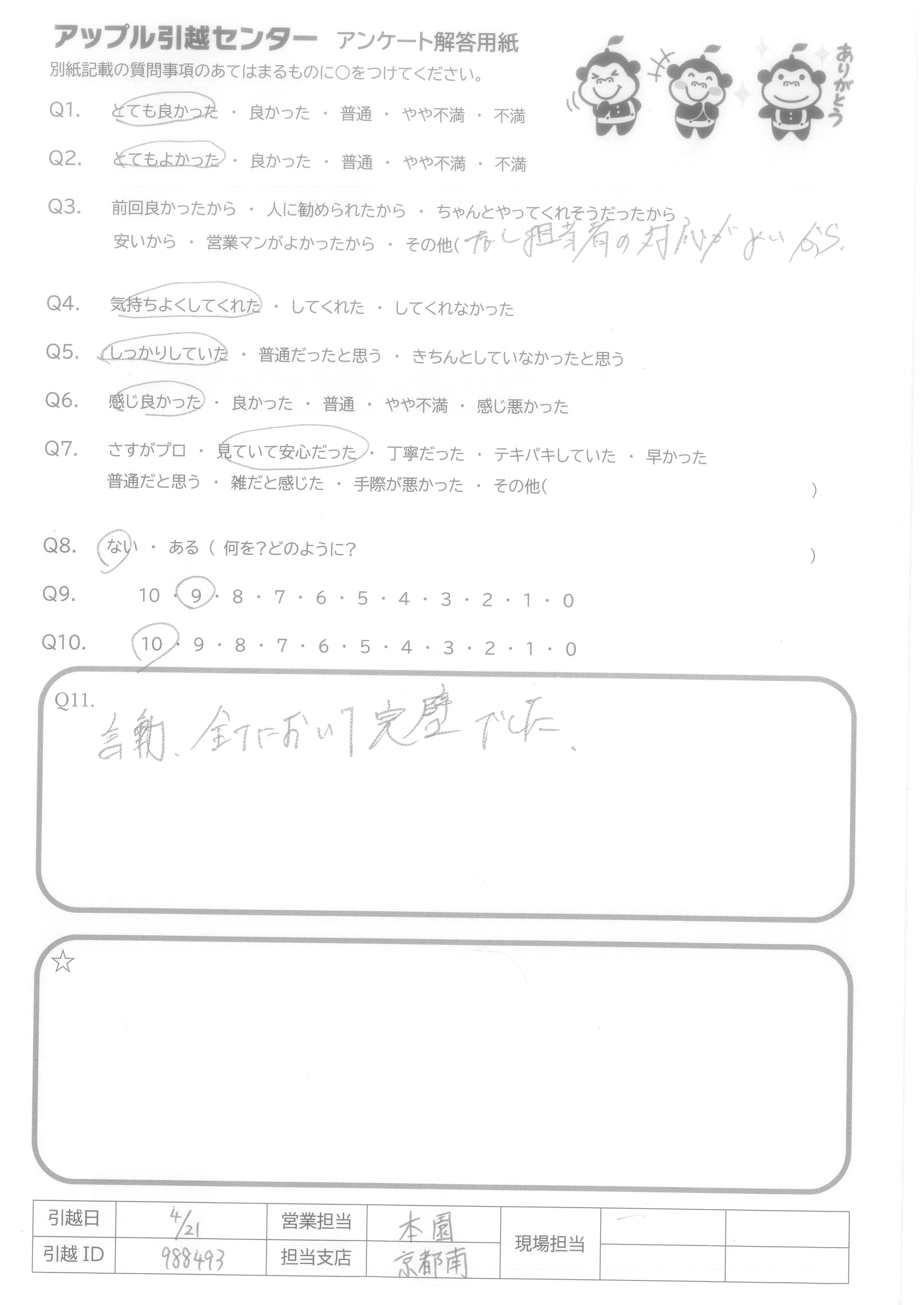 A.荷物が多く、旧居の方はエレベーターもなく、とても大変だったと思いますが、スタッフの方々が嫌な顔もせずテキパキと作業をされ、対応もとても丁寧で感心しました。 本当にこちらでお願いして良かったと思います。機会があれば又お願い致します。