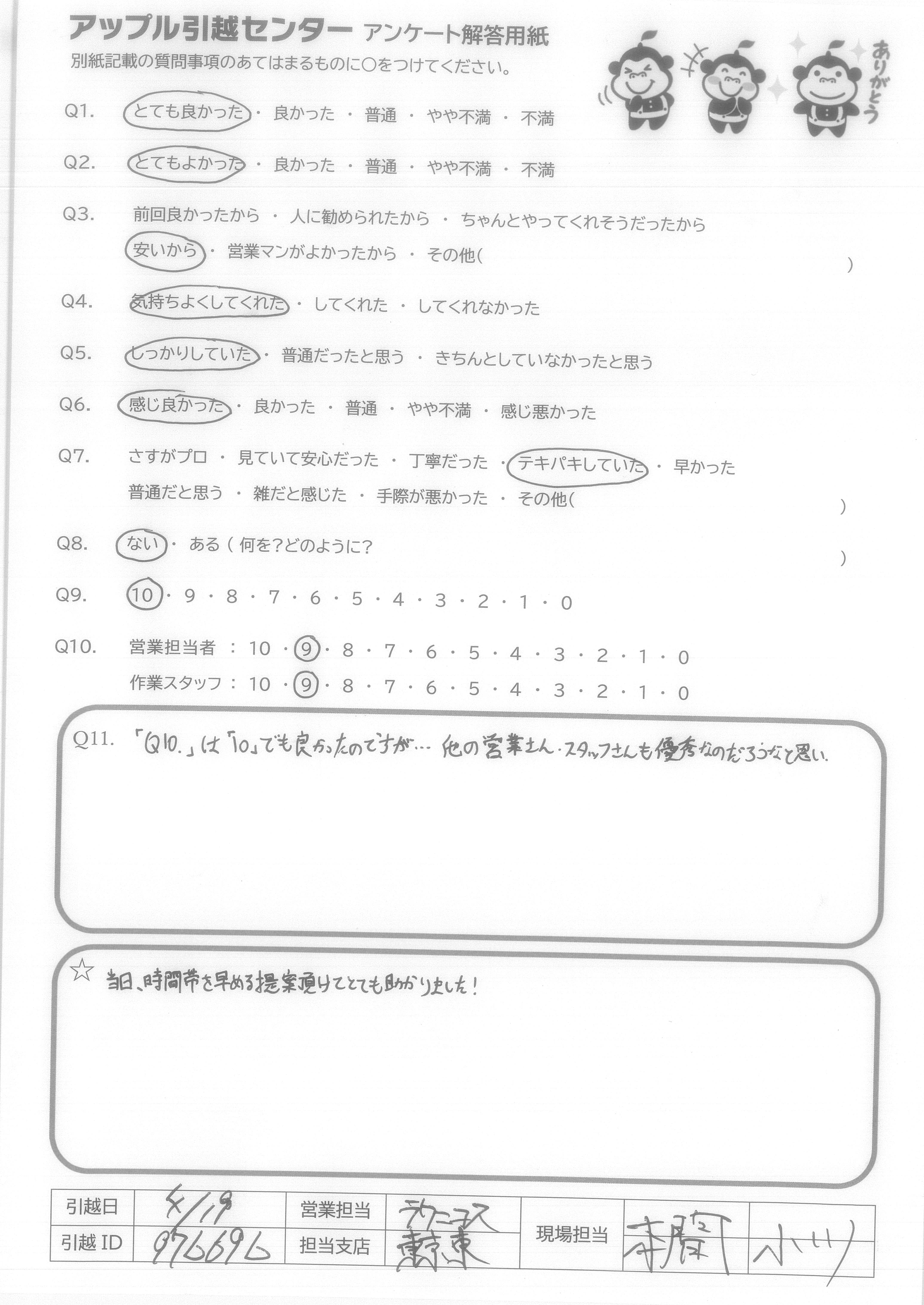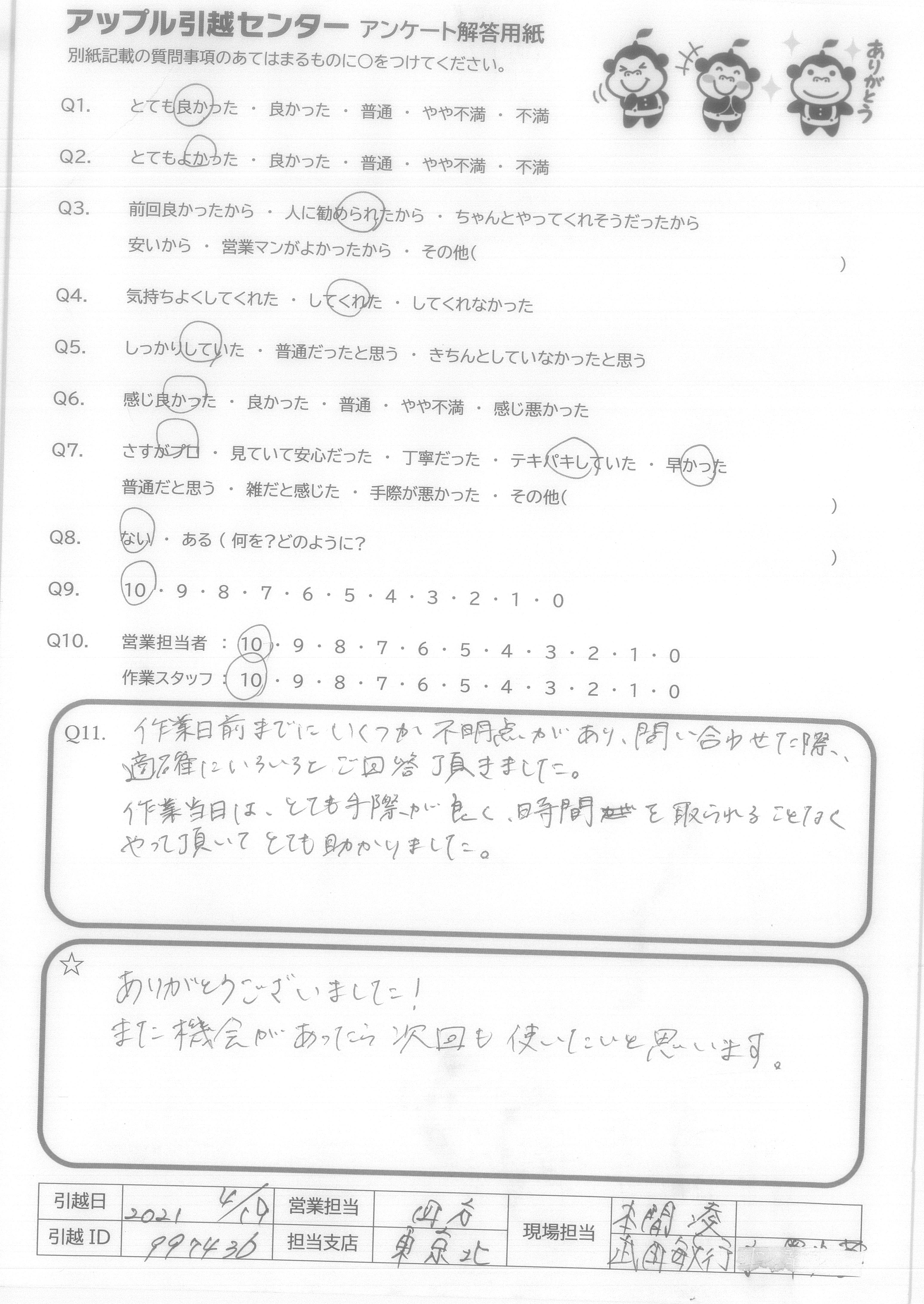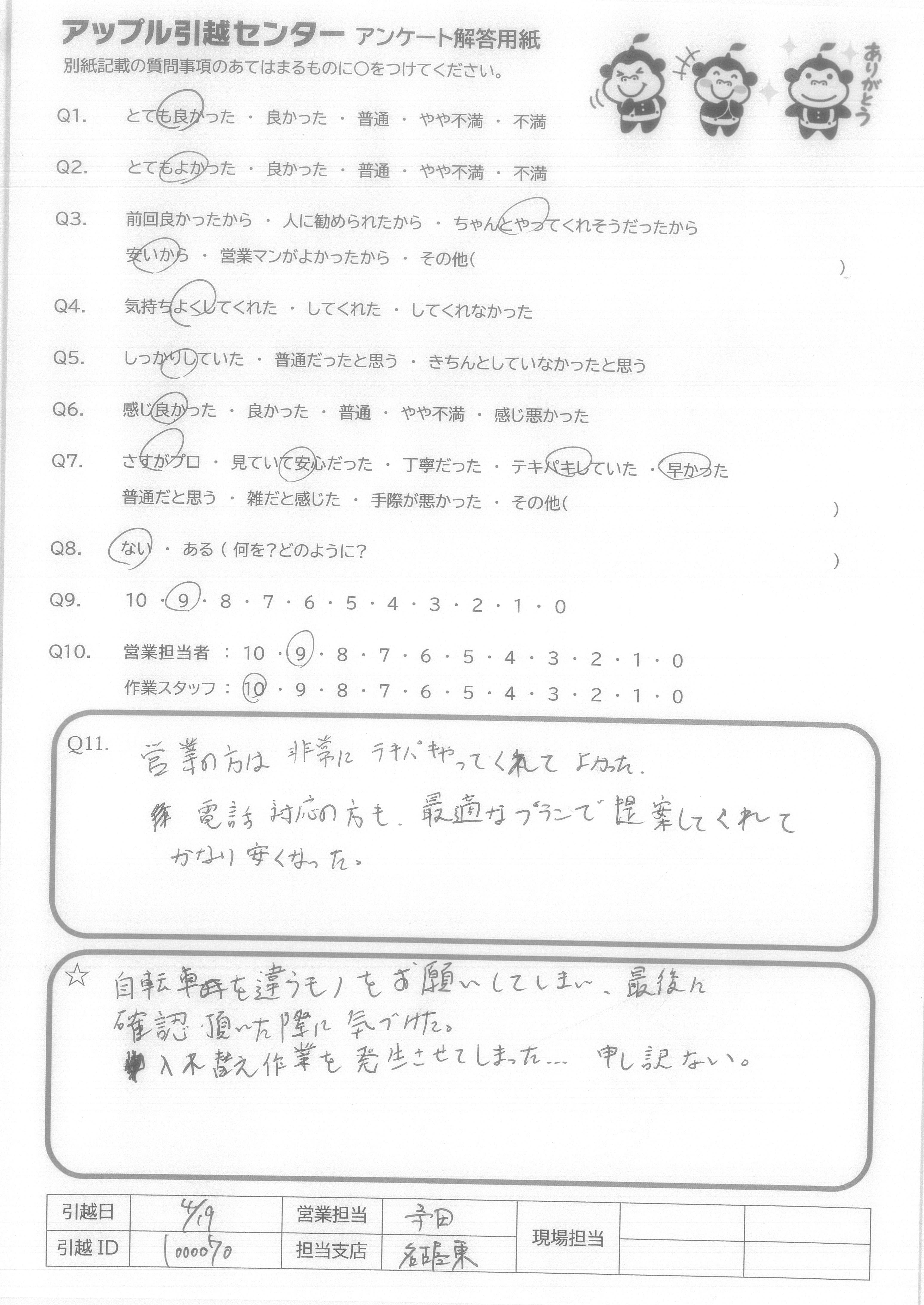 A.縁あって3回目の利用になります。この度もありがとうございました。引越しは何度もしていますがさすがに業者なのでどこも早くて丁寧だと思っています。なので印象というのはスタッフ次第という感じもします。愛想のよいスタッフでもいいしあまり説明せず静かにやってくれる方でも私は良いのでいつも満足しています。それとアップルさんは面倒に感じる訪問見積もりや電話応対がなくそこが素晴らしいと思います。また頼むことあればよろしくお願いいたします。 追伸:りんごり君可愛くて好きですが、ぬいぐるみは前回頂いたので別の方にお渡しください。今も大切にしております。