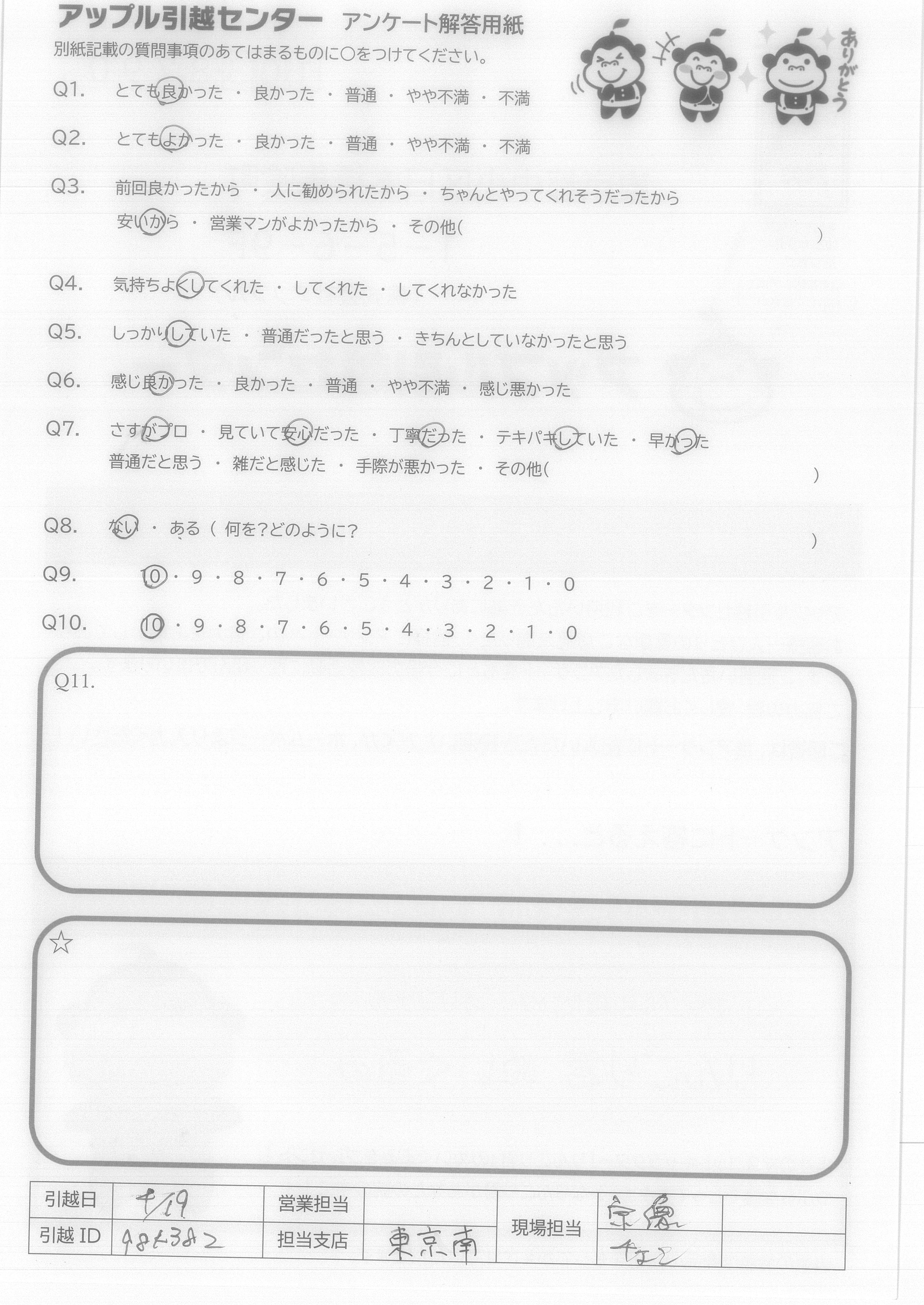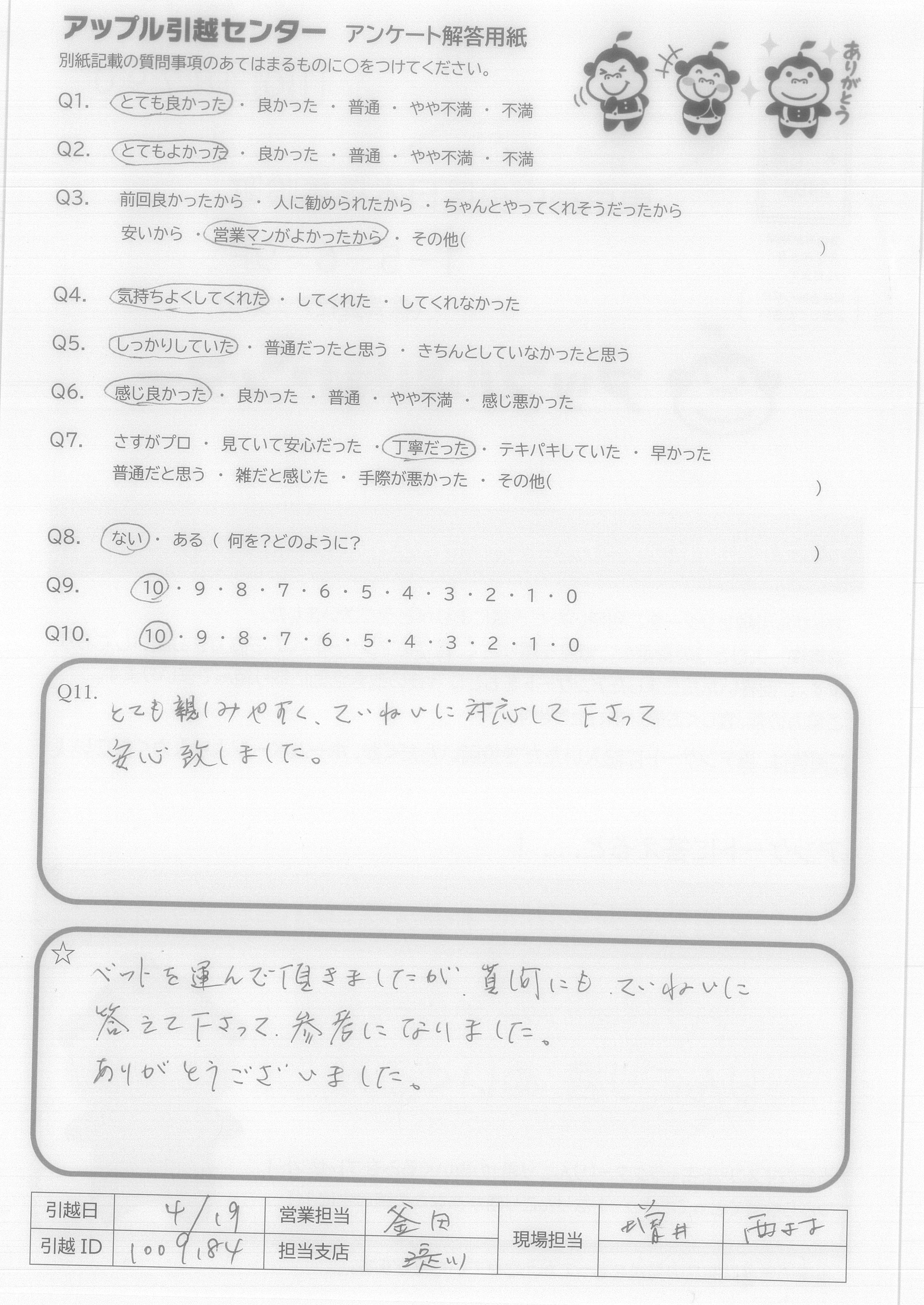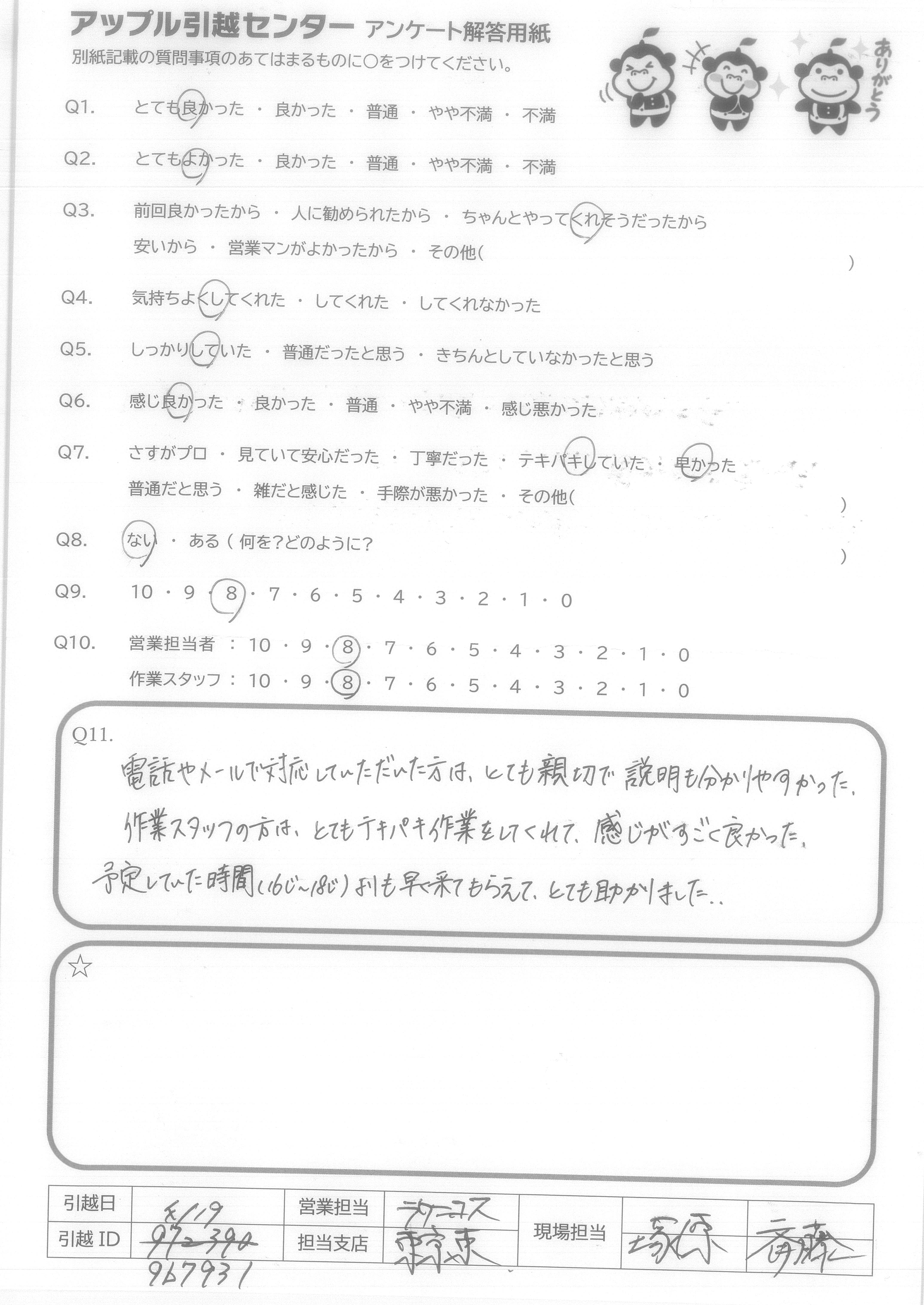 A.縁あって3回目の利用になります。この度もありがとうございました。引越しは何度もしていますがさすがに業者なのでどこも早くて丁寧だと思っています。なので印象というのはスタッフ次第という感じもします。愛想のよいスタッフでもいいしあまり説明せず静かにやってくれる方でも私は良いのでいつも満足しています。それとアップルさんは面倒に感じる訪問見積もりや電話応対がなくそこが素晴らしいと思います。また頼むことあればよろしくお願いいたします。 追伸:りんごり君可愛くて好きですが、ぬいぐるみは前回頂いたので別の方にお渡しください。今も大切にしております。