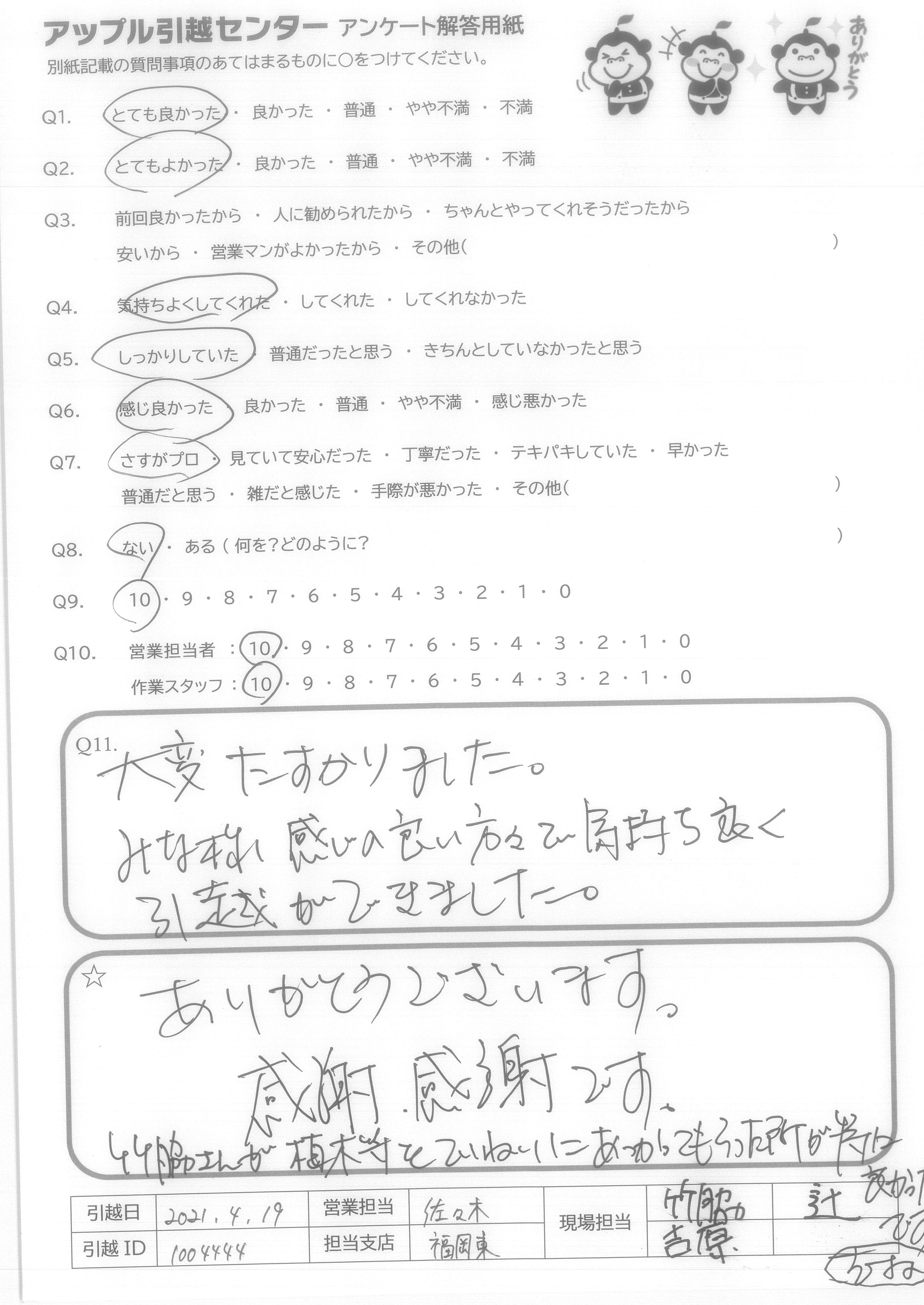 引越し日:2021年04月19日 エリア:福岡県福岡市早良区