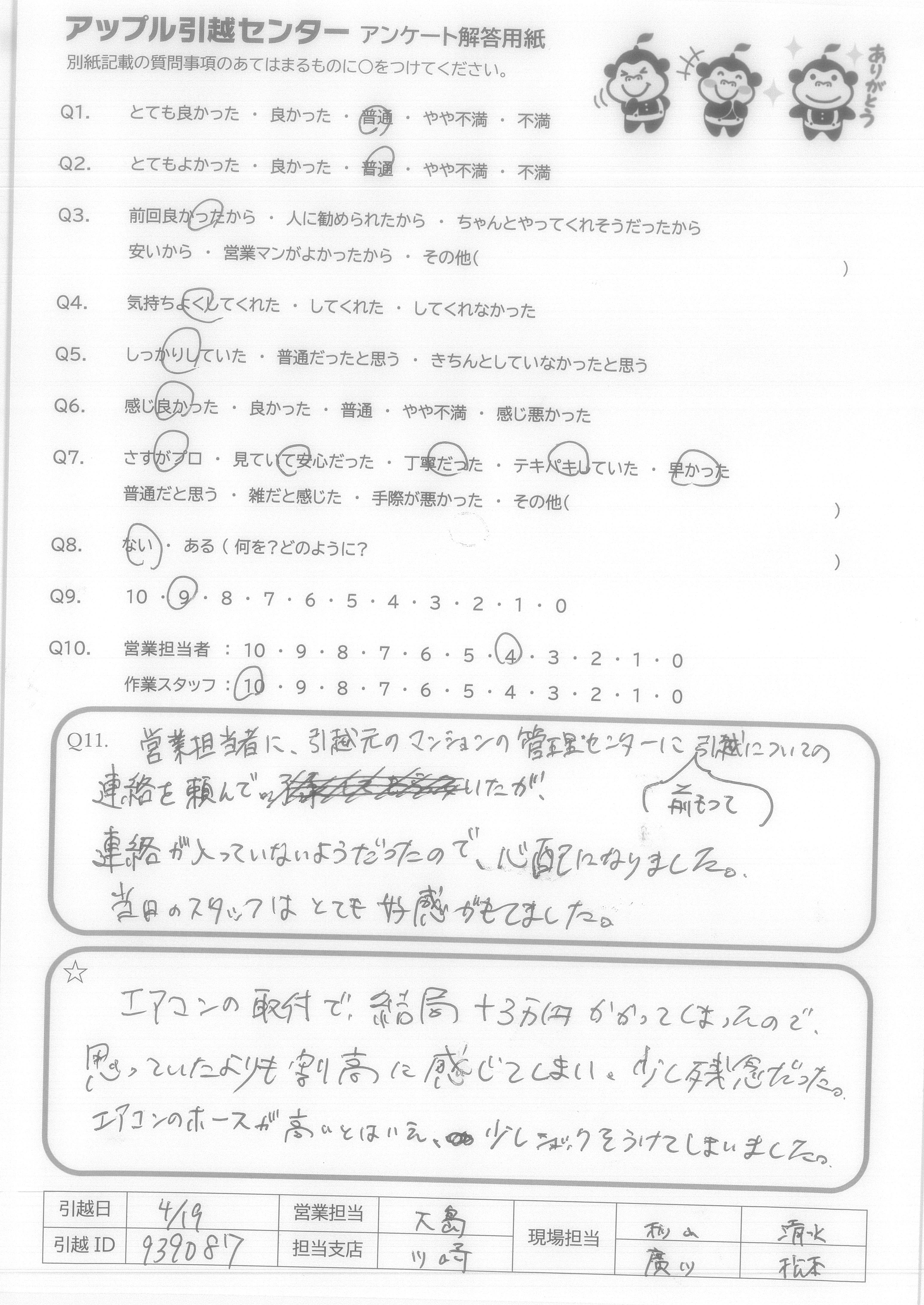 A.営業担当者に、引越元のマンションの管理センターに前もって引越についての連絡を頼んでいたが、連絡が入っていないようだったので、心配になりました。 当日のスタッフはとても好感がもてました。