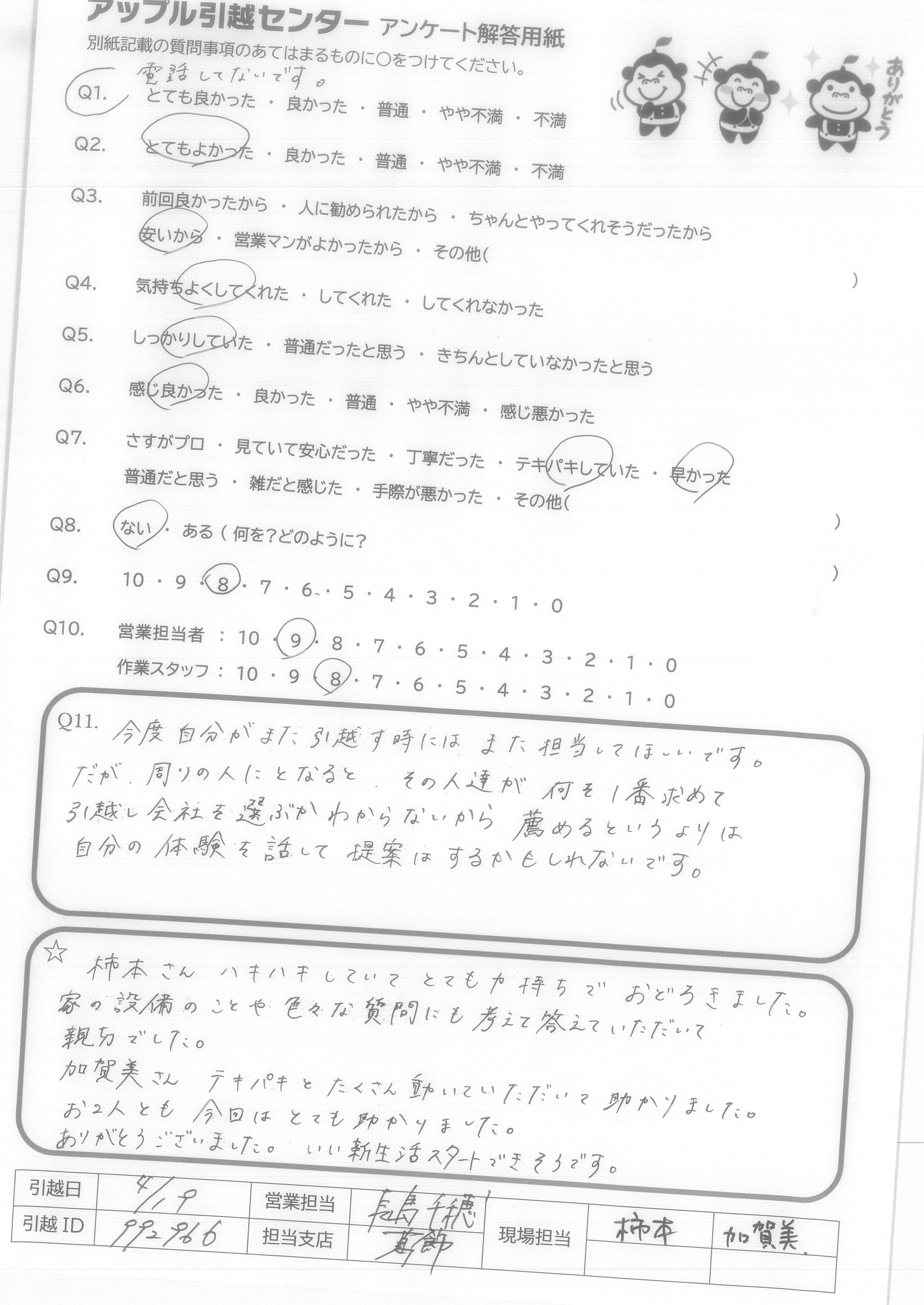A.柿本さんハキハキしていてとても力持ちでおどろきました。家の設備のことや色々な質問にも考えて答えていただいて親切でした。 加賀美さんテキパキとたくさん動いていただいて助かりました。 お2人とも今回はとても助かりました。 ありがとうございました。いい新生活スタートできそうです。