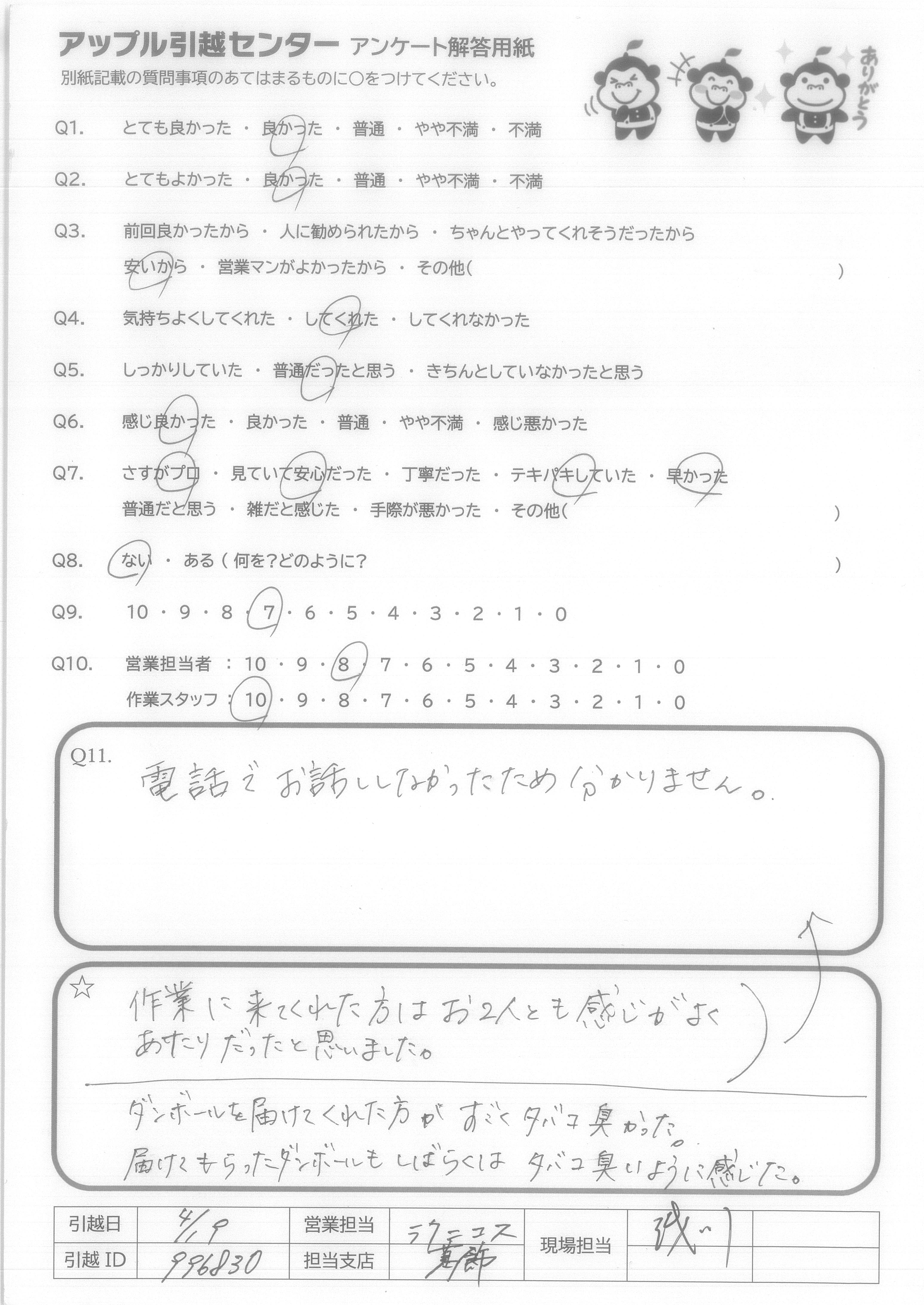 A.電話での応対が丁寧でした。作業スタッフの方の仕事もすばやく、応対もやさしくてよかったのですが、スピード重視なのか段ボールを転げてしまったりワレモノ段ボールを積み重ねて運んでいるのをみてすこしヒヤッとしました。しかし引越し代金が安いので値段相応かなと思います。