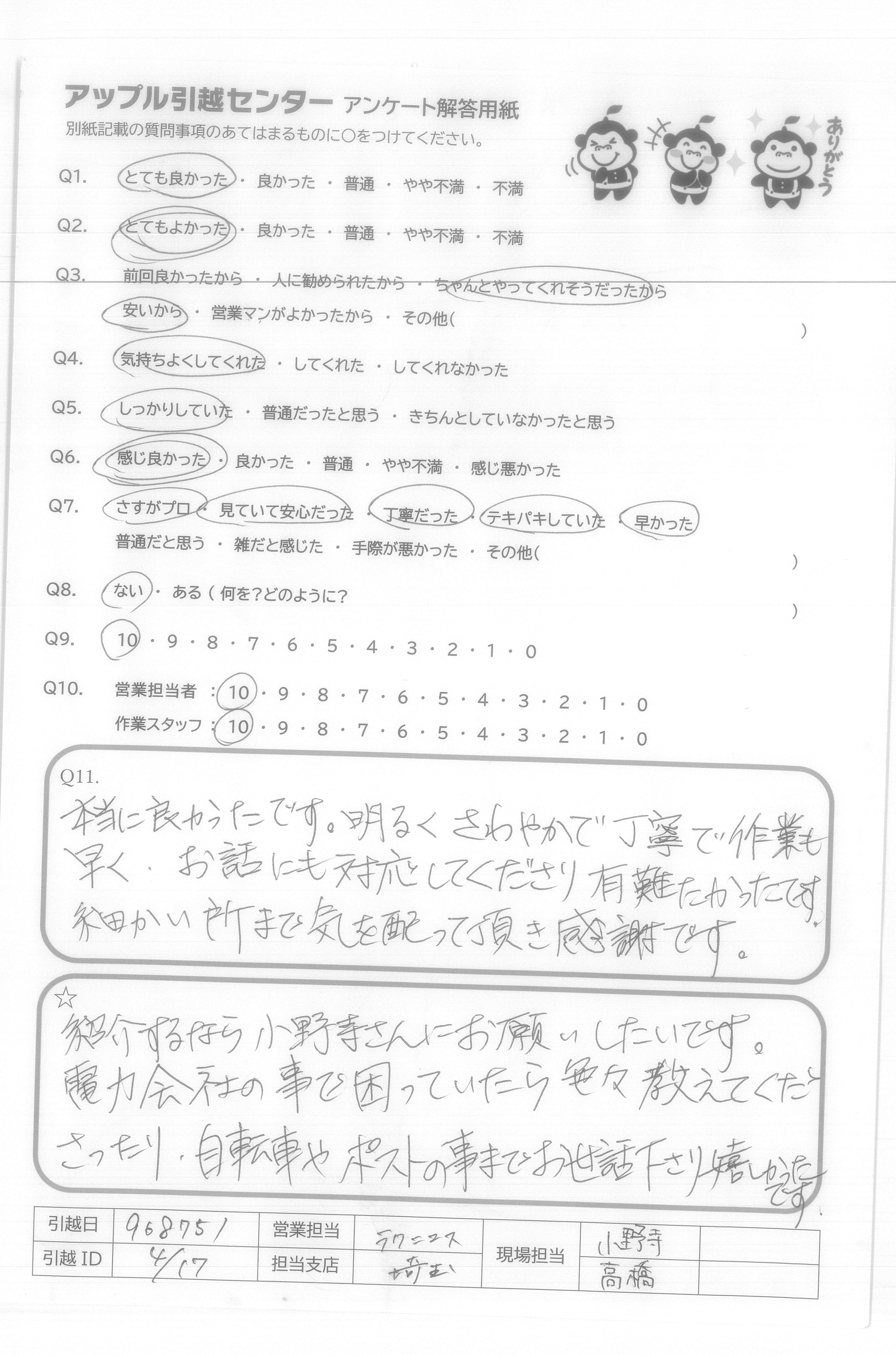 A.この度はお世話になりありがとうございました。階段が多く御苦労おかけしたと思いますが、最後まで爽やかに気持ち良く対応して頂きました。 また機会があれば是非よろしくお願いします。