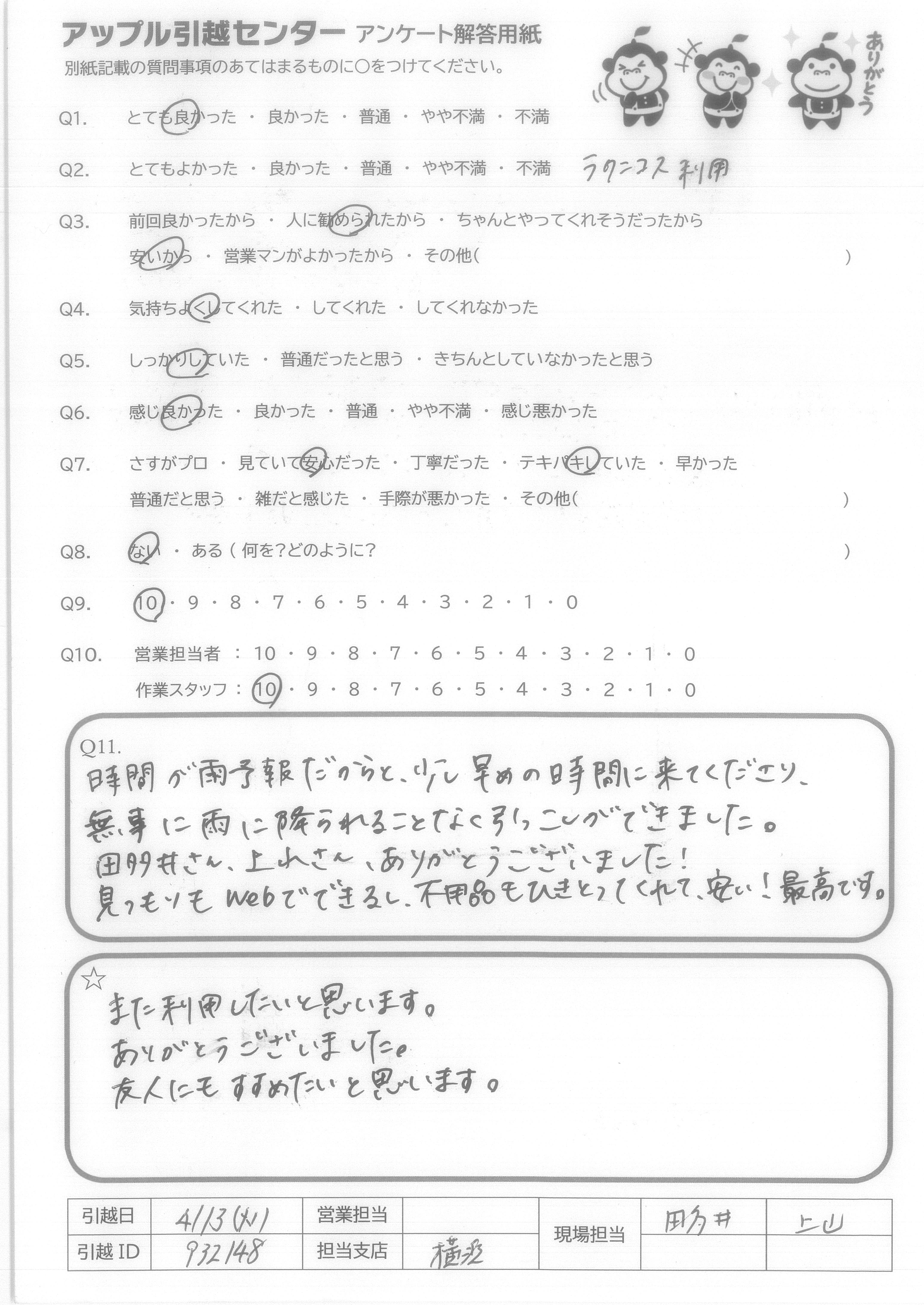 A.時間が雨予報だからと、少し早めの時間に来てくださり、無事に雨に降られることなく引っこしができました。 田多井さん、上山さん、ありがとうございました! 見つもりもWeb上でできるし、不用品もひきとってくれて、安い!最高です。