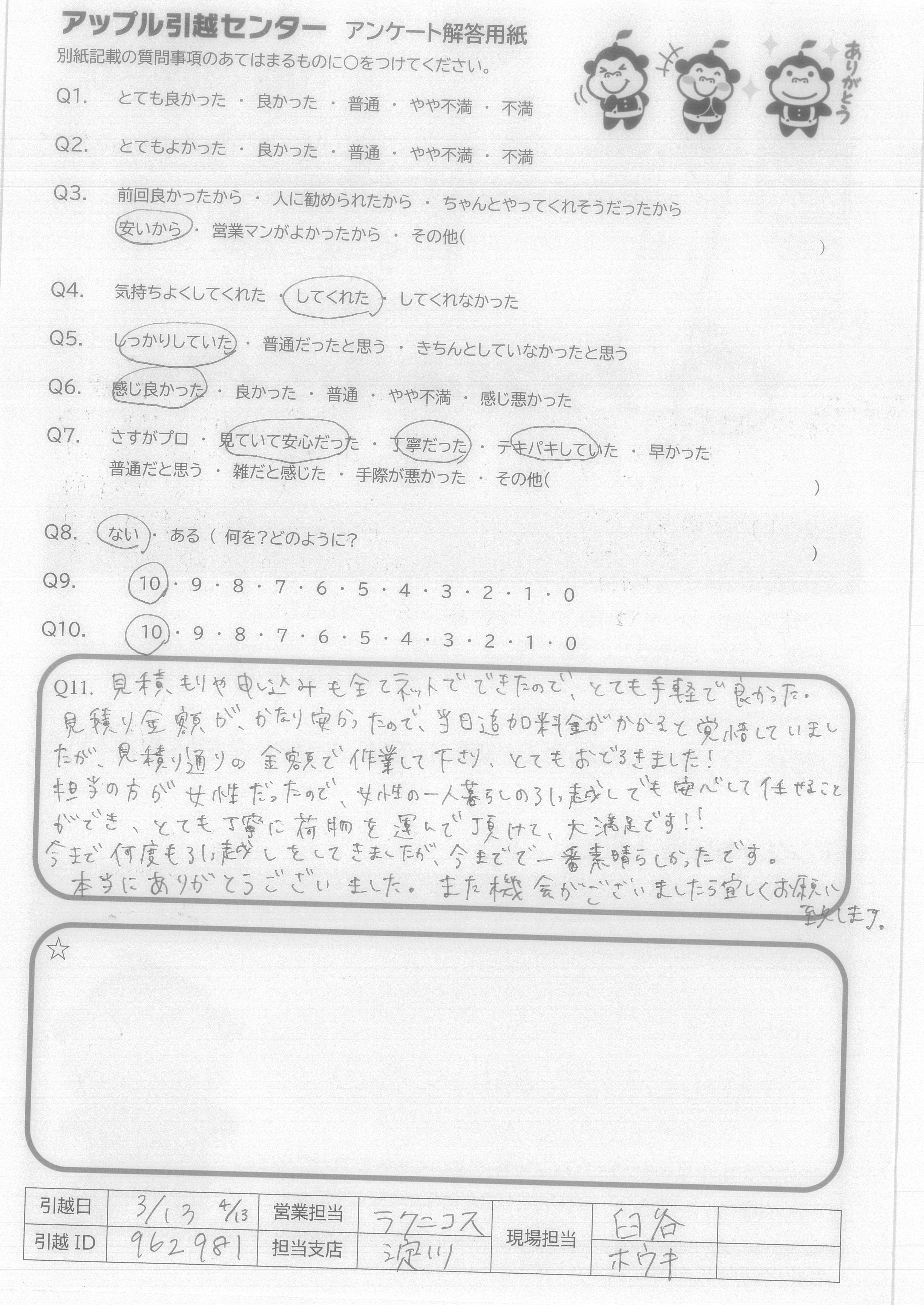 A.トラックへの搬入が凄く早く、営業担当者に聞いていた時間より、何分位で出来るか聞いていたよりも遥かに作業が早かった為、立会人に時間変更の電話をする程であった。前回の、作業スタッフさんは、ワンルームへの引越について、狭い方が楽ですよ、と、感情を察していたわってくださったのを憶えています。今回は、築50年のボロい家でビックリしますよといったら、じゃ僕らも期待しますと仰ってたが,私自身ボロはやはり嫌なので、期待という言葉ではなく、それなりにいい事があるんですよねー位の言葉が少し欲しかったかな?と思いました。でも、最後、僕らが出来る事はありますか?と仰っ下さり、電気の移動2箇所や、洗濯機水道の蛇口の調整までして頂きました。引越先の道が抜け道で、車が行き来が多かったにも関わらず気持ち良く最後まで仕事をして頂き大変ありがたかったです。アップルさんは娘の引越もやって頂いているので今回で3度目です。他のどの引越業者さんよりもお安くアップルさんは最高だと思います♪