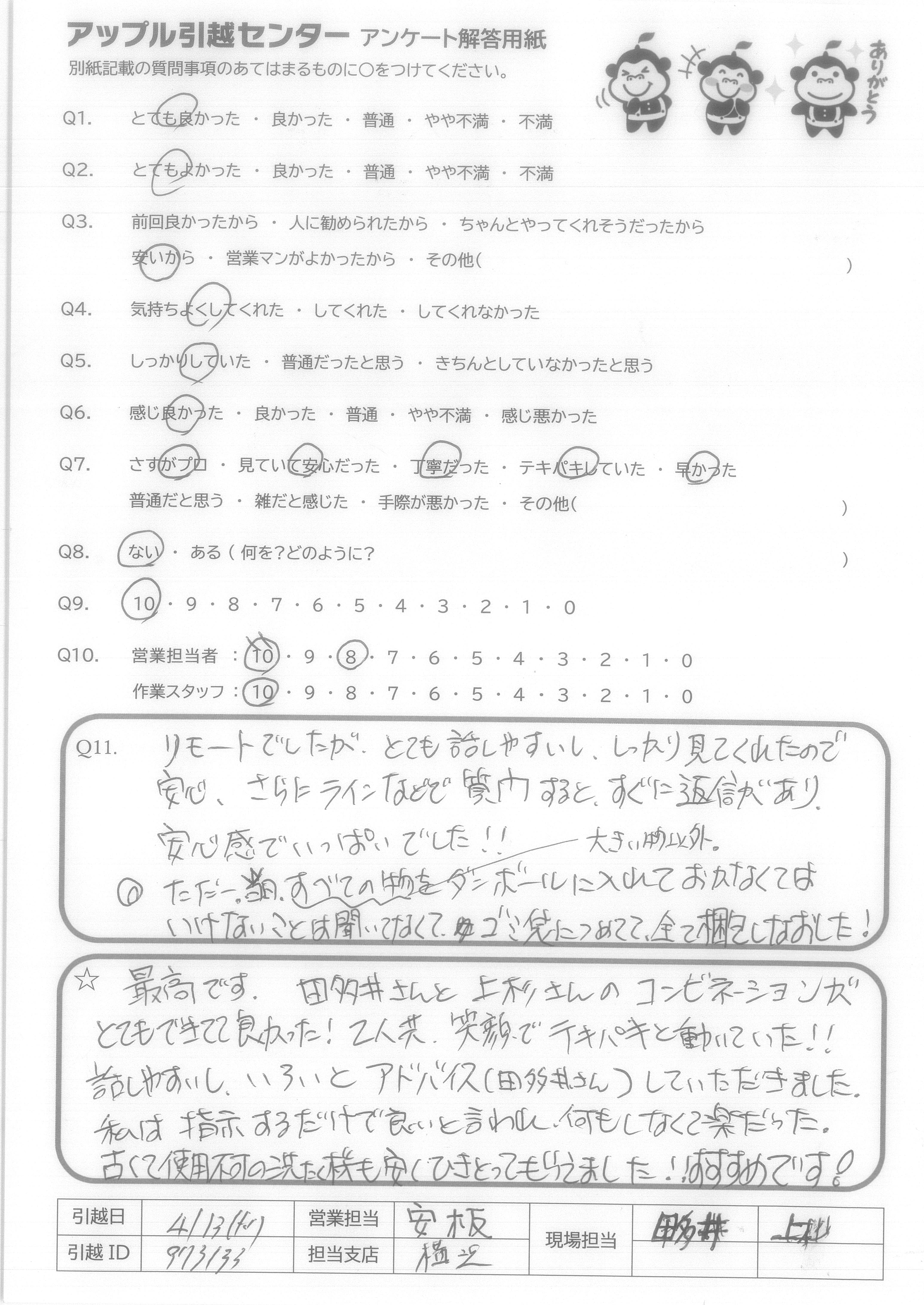 A.この度はお世話になり有り難うございました。 電話での問い合わせからスタートし、お電話対応、営業の方、引っ越しスタッフの方、気持ちの良い対応で、とても感謝しています。 処分する家具をバラしてゴミ捨て場まで嫌な顔せずに運んでいただき感謝しています。 盗聴器のチェックサービスも安心できるので良かったです。 段ボール箱の回収サービスも有り難いです。 次回も引っ越しの際にはリピートしたいと思います。 有り難うございました。