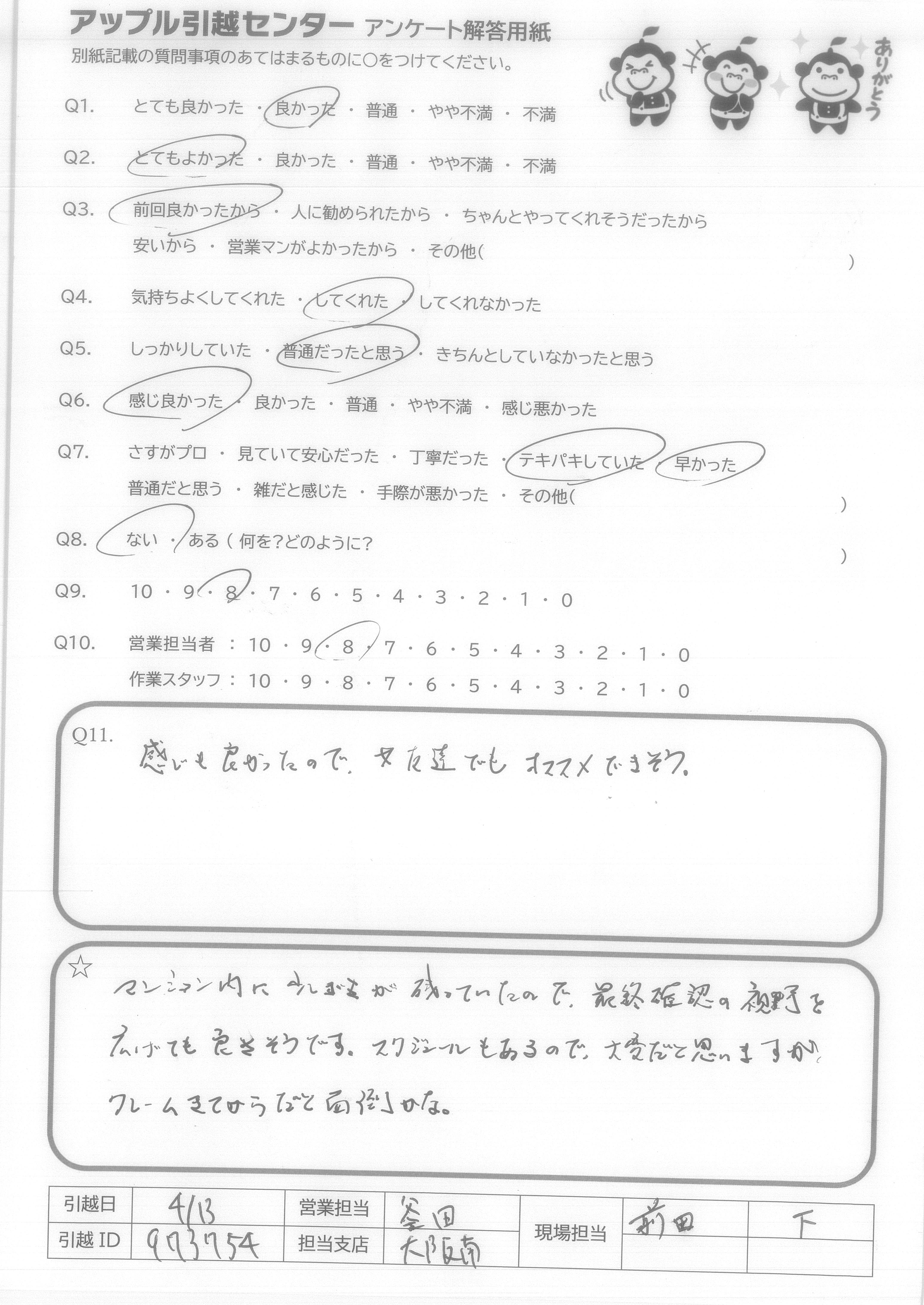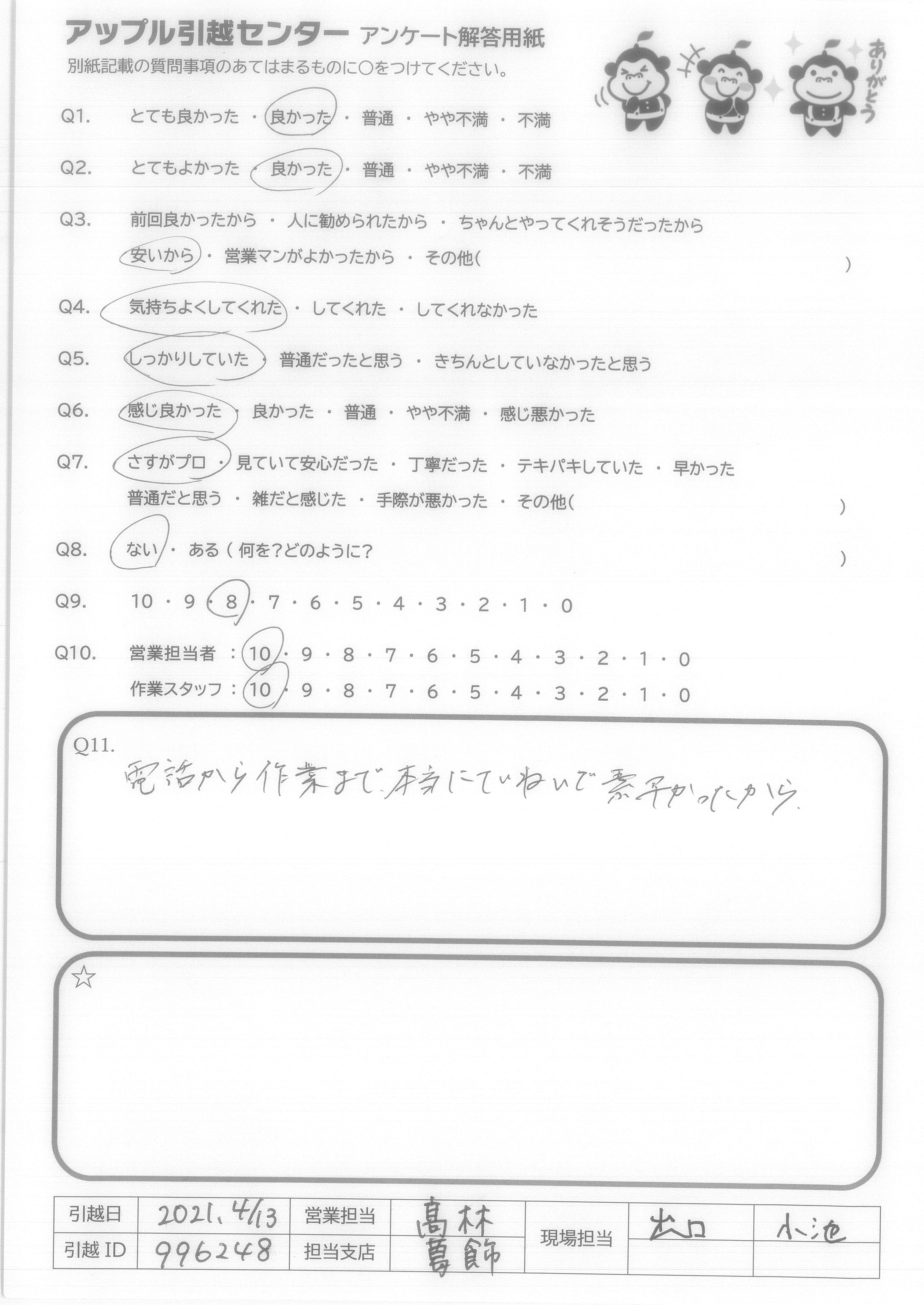 A.一番初めのお電話の対応(オオツキ様)もよく、その後お尋ねしたいことについて数回お電話でお尋ねしていますが、どなたもスムーズな対応でした。 今回は他社で相見積もりをしましたが営業のシマタニ様だけがスーツという服装だった事、見積もりを速やか弾き出すという事、依頼するか否か分からないにも関わらずお引越しに関する丁寧な、参考になるパンフレットをいただいたという事、価格も安価だった事など 複数の理由で貴社に依頼することに決めました。 引っ越し作業も速やかに、丁寧に作業を行っていただき大変ありがたく思っています。