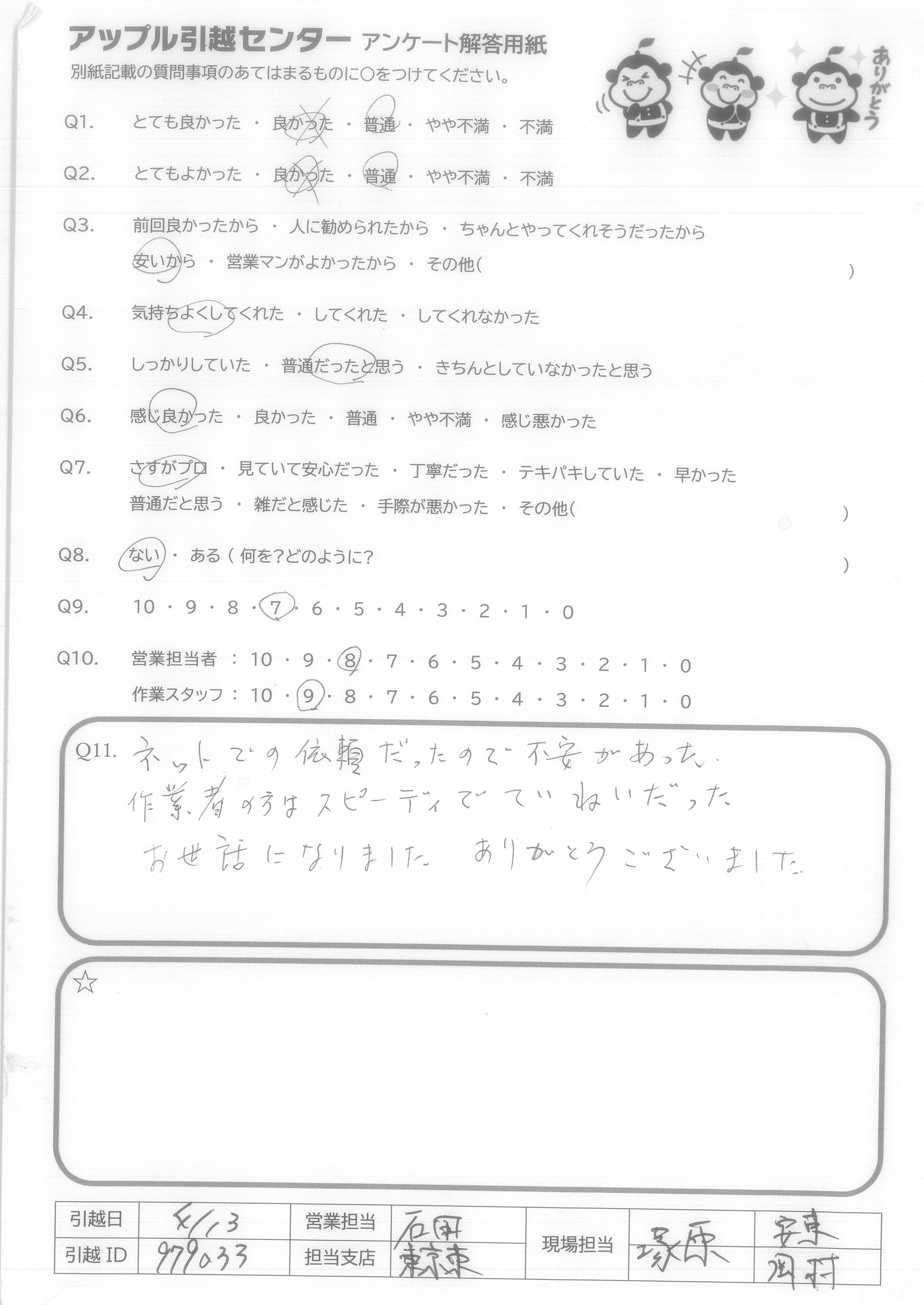 A.見積もりや申し込みを全てネットでできたので、とても手軽で良かった。 見積り金額がかなり安かったので、当日追加料金がかかると覚悟していましたが、見積り通りの金額で作業して下さり、とてもおどろきました! 担当の方が女性だったので、女性の一人暮らしの引っ越しでも安心して任せることができ、とても丁寧に荷物を運んで頂けて、大満足です!! 今まで何度も引っ越しをしてきましたが、今までで一番素晴らしかったです。 本当にありがとうございました。また機会がございましたら宜しくお願い致します。