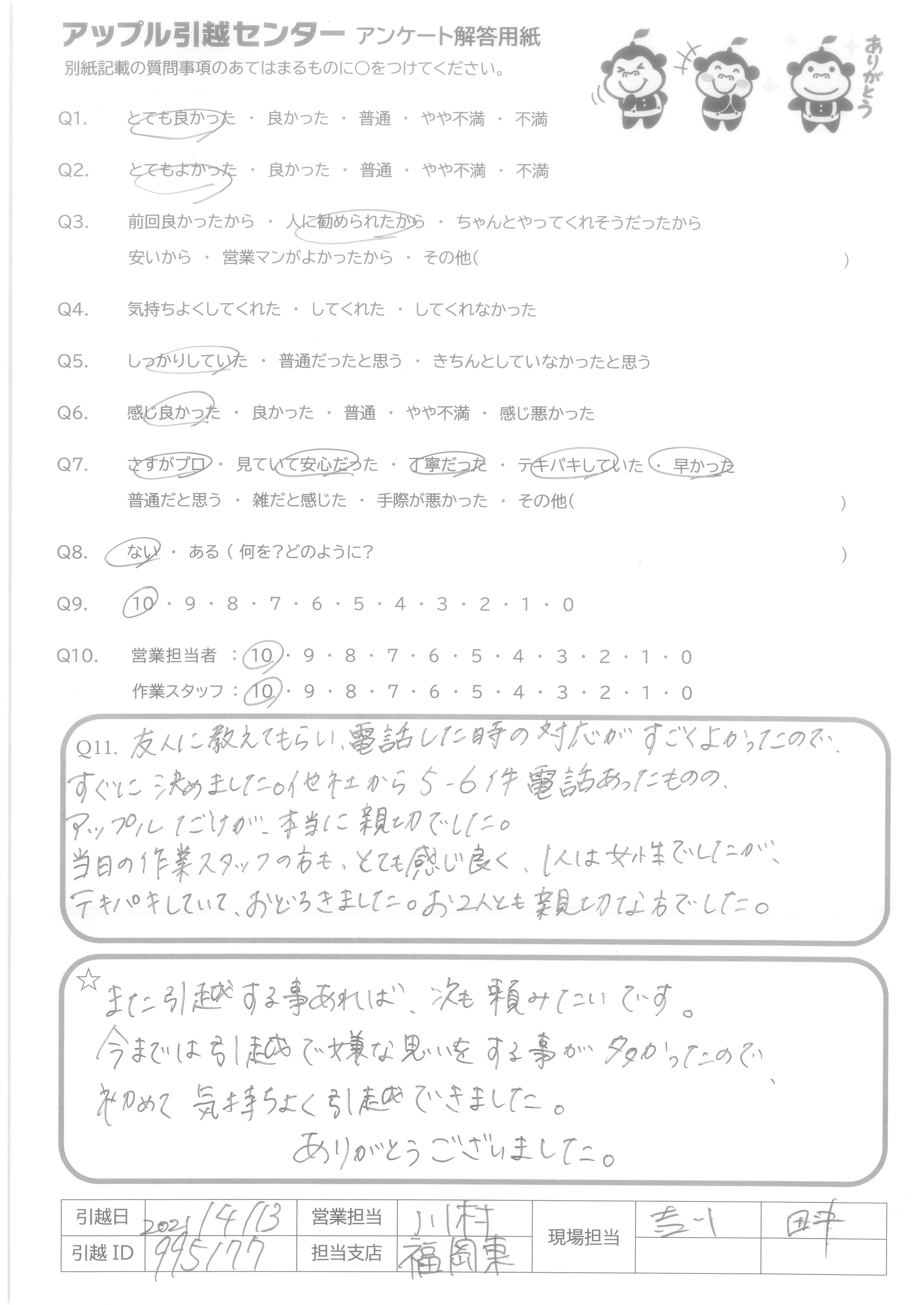 A.友人に教えてもらい、電話した時の対応がすごくよかったので、すぐに決めました。他社から5-6件電話あったものの、アップルだけが、本当に親切でした。 当日の作業スタッフの方も、とても感じ良く、1人は女性でしたが、テキパキしていて、おどろきました。お2人とも親切な方でした。