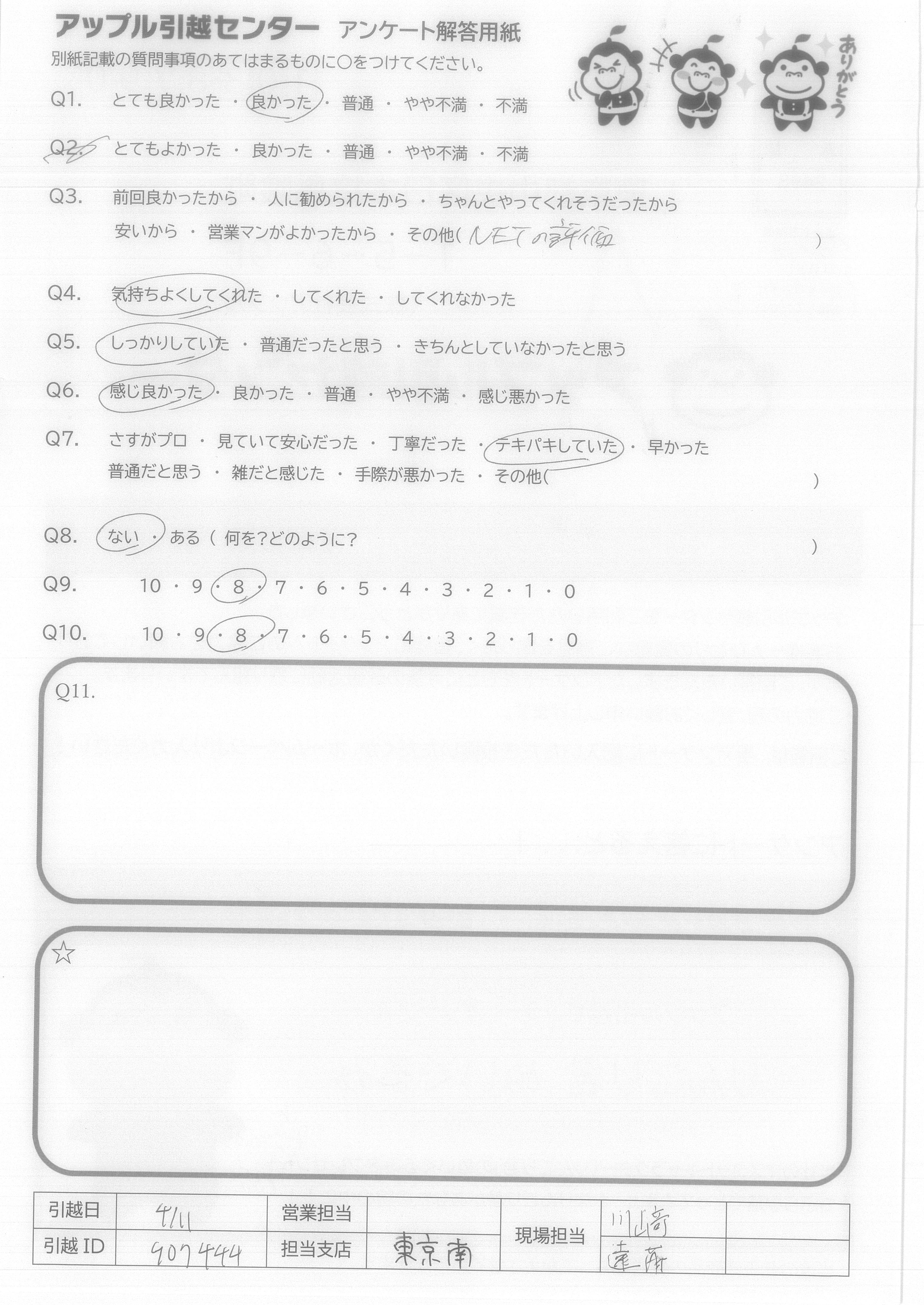 A.11日池上で、青木さん率いる3名の方にお世話になりました。荷物は少なかったものの、一つだけ大きな洋服タンスが新居の廊下を曲がることができませんでした。後の家具の強度も考えて、組み立てを崩さず、一階でしたので、裏の庭まで運んでくださり、庭から入れてくださりました。物件と客の荷物を臨機応変に判断されており、みなさんのプロの仕事ぶりと人柄に感動しました。自分もまた引越しがありましたら、ぜひお世話になりたいですし、知り合いにもおすすめしたいです。これからも素晴らしい引越し業者さまであり続けてください。ありがとうございました。
