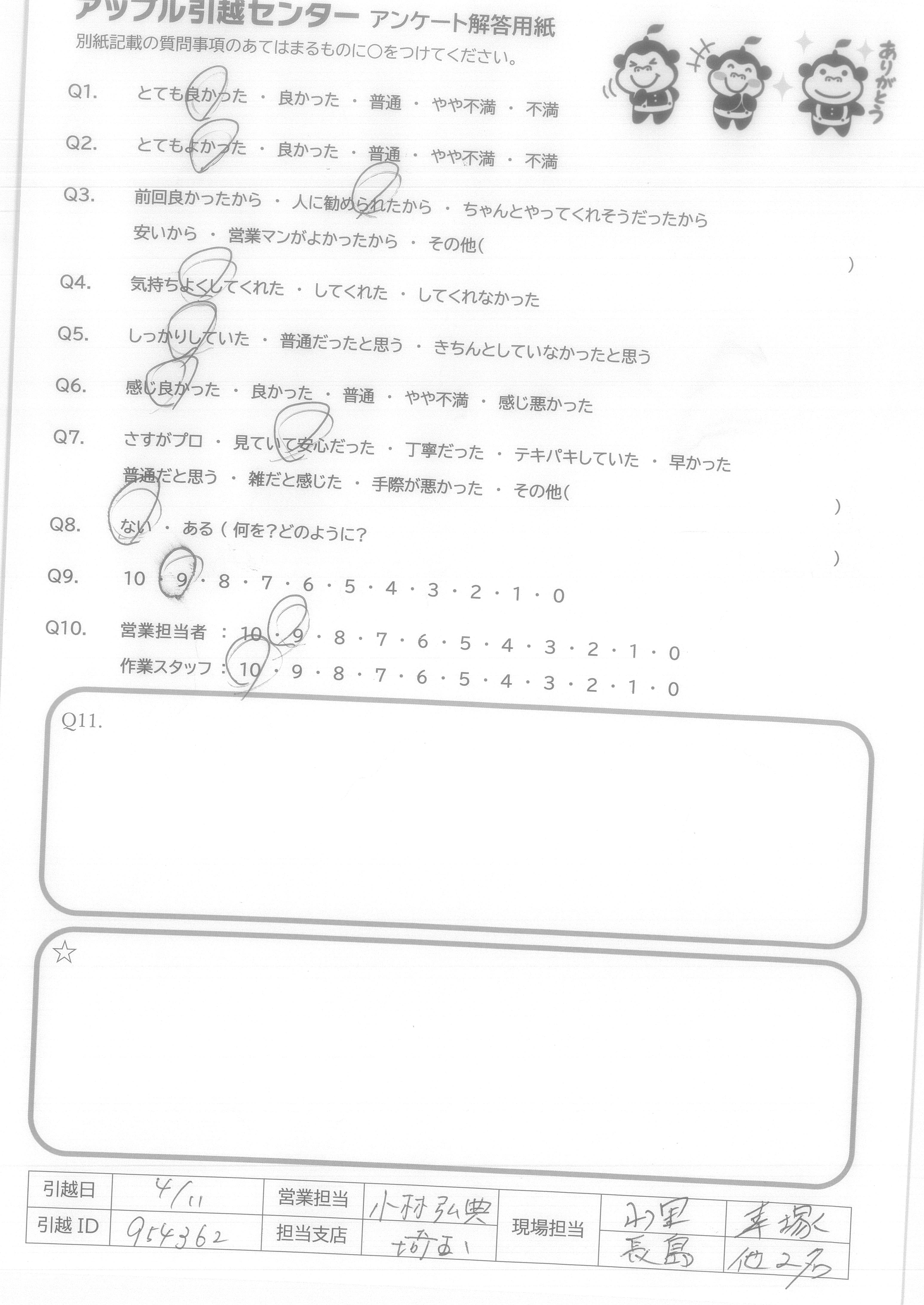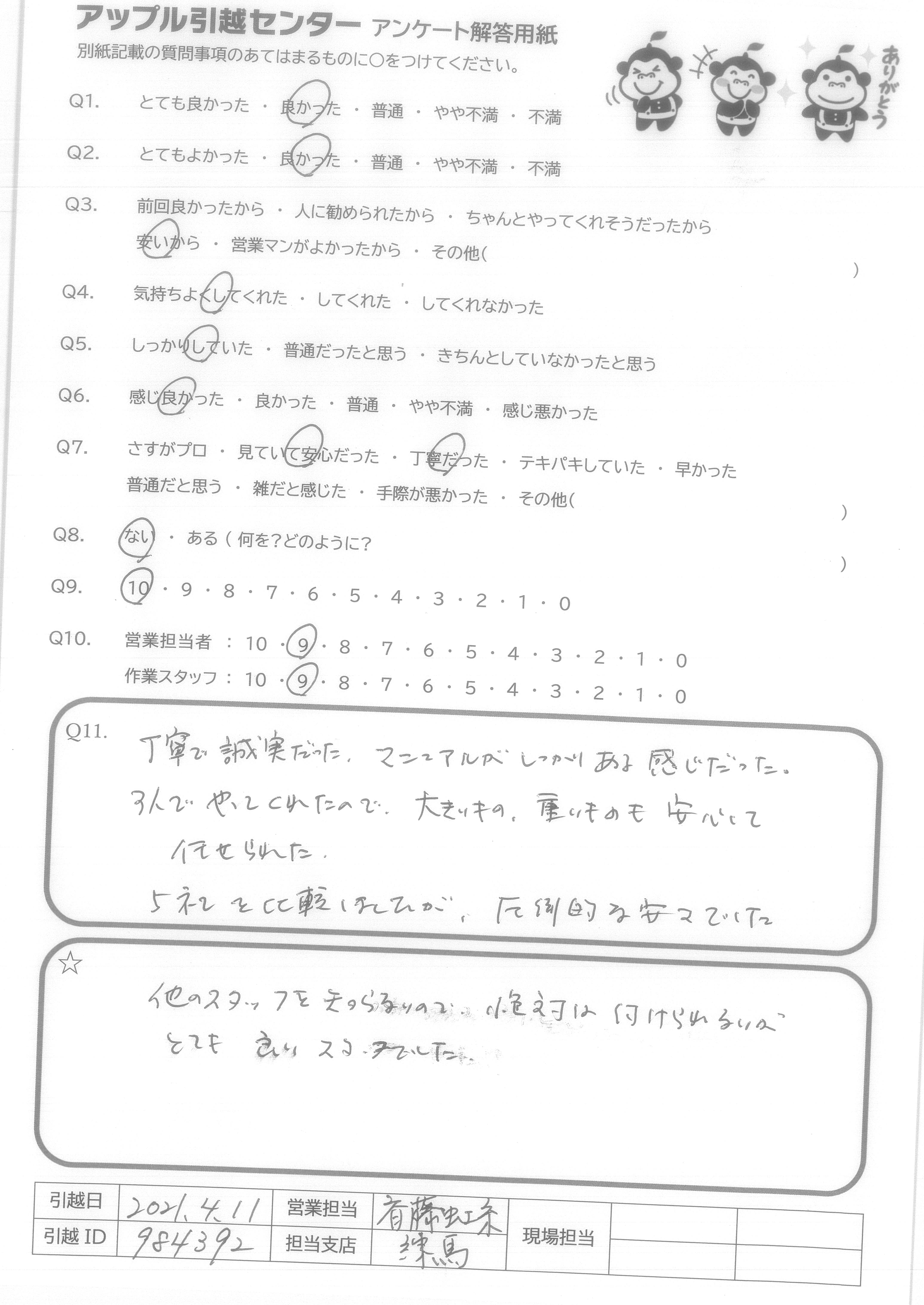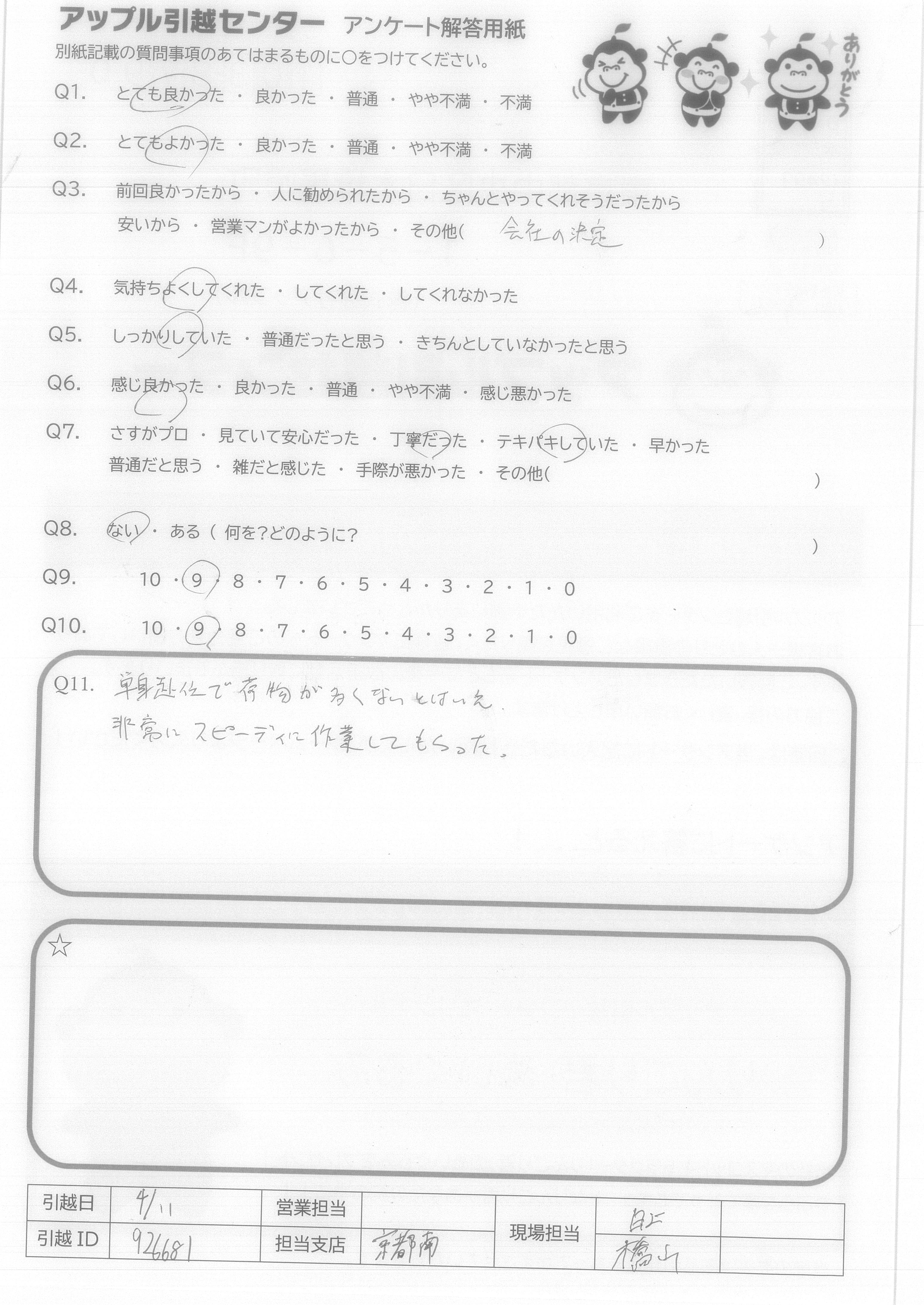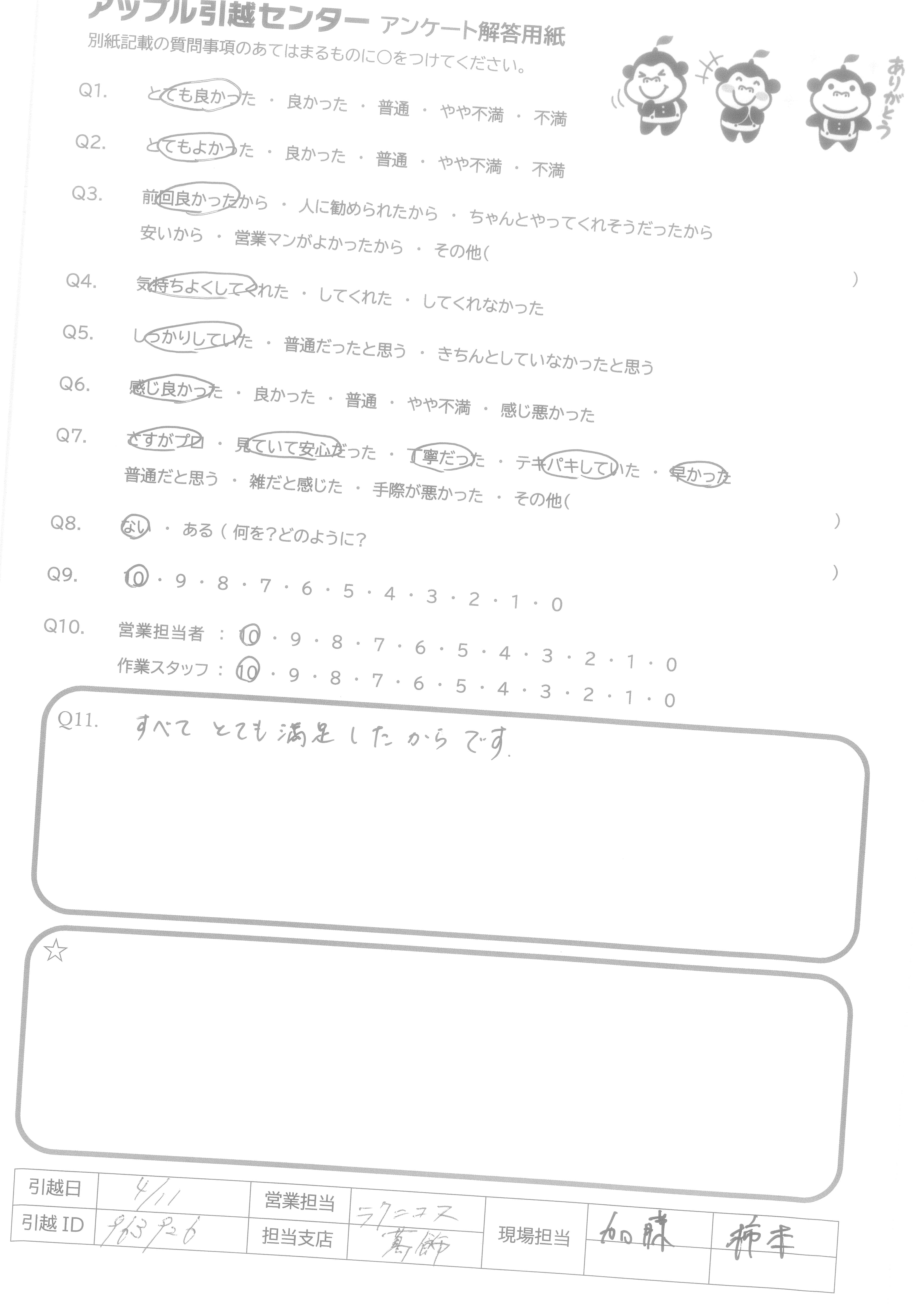 A.今回最大手の引越し会社と同時に見積もり検討させていただいて安さでAppleさんにお願いしました。 安いので色々問題があるかもしれないというこちらの危惧を払拭するような事務の対応、不安になって色々問い合わせをしましたが、その度面倒がらずに対処していただけました。また当日の作業の手際良さ、爽やかさに本当に感謝しています。 是非、次回も引越しの時にはお願いしたいと思っています。 有り難うございました。