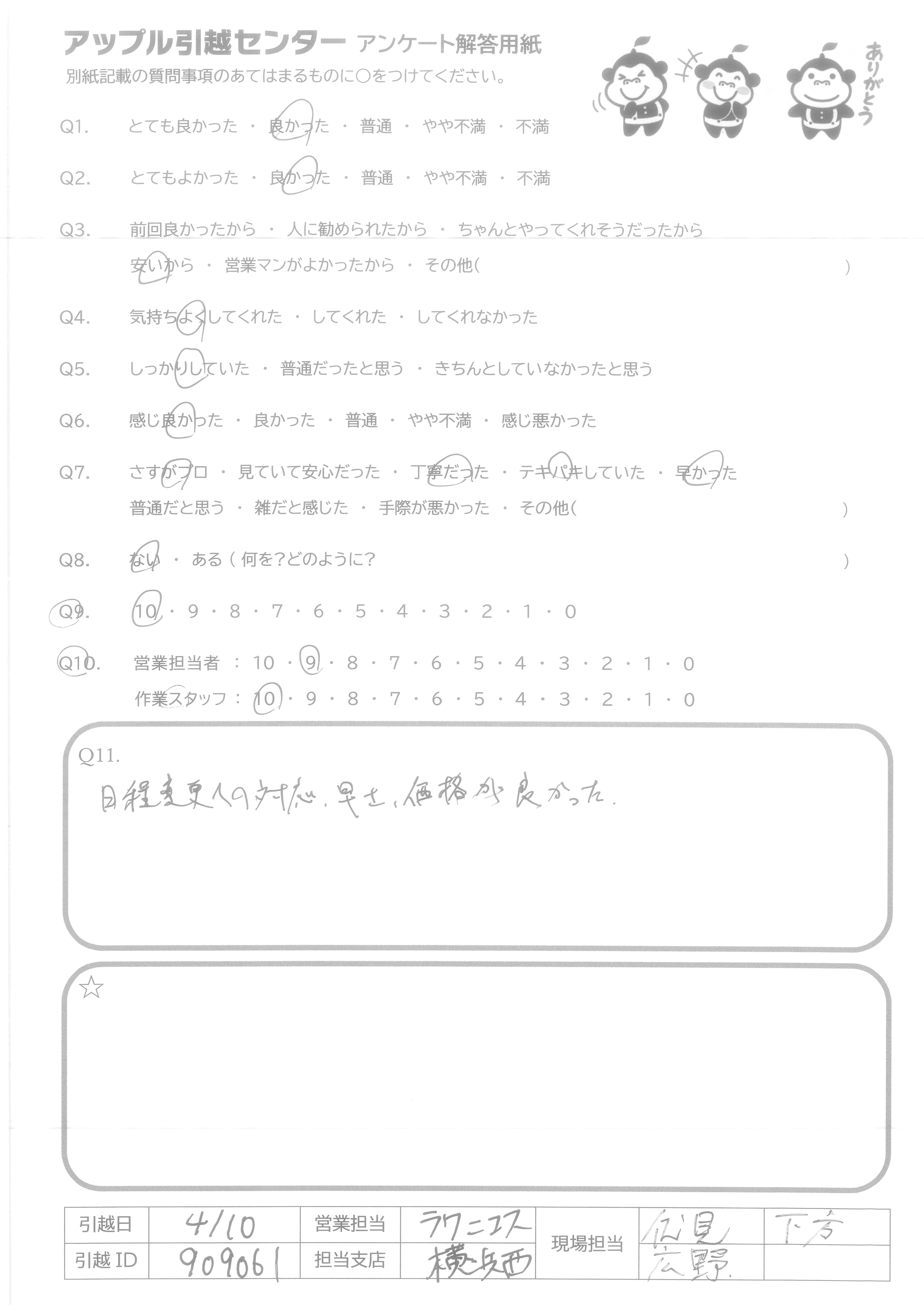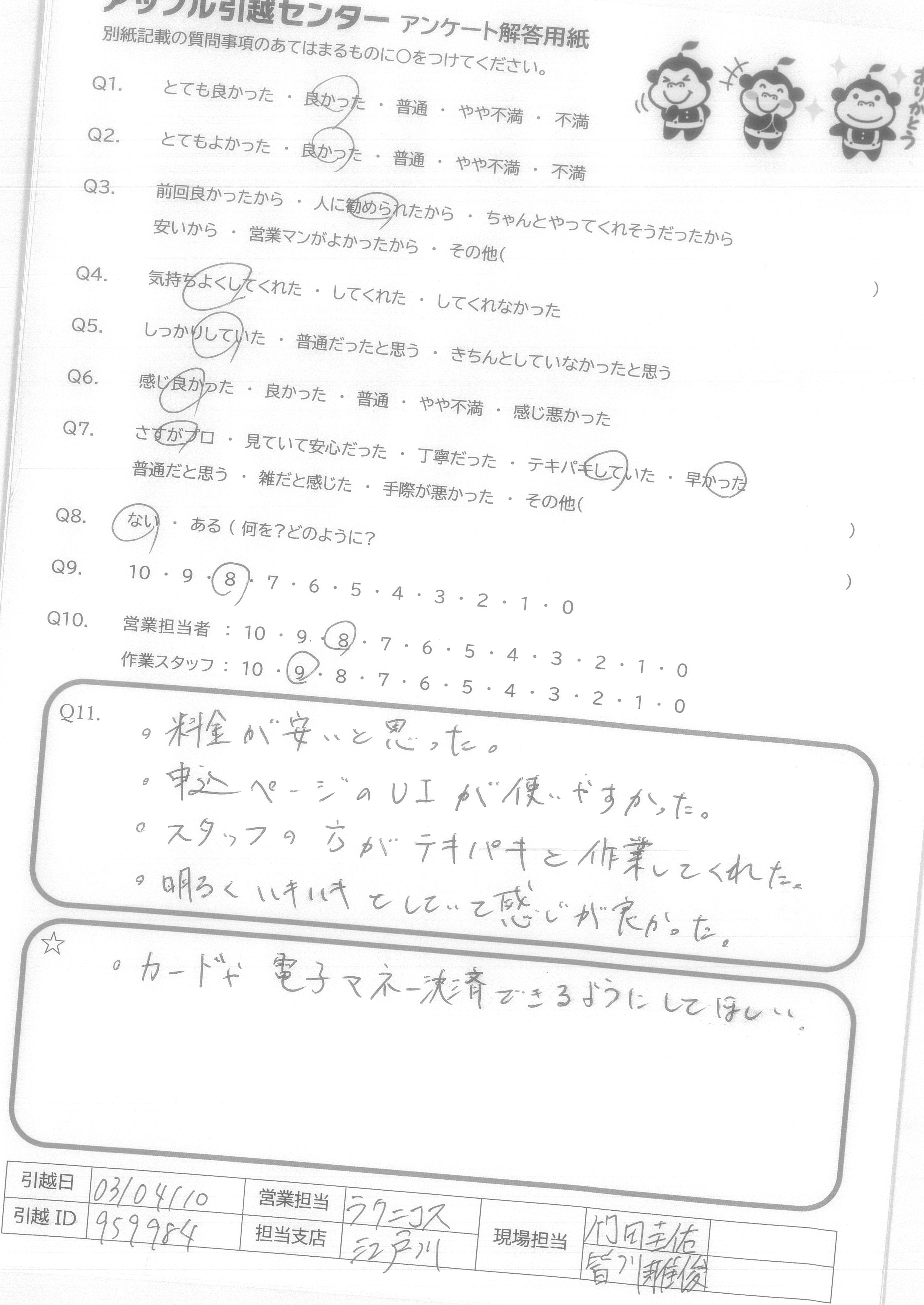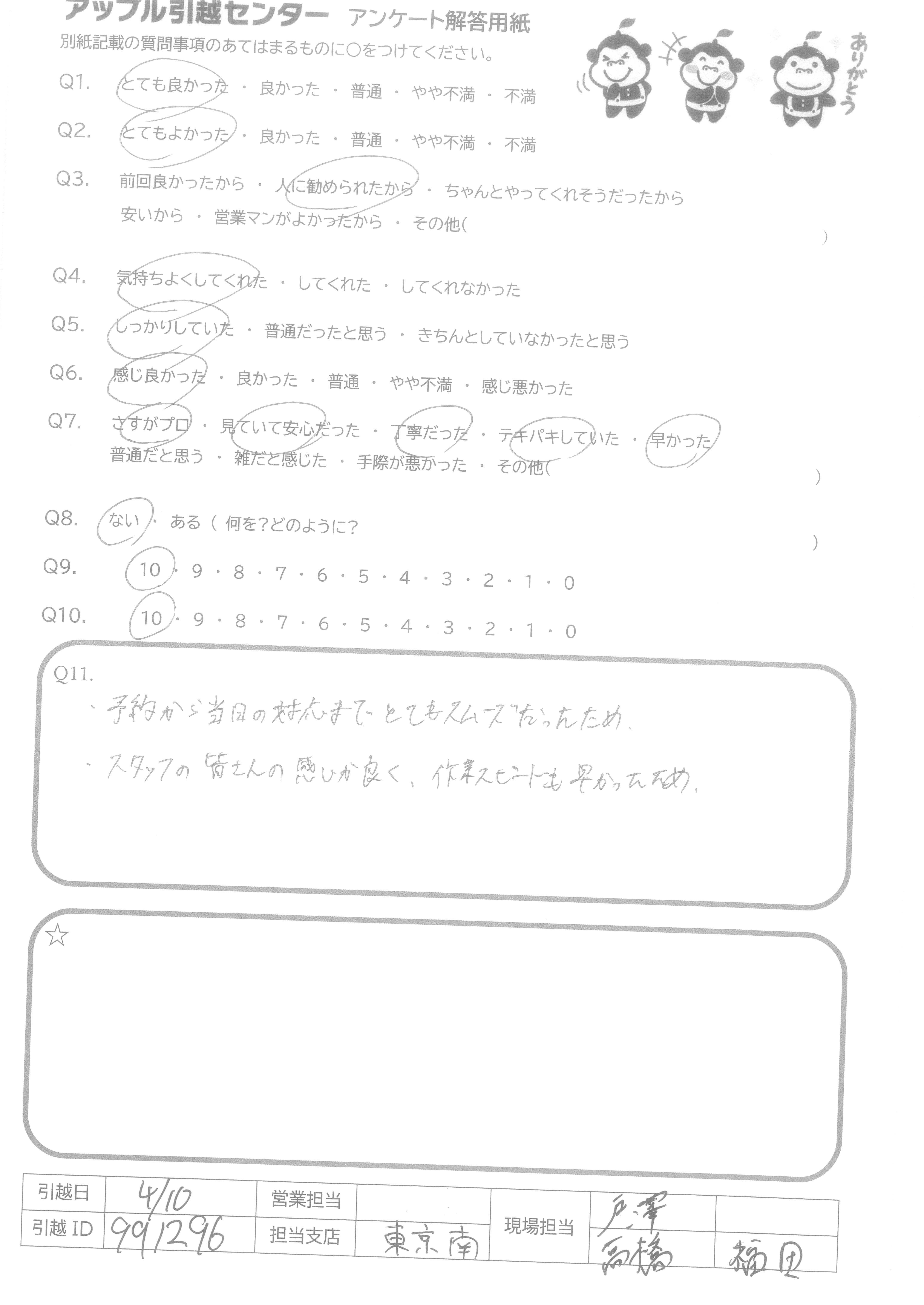 A.・料金が安いと思った。 ・申込ページのUIが使いやすかった。 ・スタッフの方がテキパキと作業してくれた。 ・明るくハキハキとしていて感じが良かった。