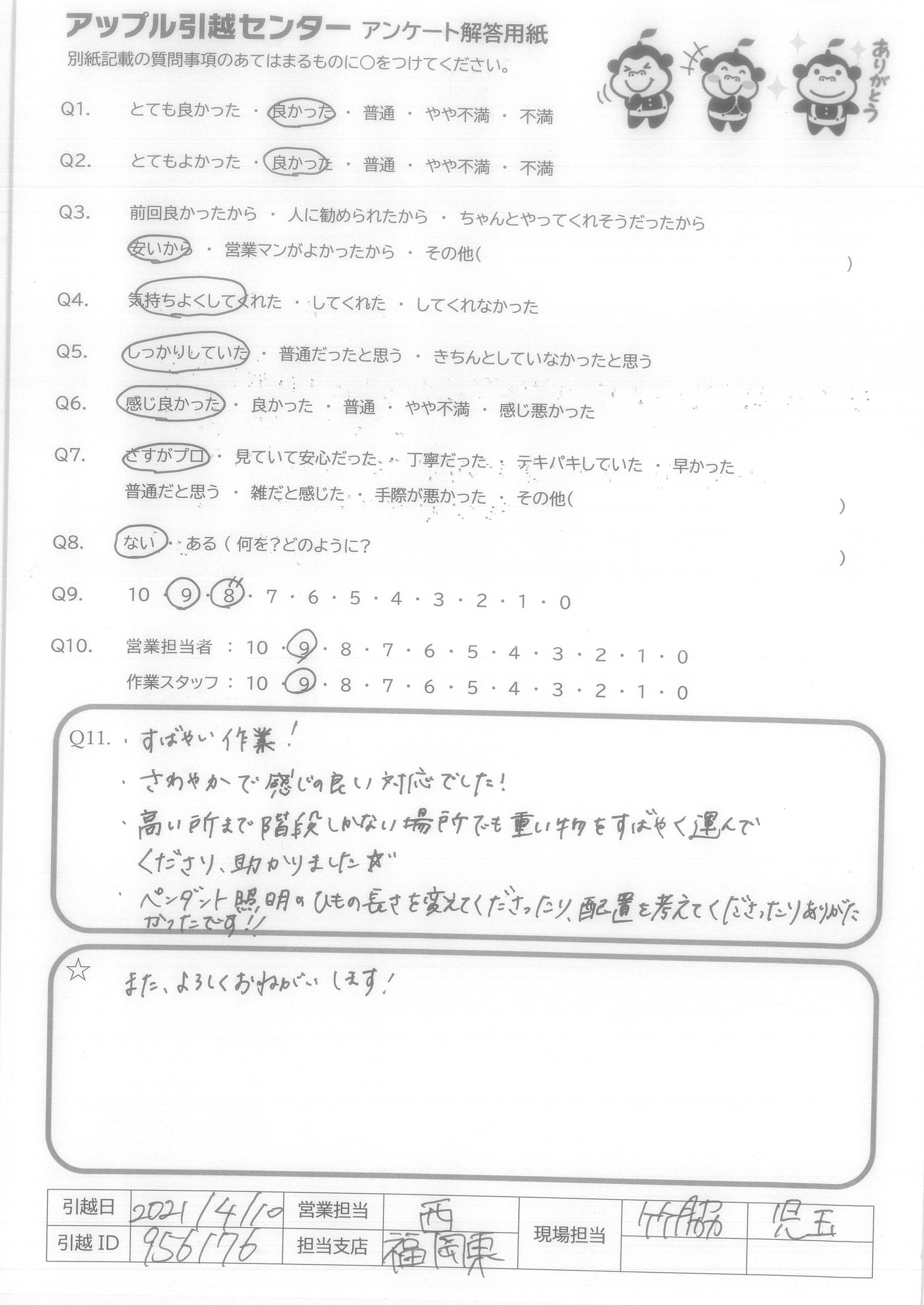 A.・すばやい作業! ・さわやかで感じの良い対応でした! ・高い所まで階段しかない場所でも重い物をすばやく運んでくださり、助かりました。 ・ペンダント照明のひもの長さを変えてくださったり、配置を考えてくださったりありがたかったです!!