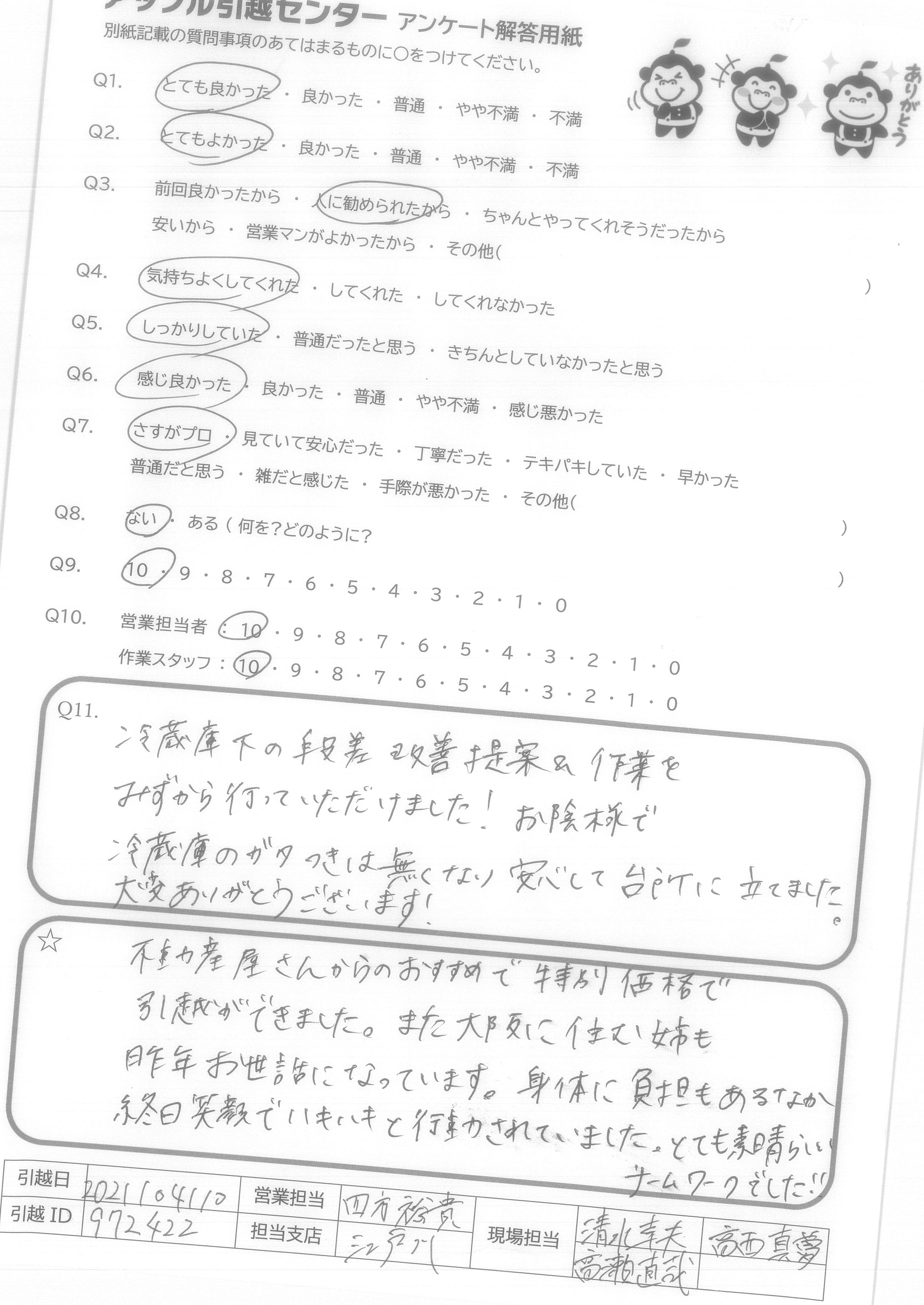 A.不動産屋さんからのおすすめで特別価格で引越ができました。 また大阪に住む姉も昨年お世話になっています。身体に負担もあるなか終日笑顔でハキハキと行動されていました。とても素晴らしいチームワークでした!!