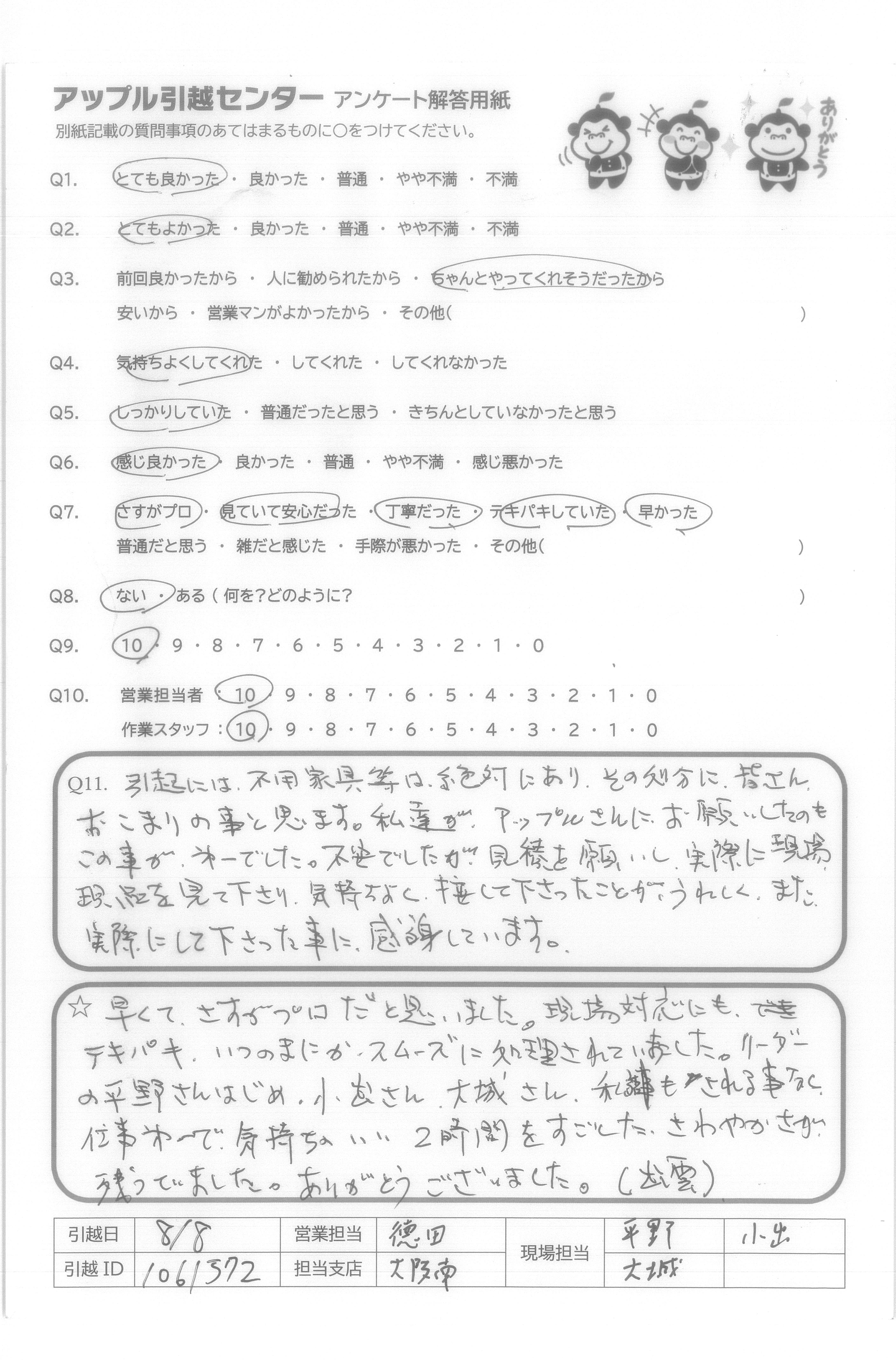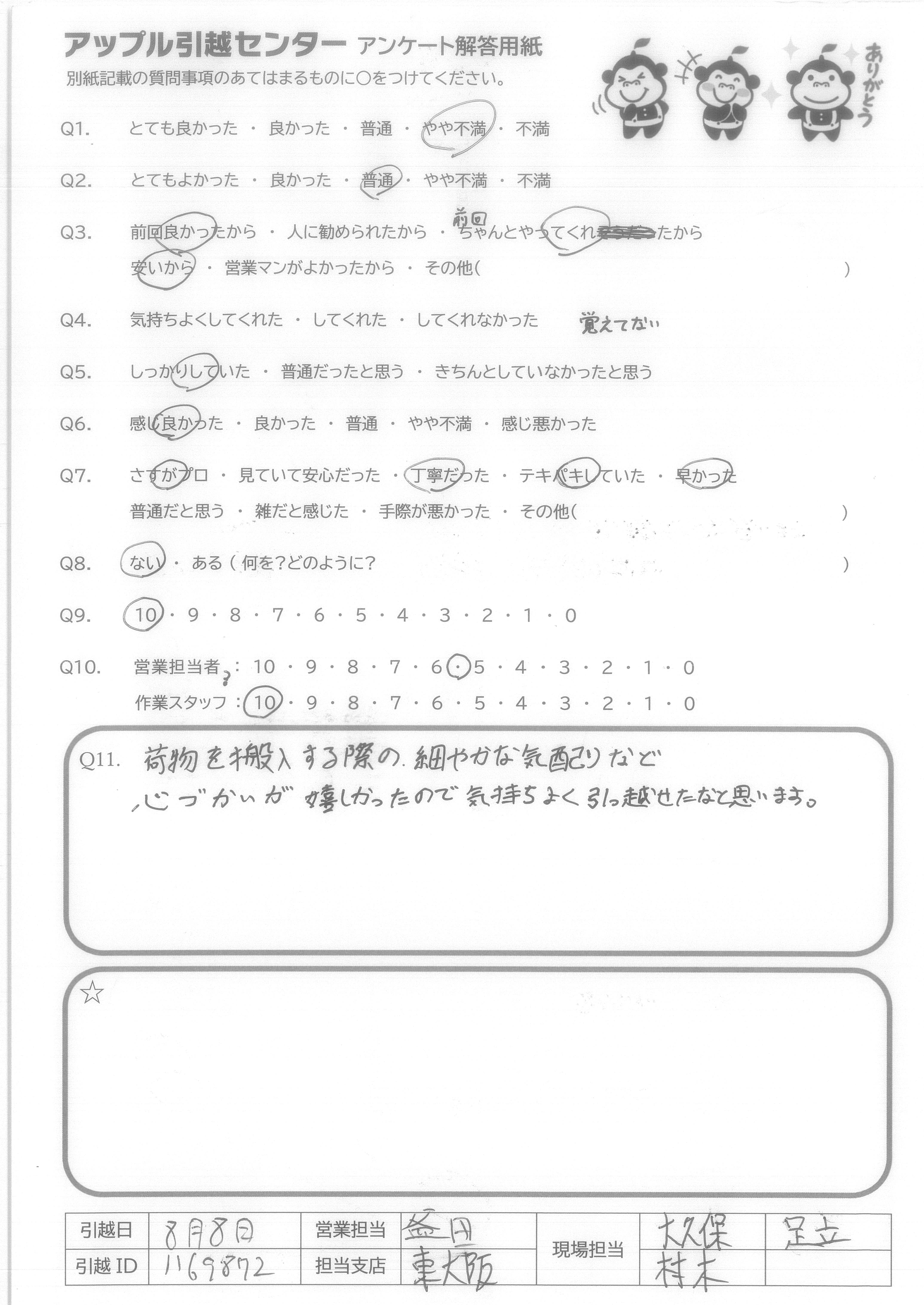 引越し日:2021年08月08日 エリア:大阪府大阪市旭区