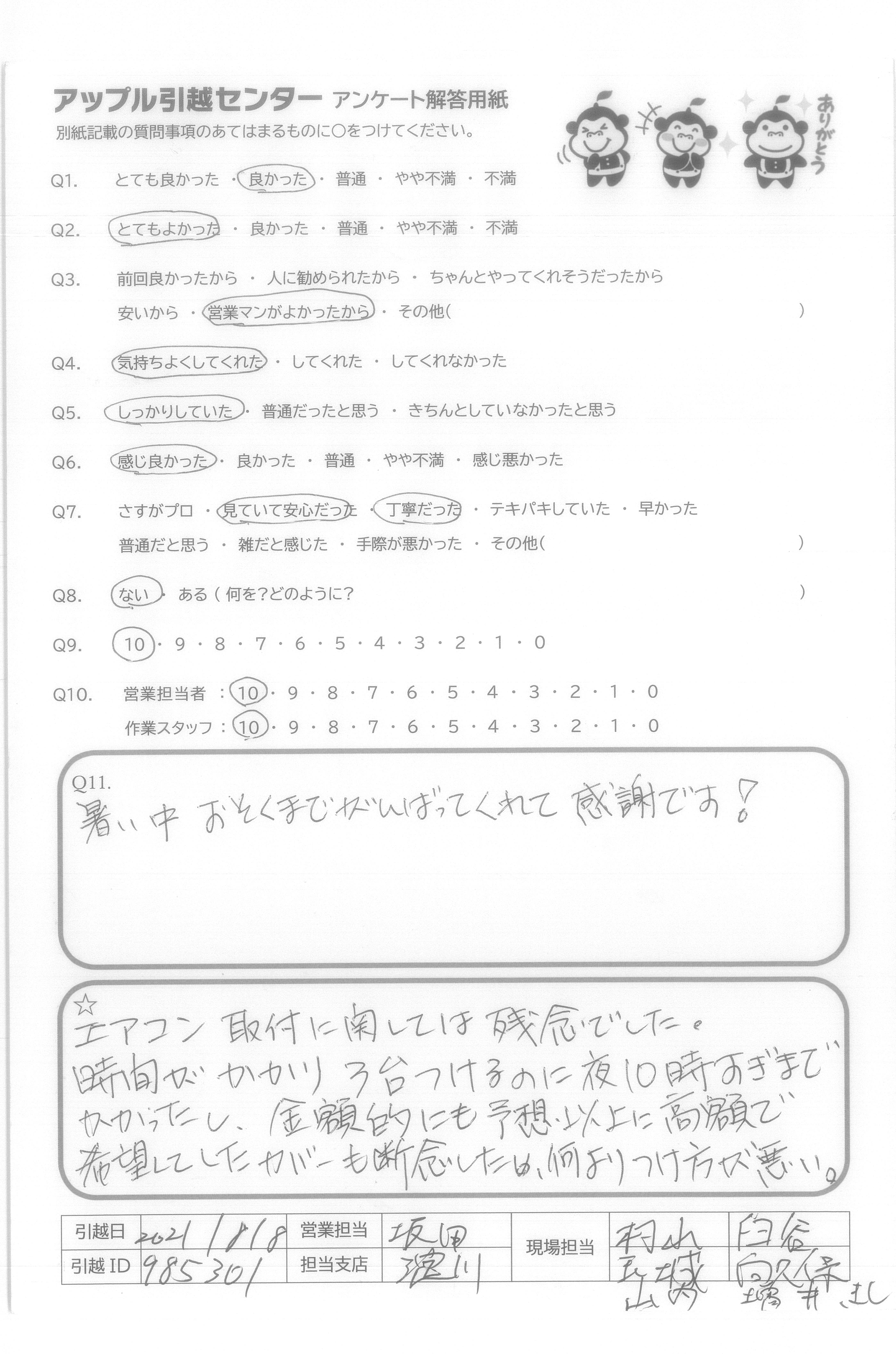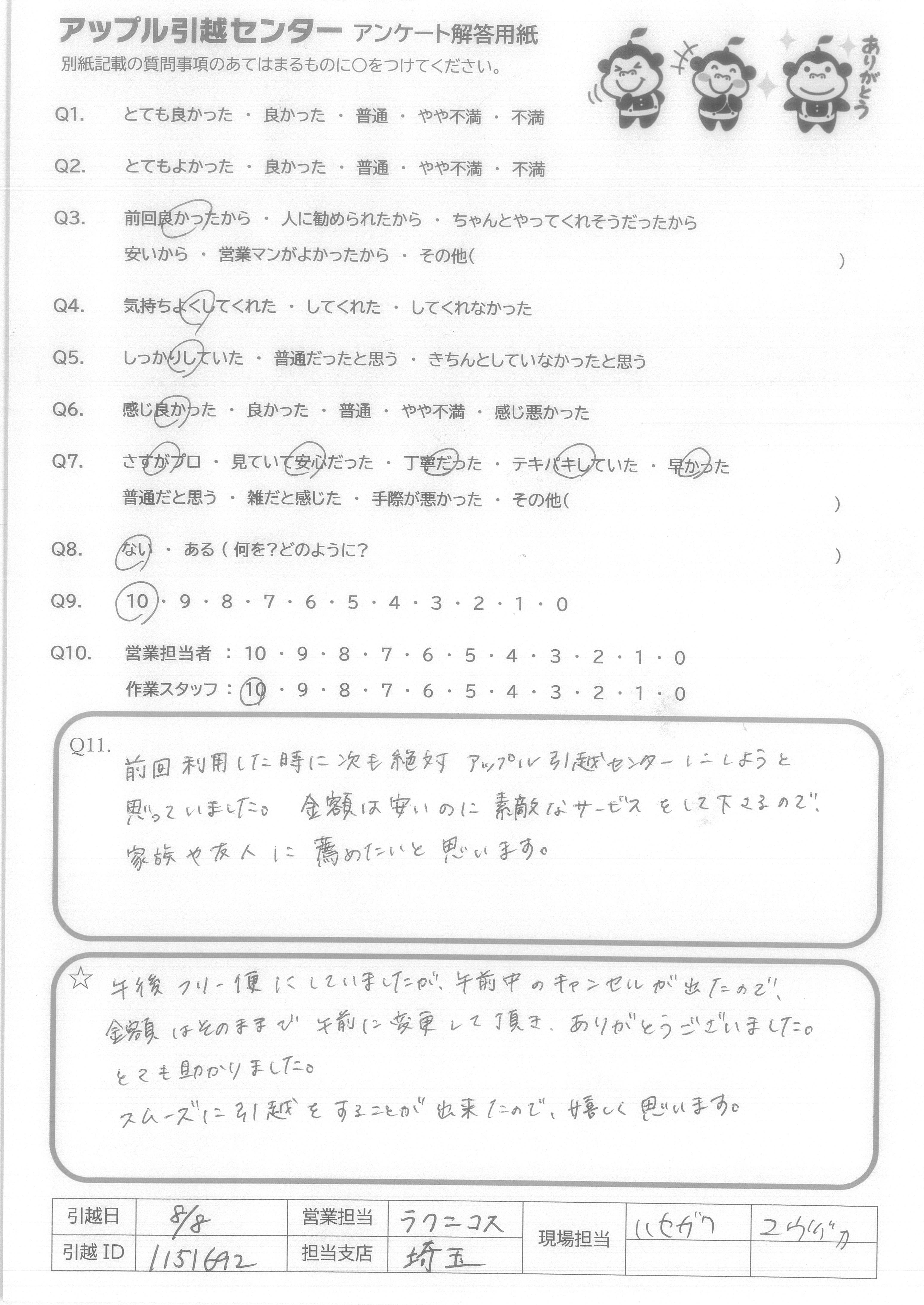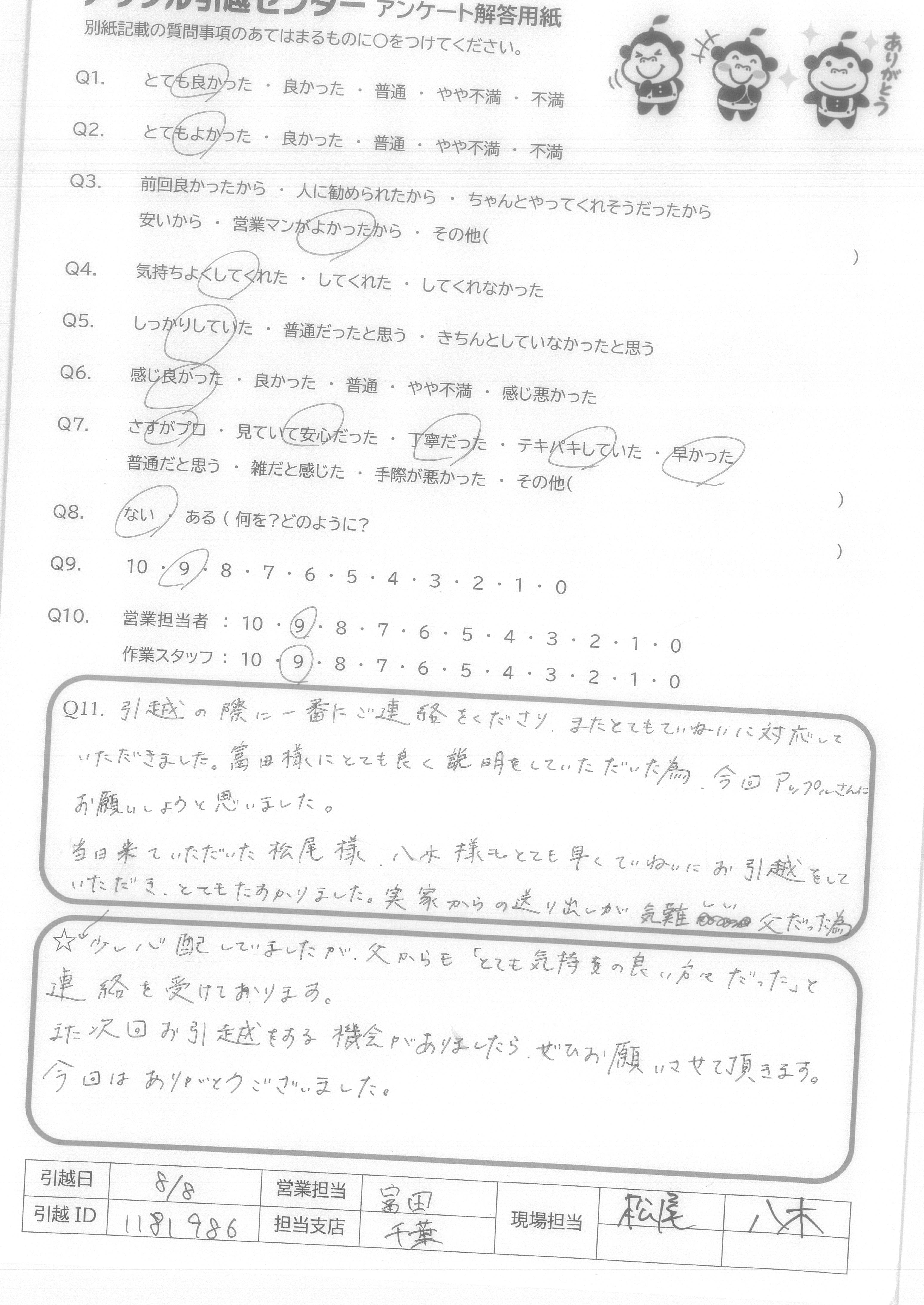 A.少し心配していましたが、父からも「とても気持ちの良い方だった」と連絡を受けております。 また次回お引越をする機会がありましたら、ぜひお願いさせて頂きます。 今回はありがとうございました。