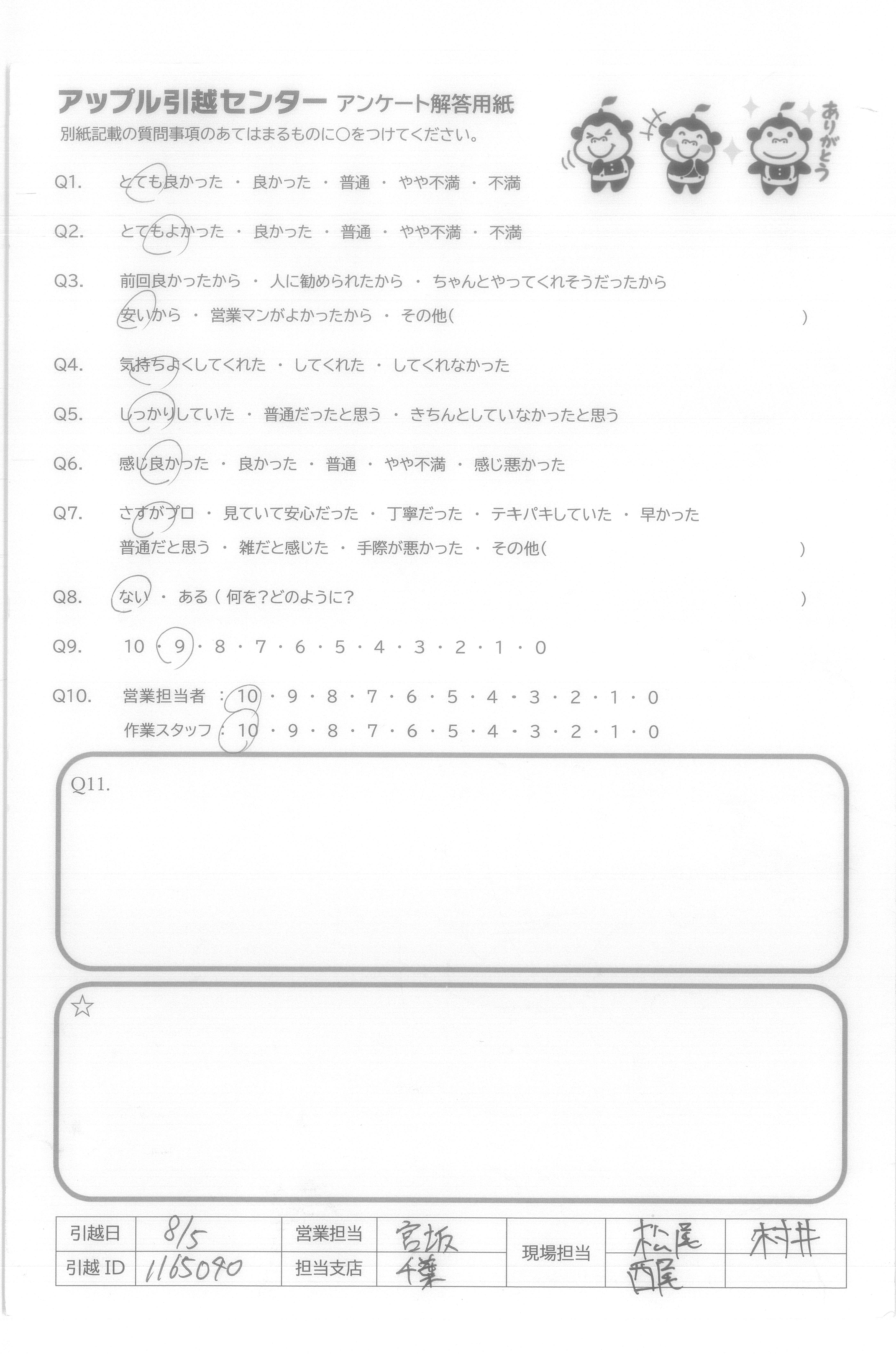 A.引越の際に一番にご連絡をくださり、またとてもていねいに対応していただきました。富田様にとても良く説明をしていただいた為、今回アップルさんにお願いしようと思いました。 当日来ていただいた松尾様、八木様もとても早くていねいにお引越をしていただき、とても助かりました。実家からの送り出しが気難しい父だった為、