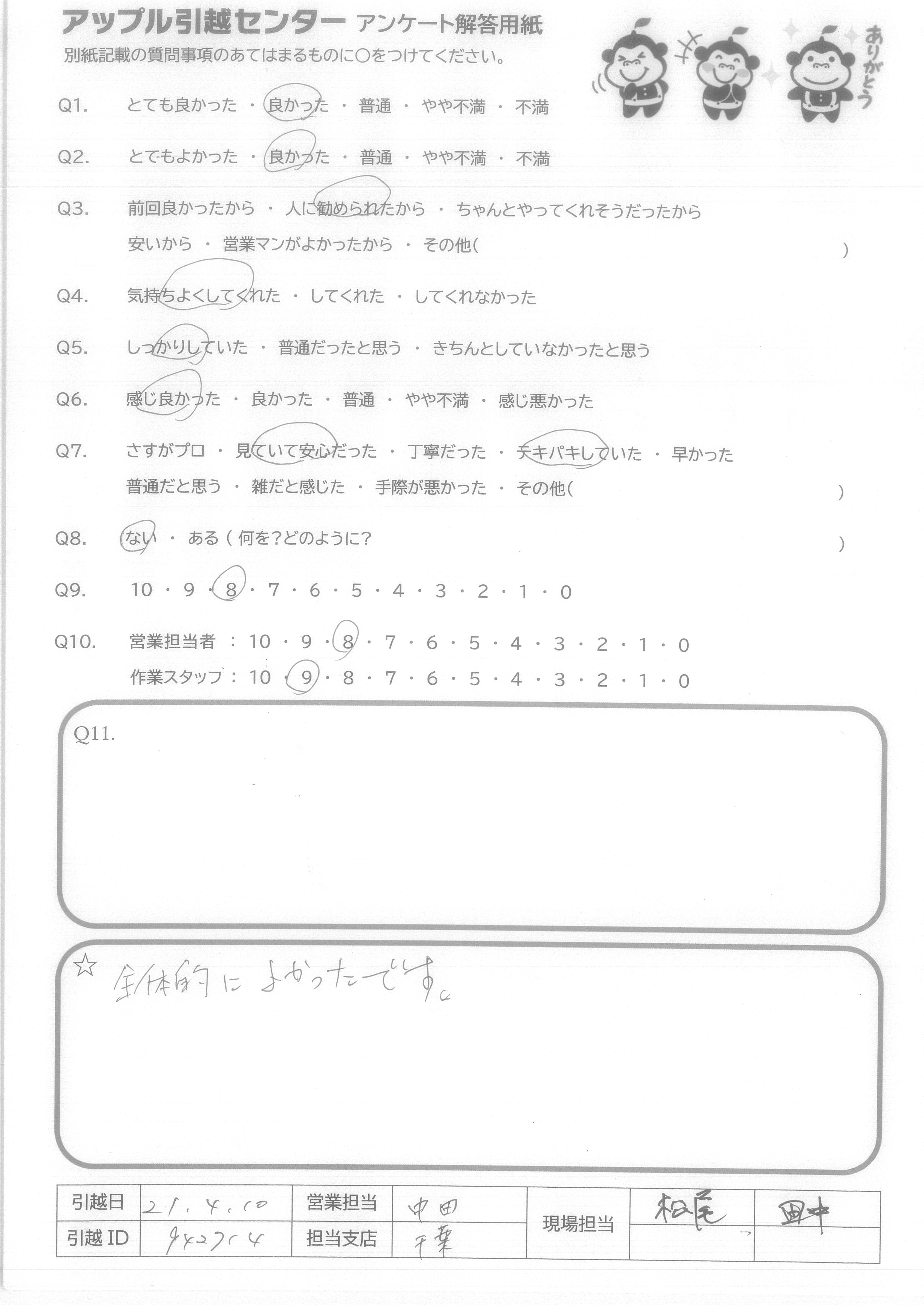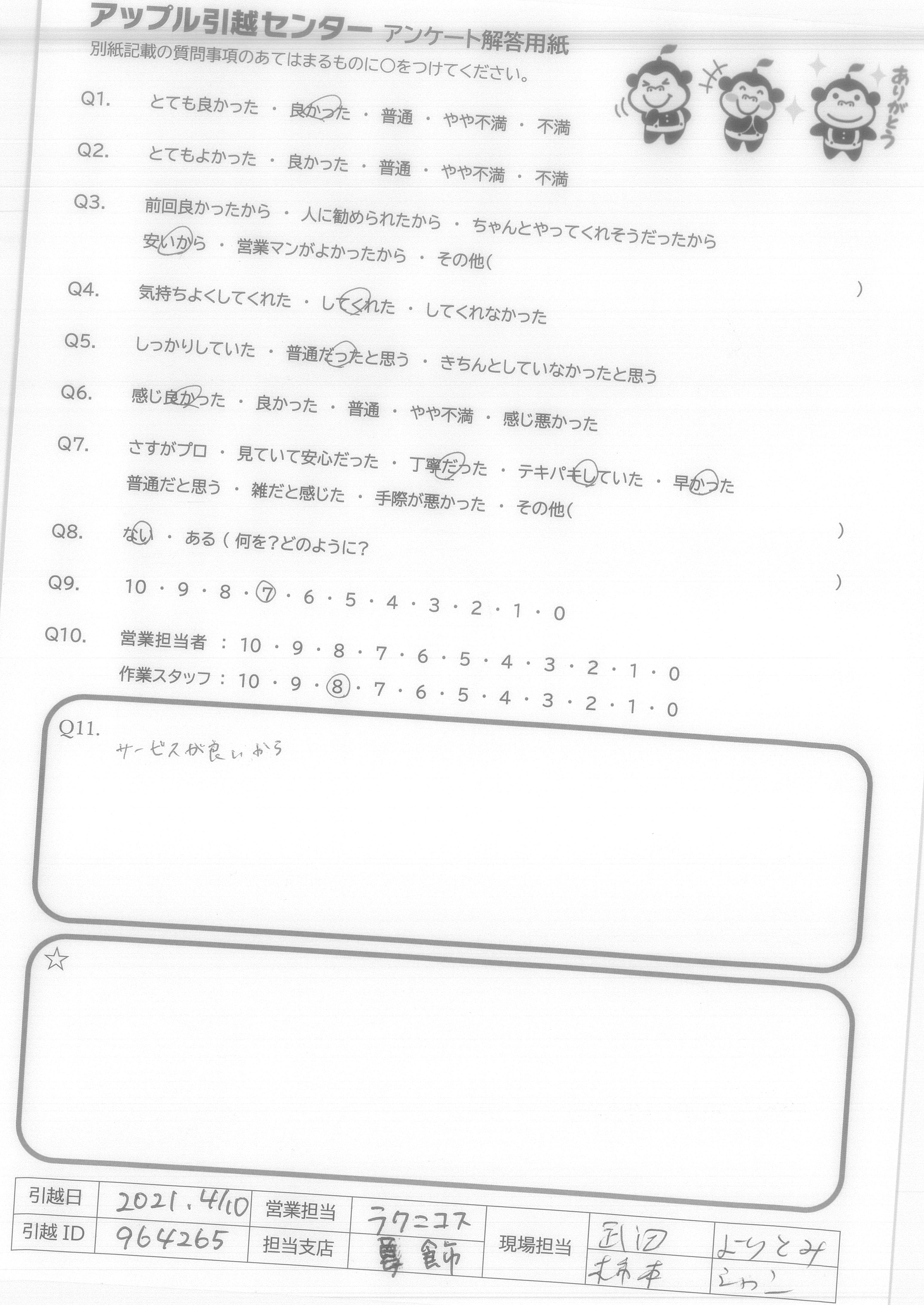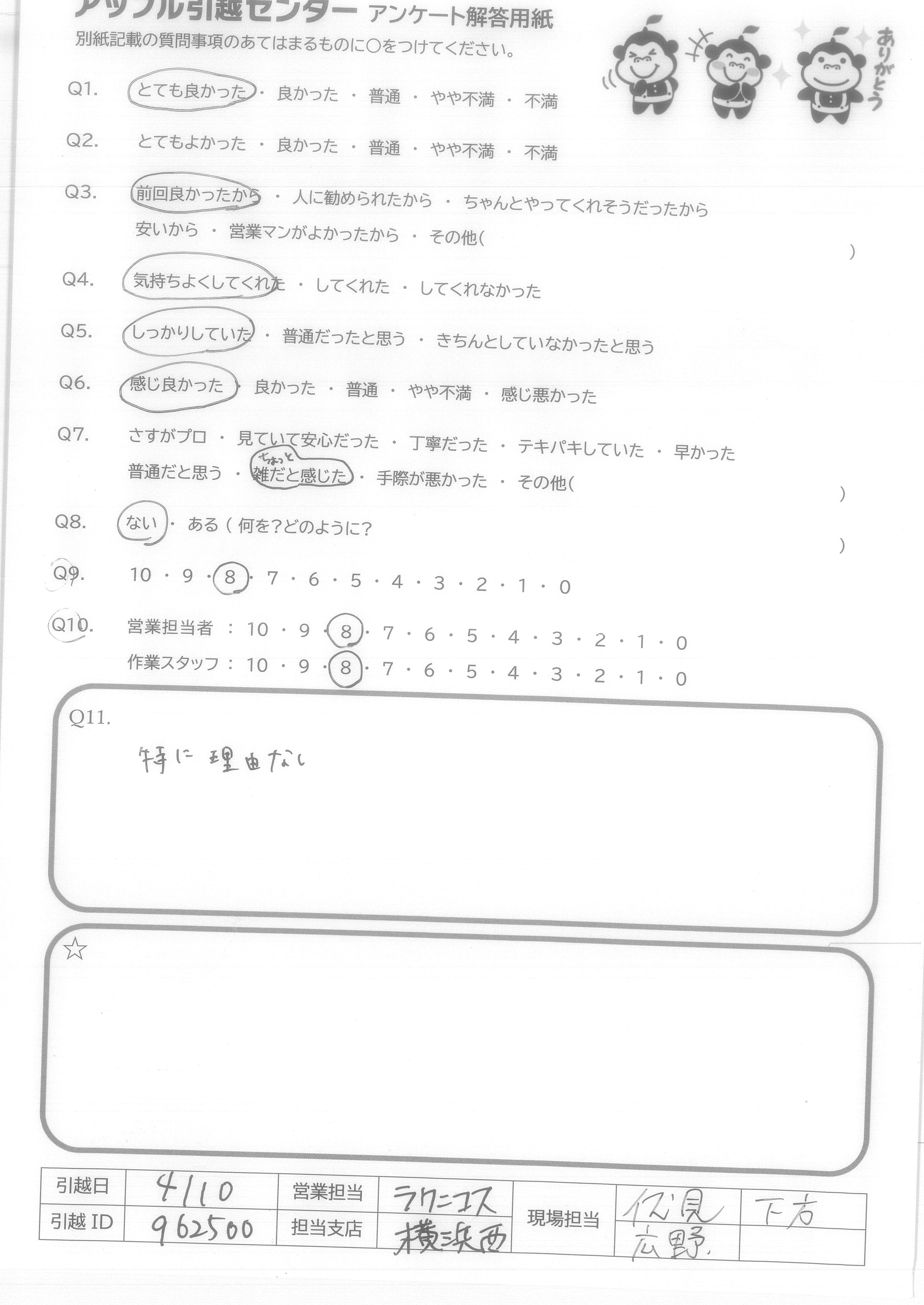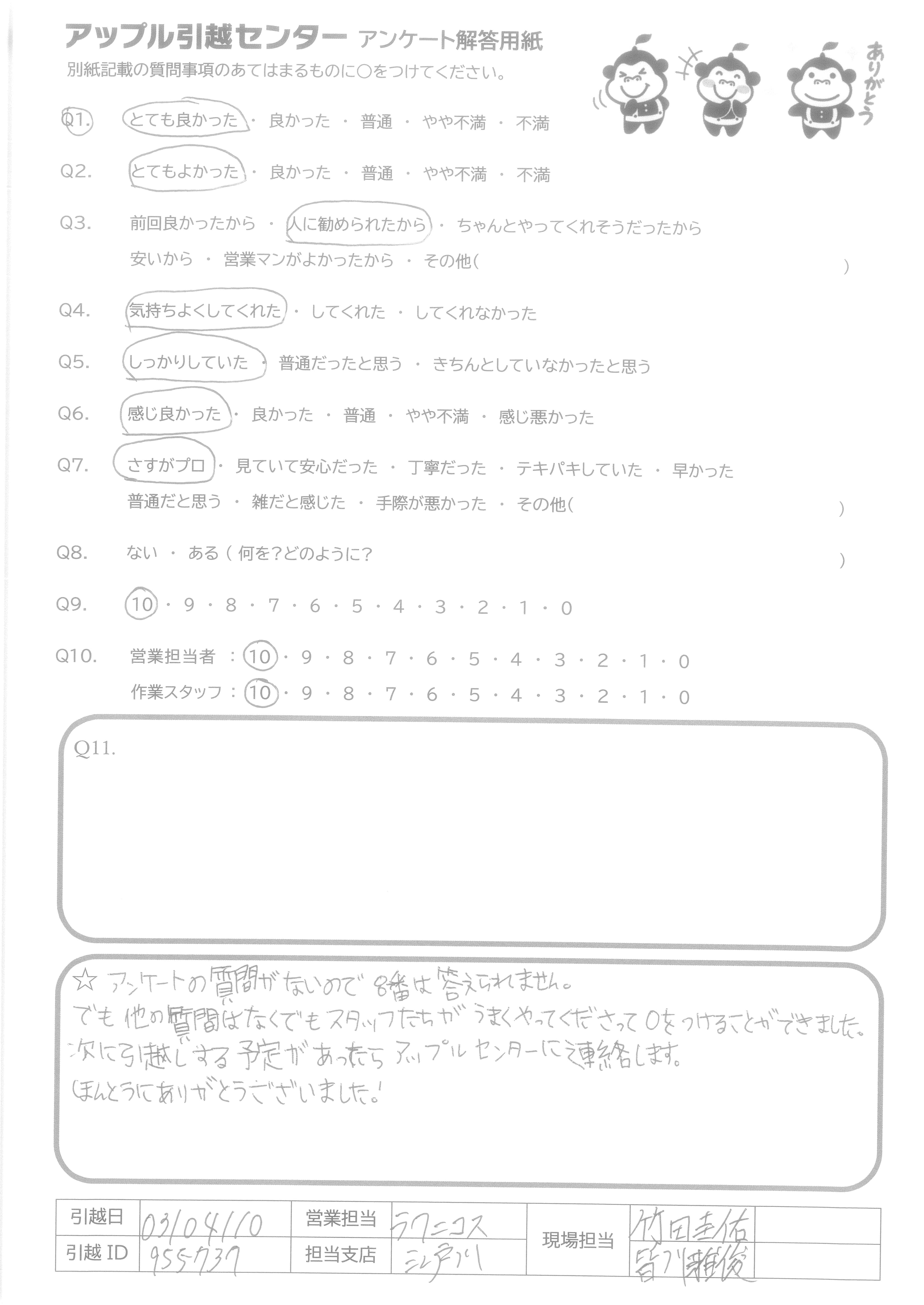 A.アンケートの質問がないので8番は答えられません。 でも他の質問はなくてもスタッフたちがうまくやってくださって○をつけることができました。 次に引越しする予定があったらアップルセンターに連絡します。 ほんとうにありがとうございました!
