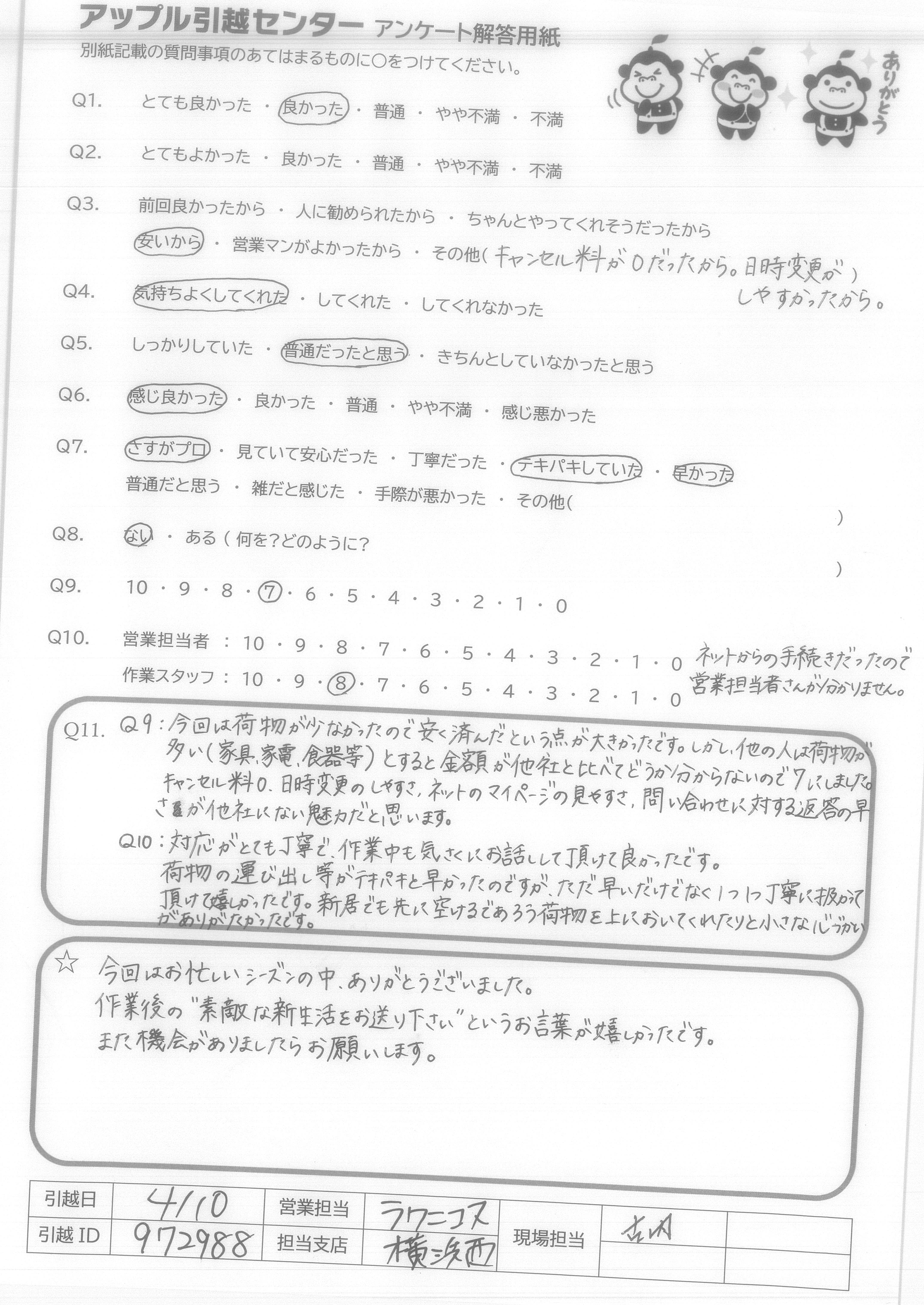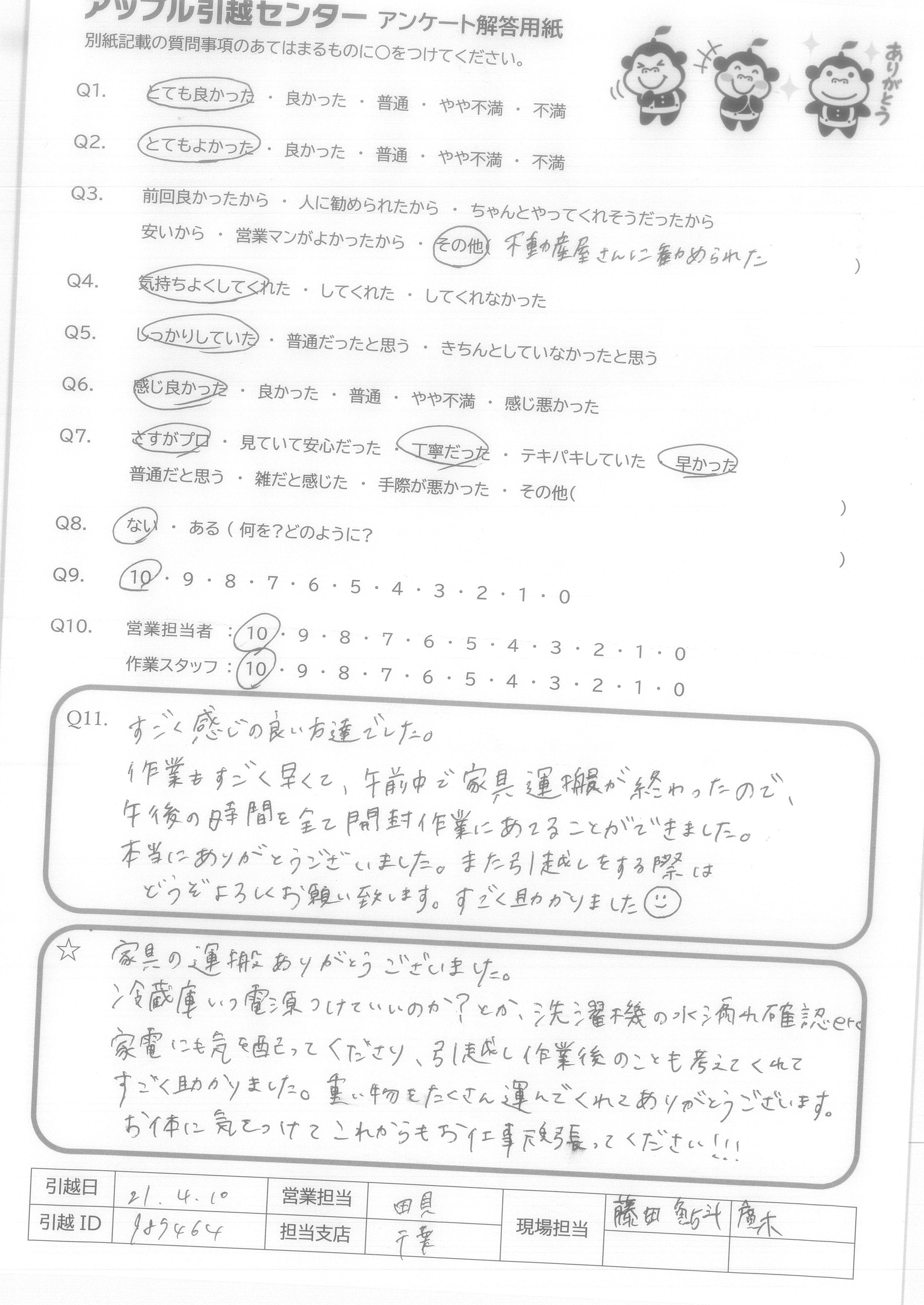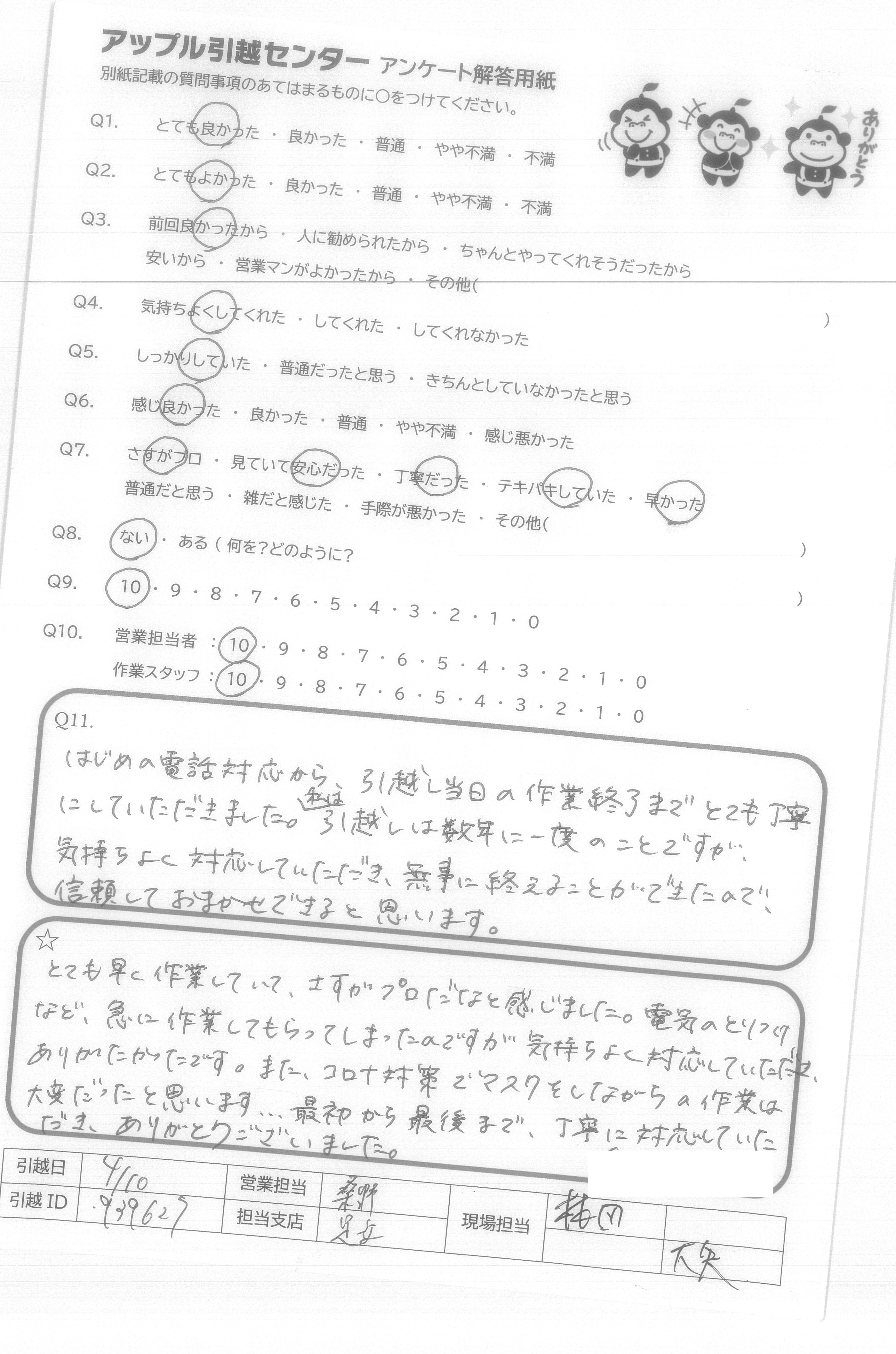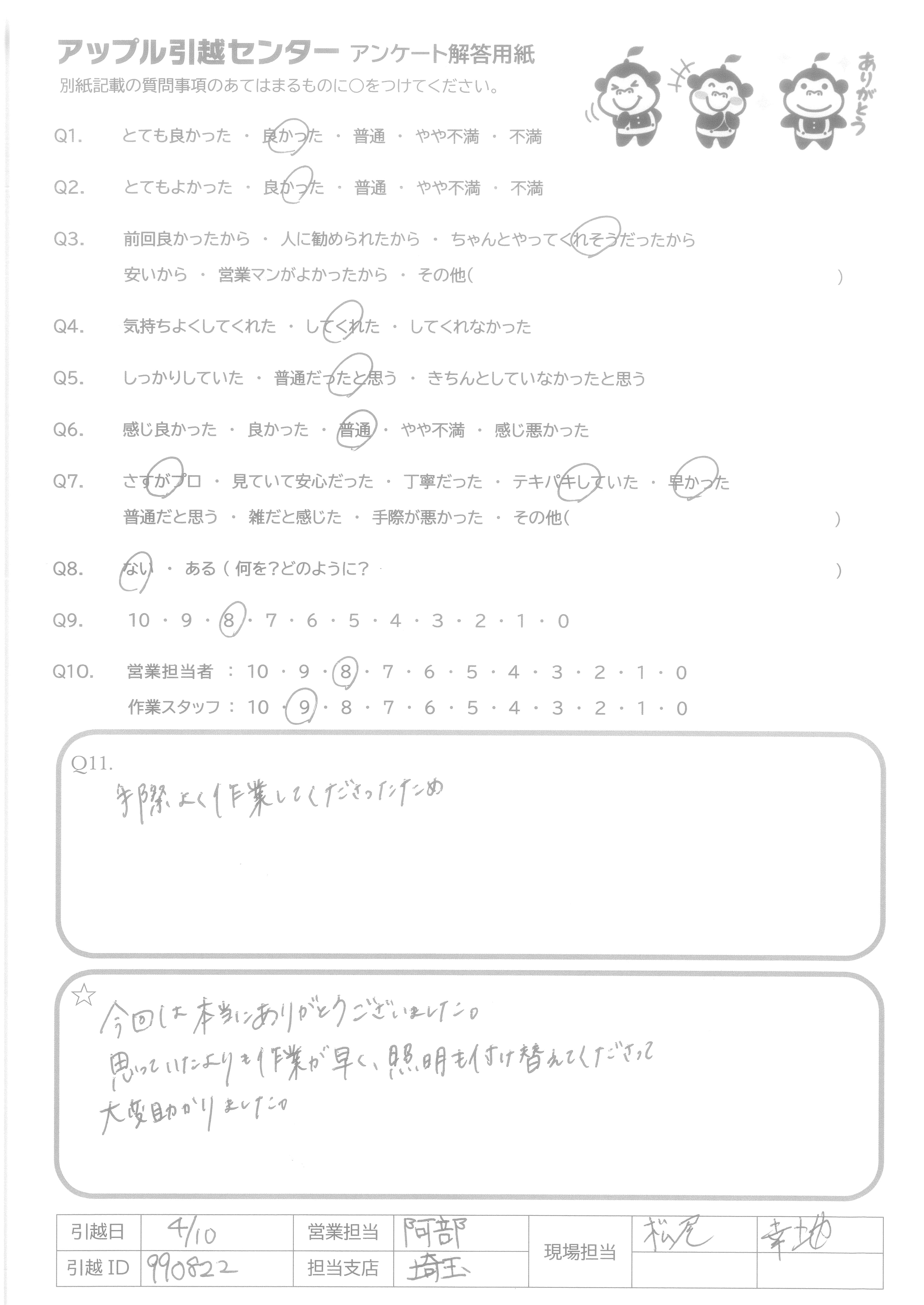 A.アンケートの質問がないので8番は答えられません。 でも他の質問はなくてもスタッフたちがうまくやってくださって○をつけることができました。 次に引越しする予定があったらアップルセンターに連絡します。 ほんとうにありがとうございました!