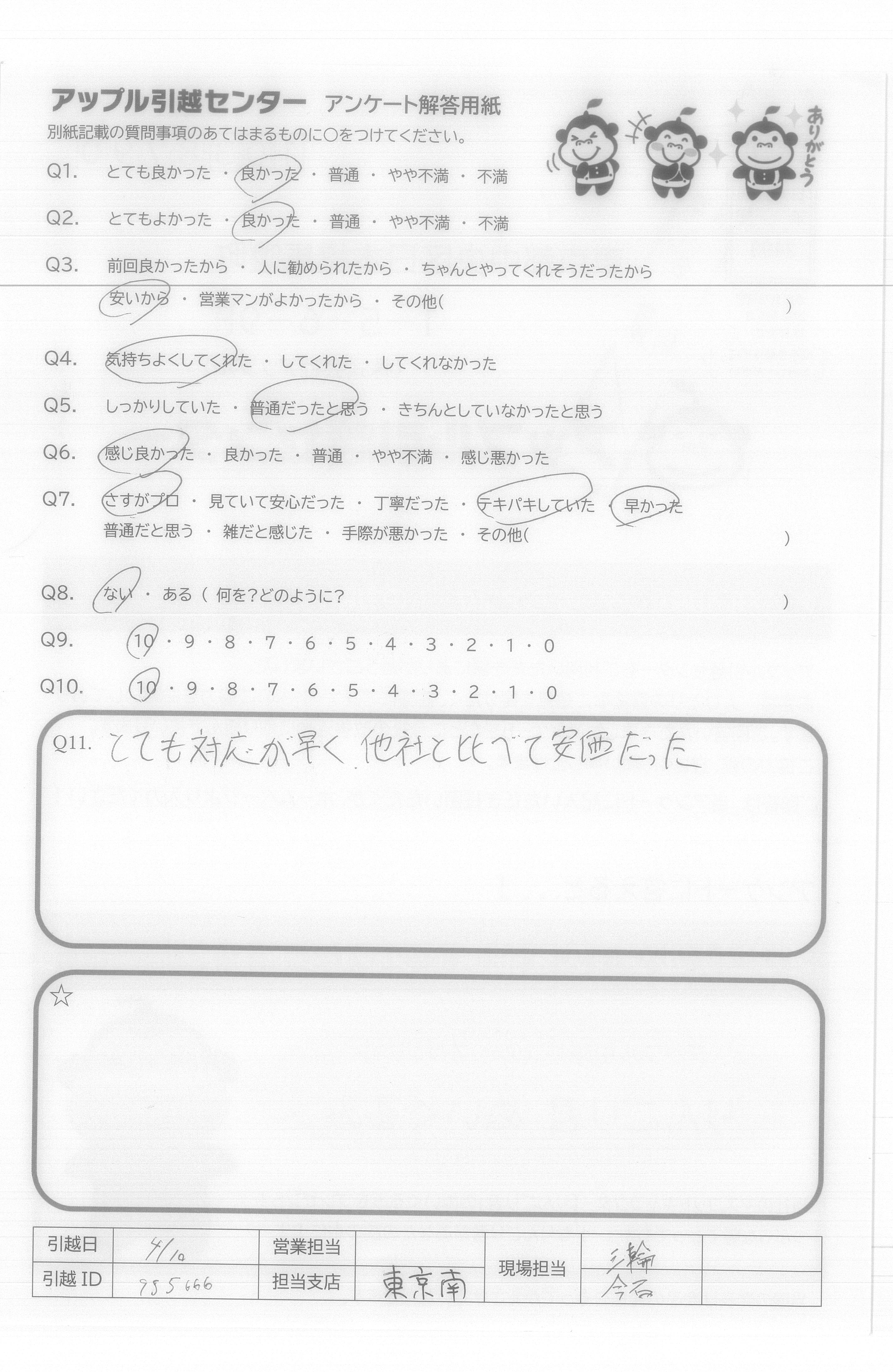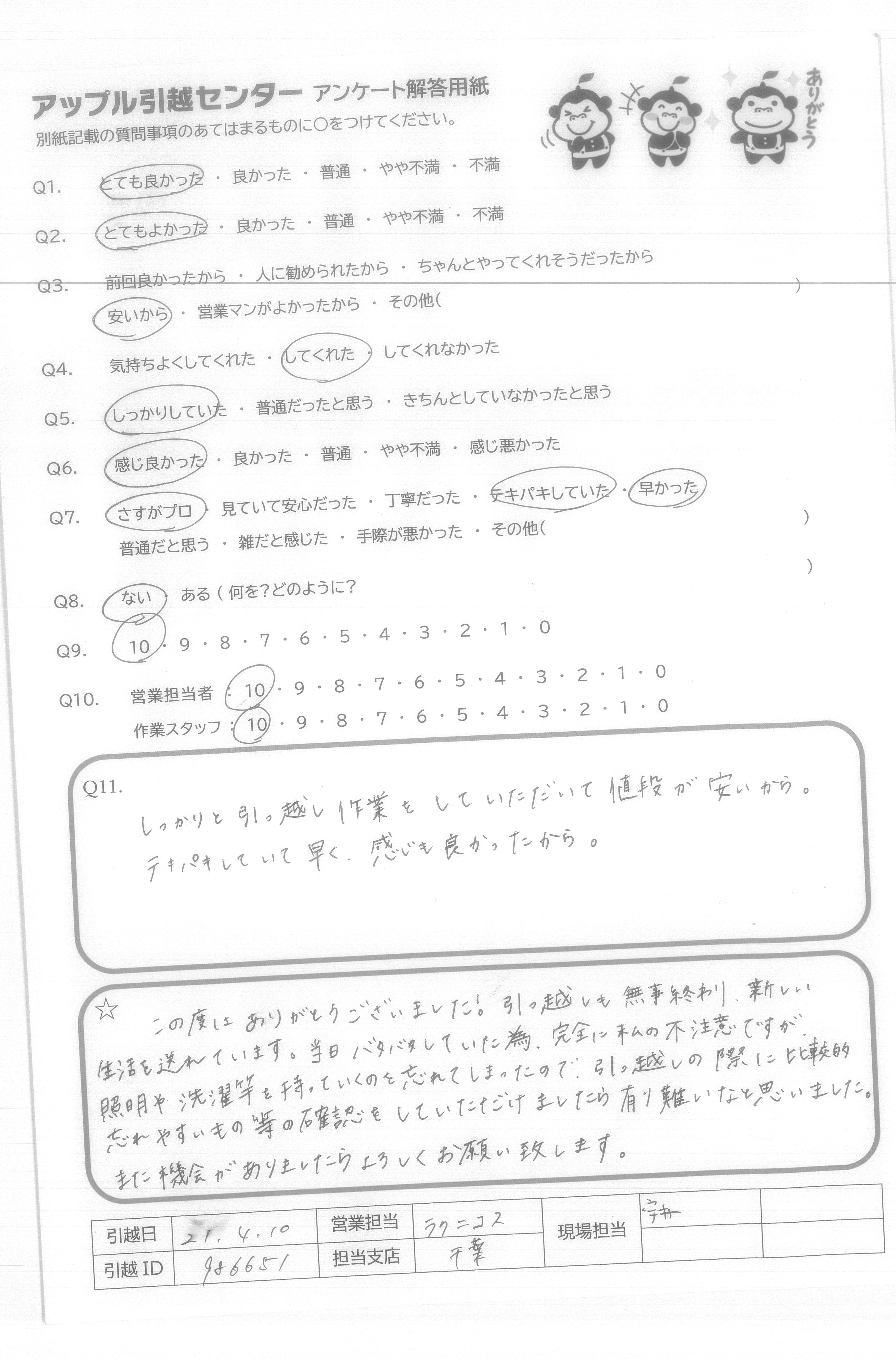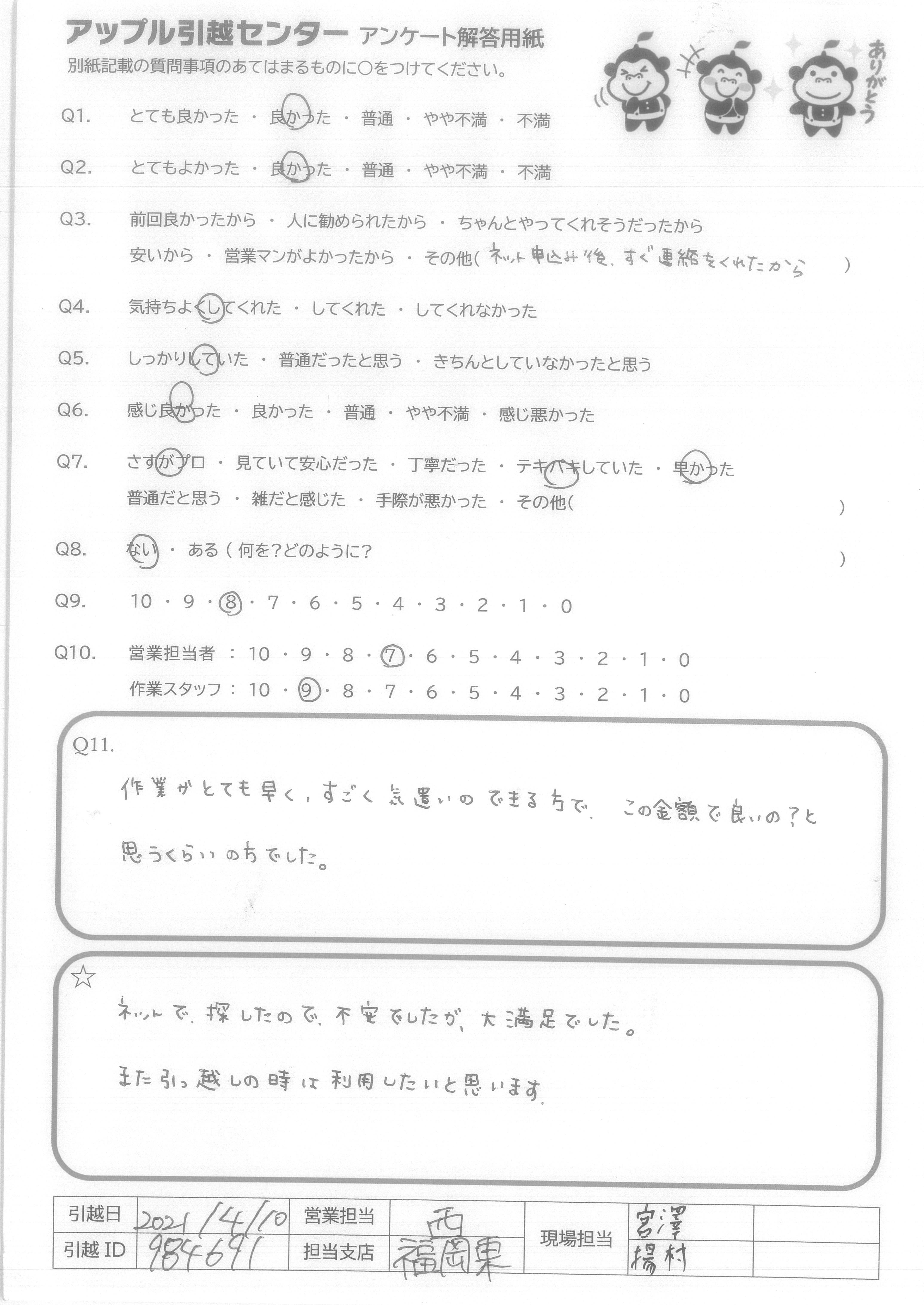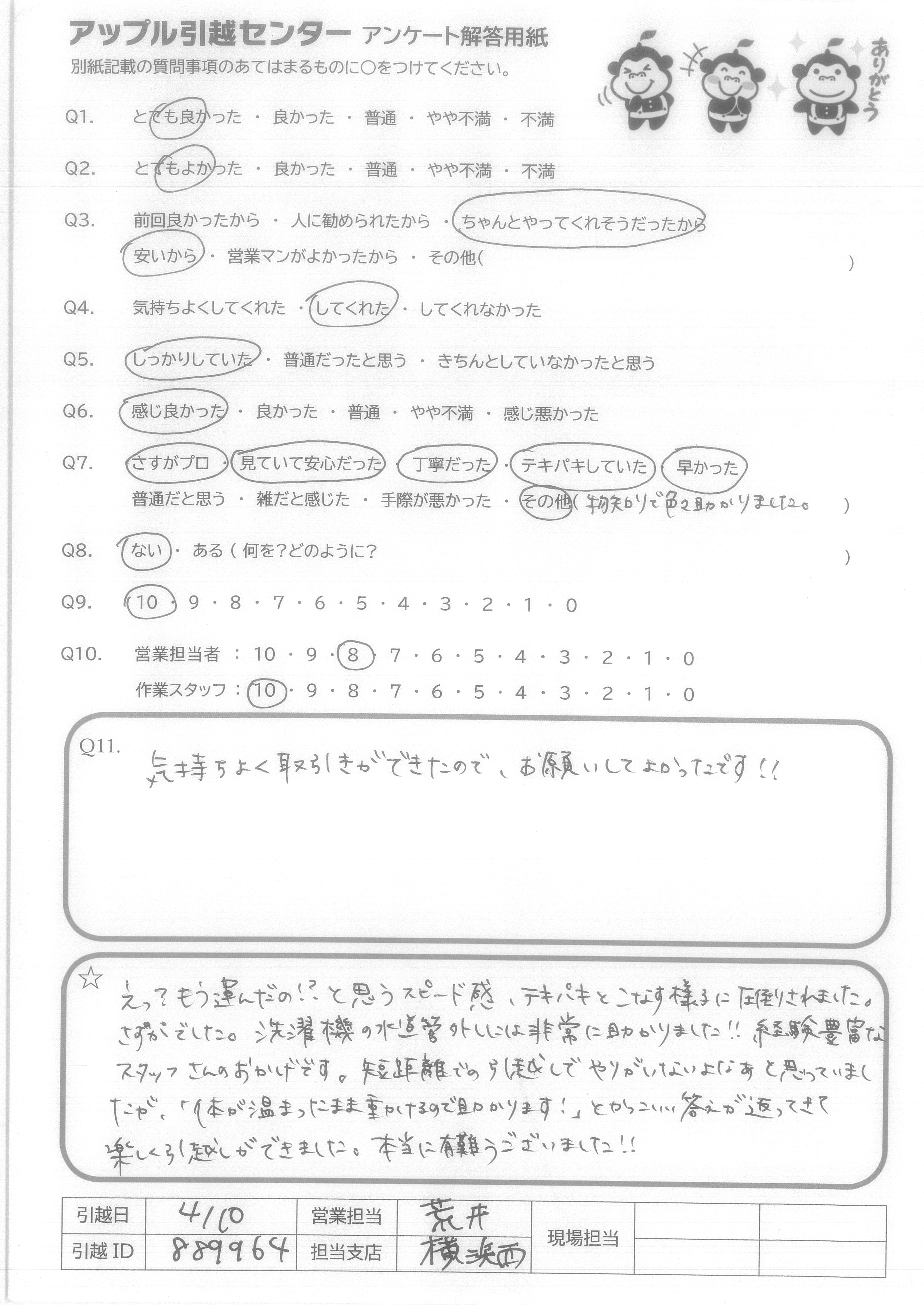 A.アンケートの質問がないので8番は答えられません。 でも他の質問はなくてもスタッフたちがうまくやってくださって○をつけることができました。 次に引越しする予定があったらアップルセンターに連絡します。 ほんとうにありがとうございました!