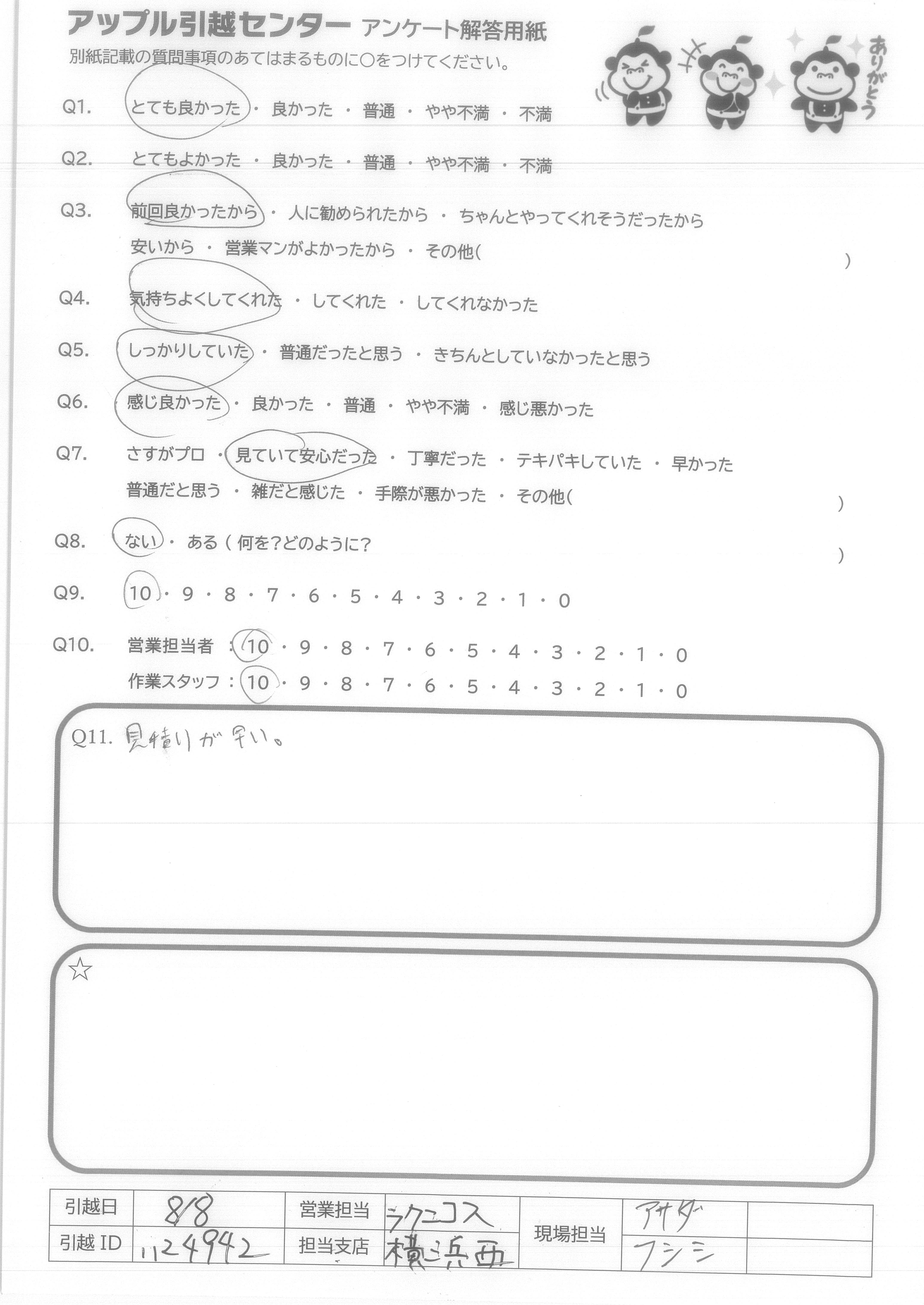 A.テキパキと素早く作業をしてスムーズであった。 こちらの対応にも柔軟に対応していただいたため。