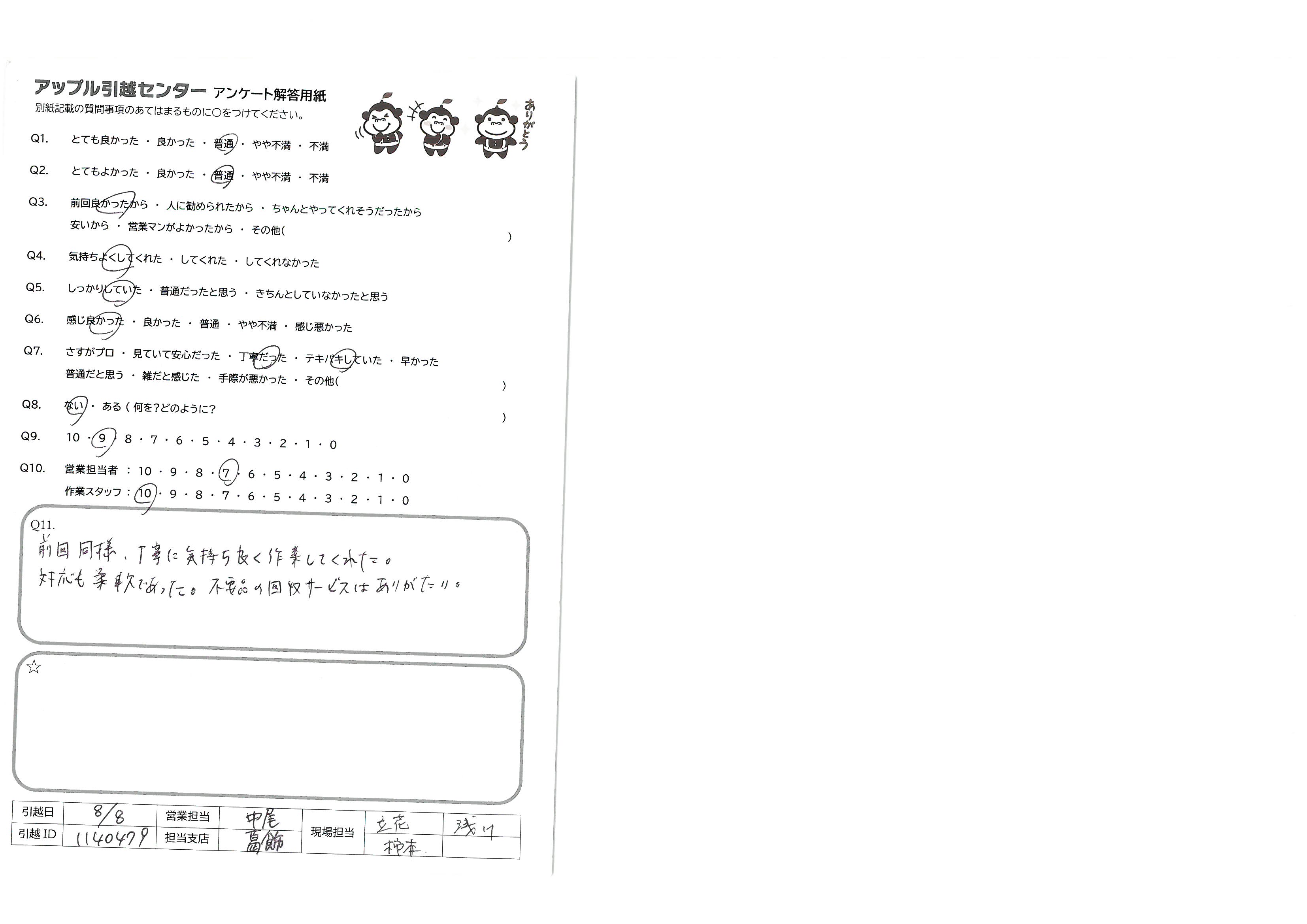 A.当日までに荷づくりが終わっていない状況の中、テキパキと作業を進めて頂いて大変助かりました。 ただ、運搬の仕方にあまり丁寧さが感じられずダンボールの中身が心配になることもあり、また実際にQ8にも記入したように家具の破損もあったため。