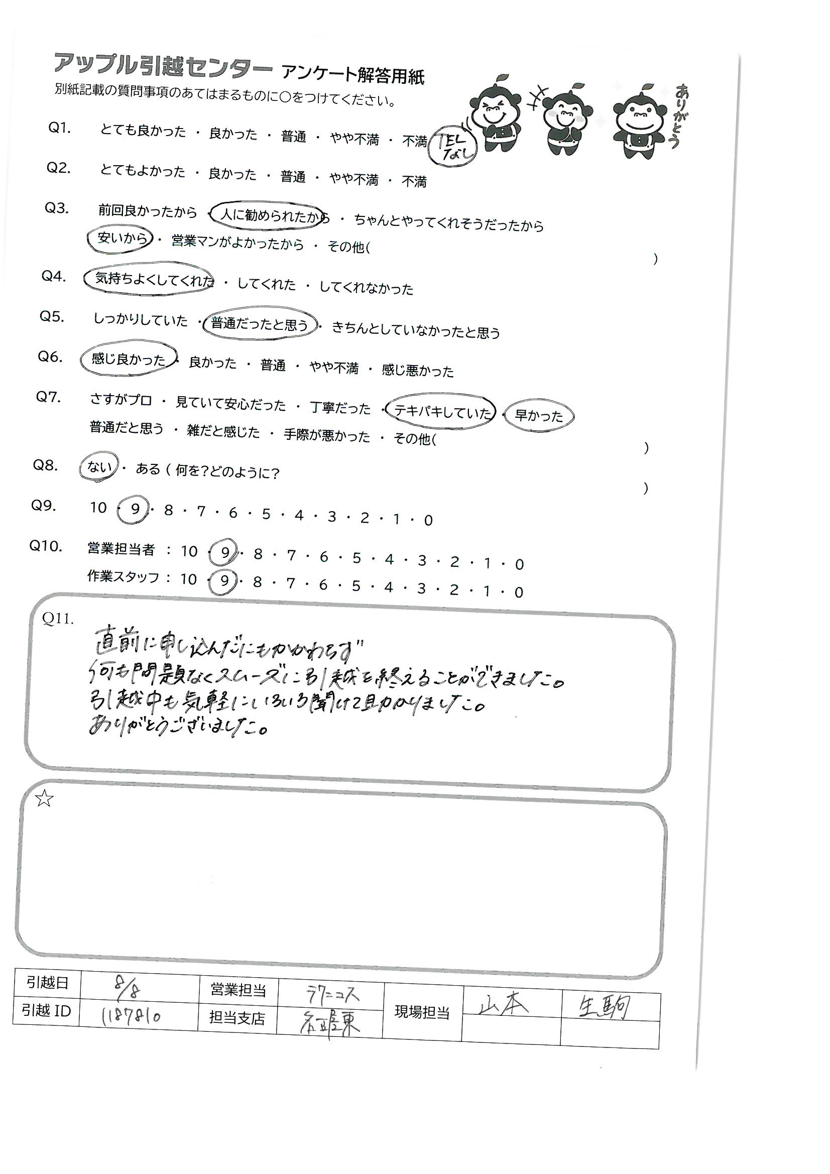 A.直前に申し込んだにもかかわらず、 何も問題なくスムーズに引越を終えることができました。 引越中も気軽にいろいろ聞けて助かりました。ありがとうございました。