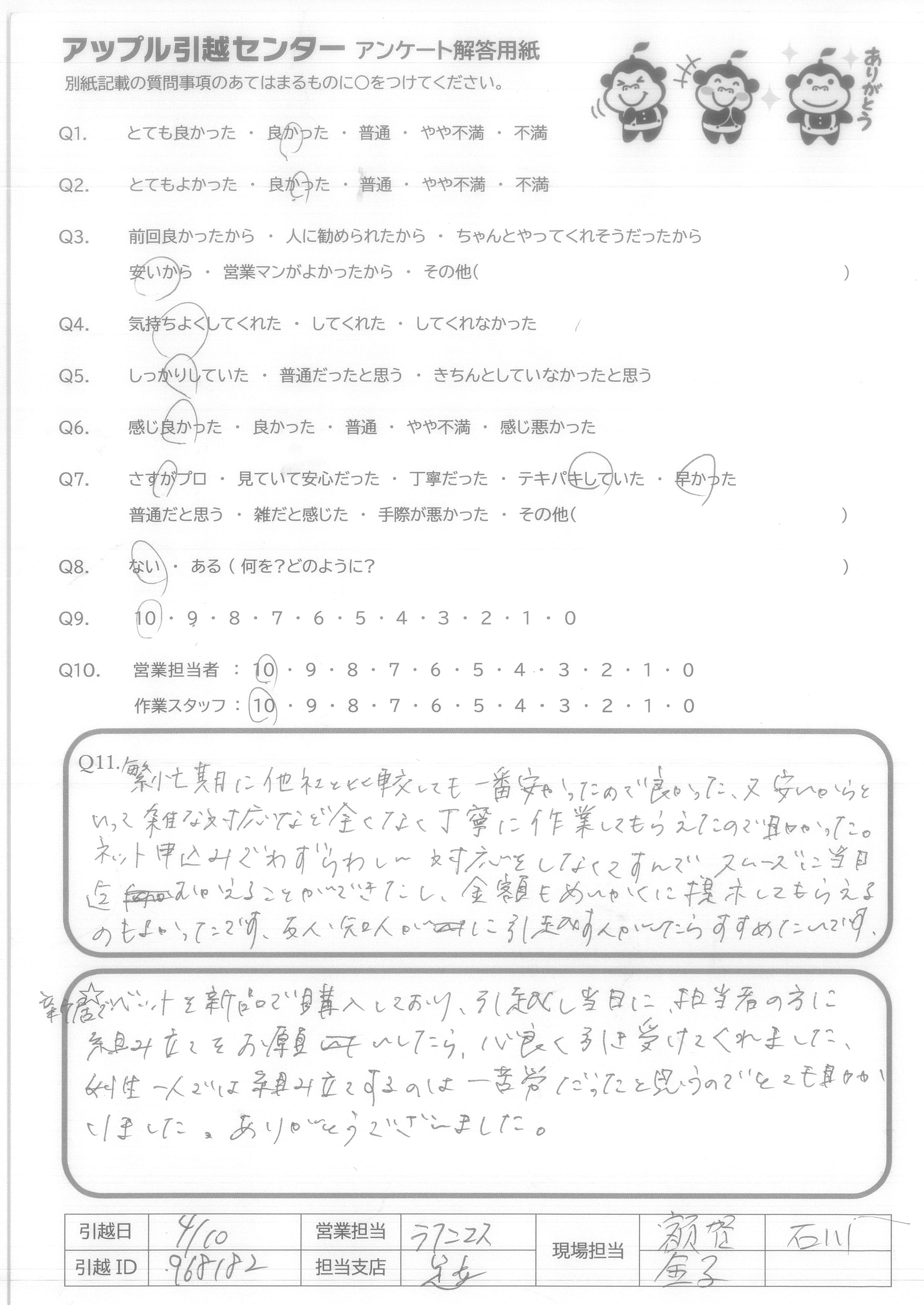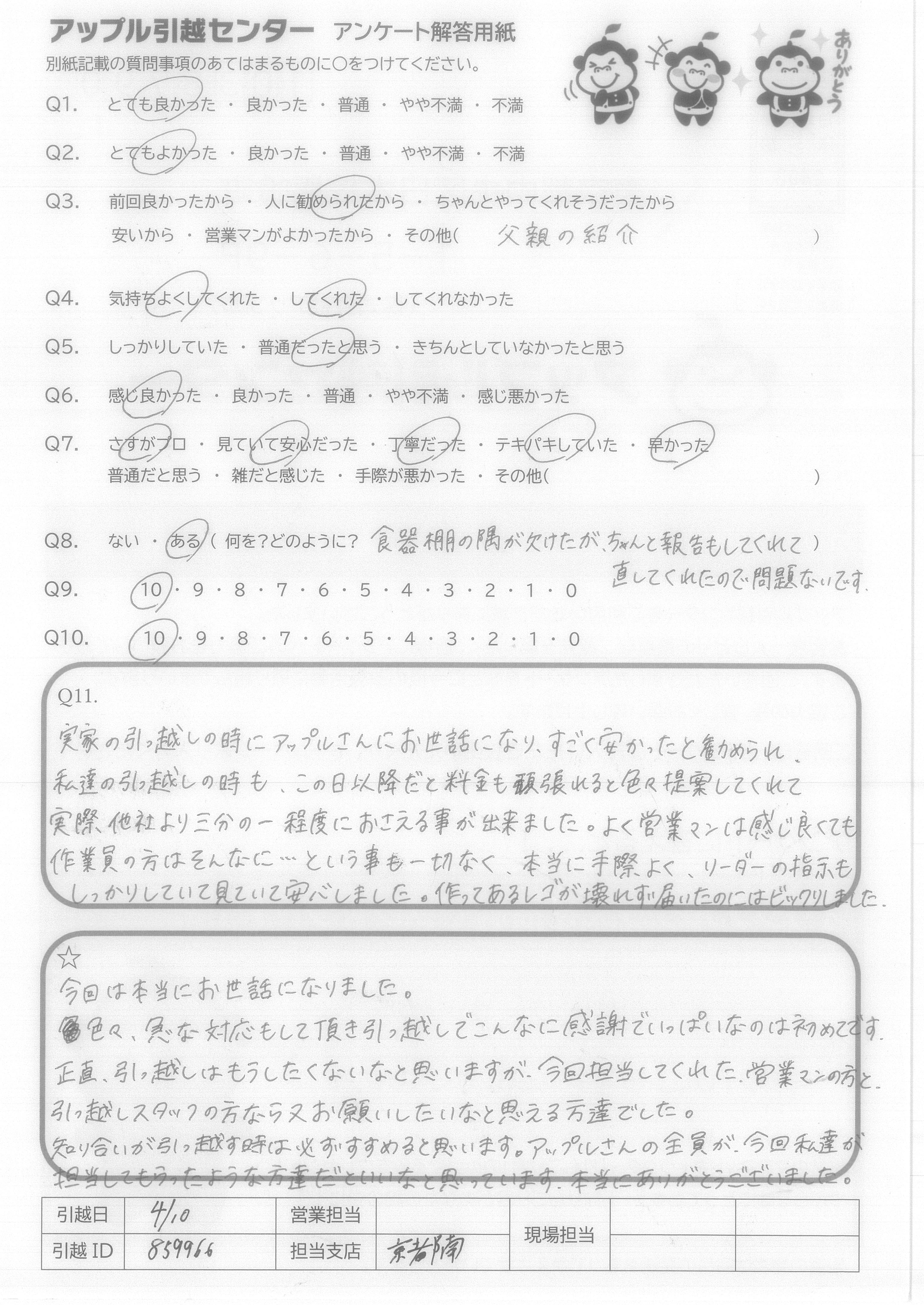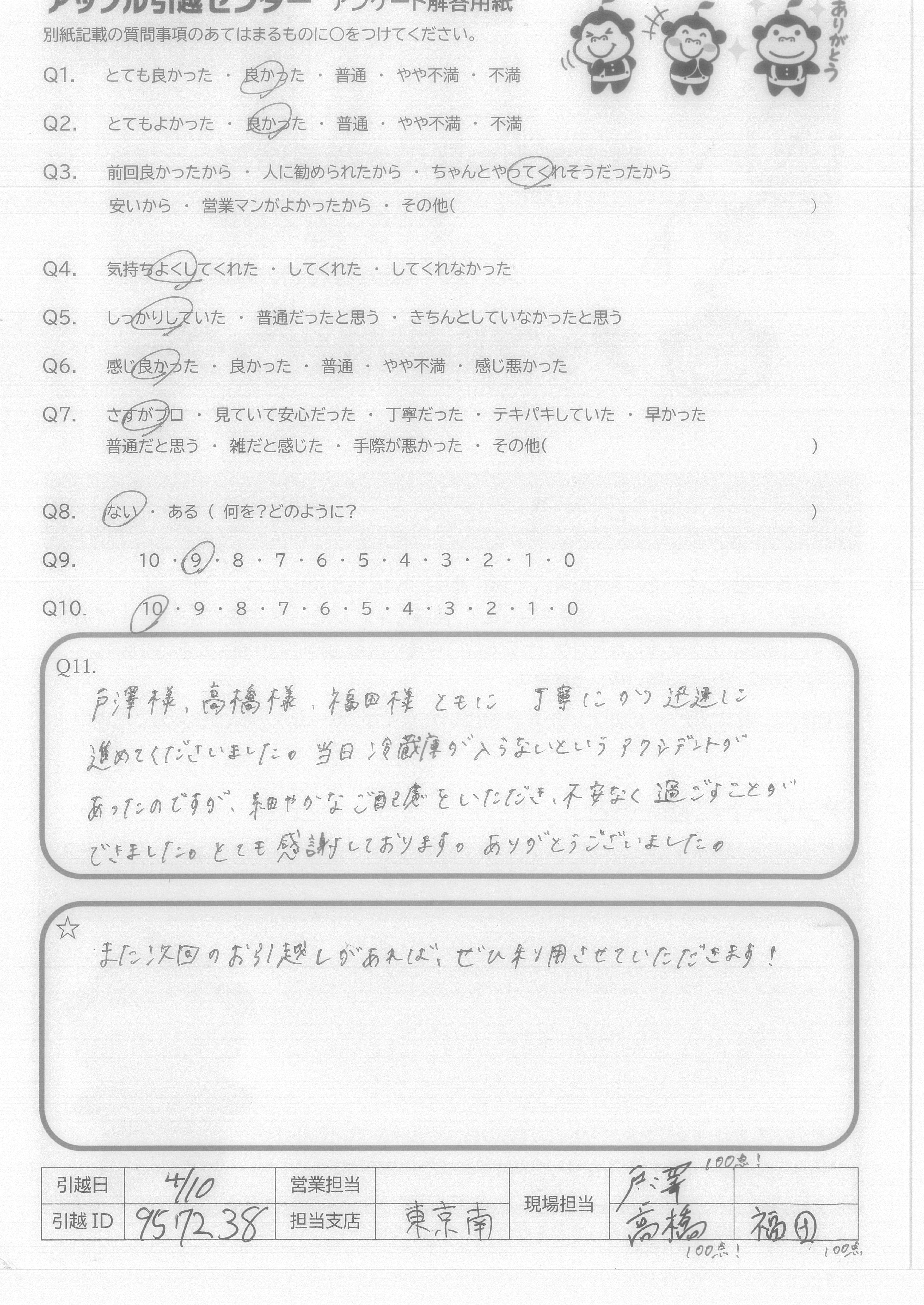 A.今回は本当にお世話になりました。 色々、急な対応もして頂き引っ越しでこんなに感謝でいっぱいなのは初めてです。 正直、引っ越しはもうしたくないなと思いますが、今回担当してくれて、営業マンの方と引っ越しスタッフの方なら又お願いしたいなと思える方達でした。 知り合いが引っ越す時は必ずすすめると思います。アップルさんの全員が、今回私達が担当してもらったような方達だといいなと思っています。本当にありがとうございました。