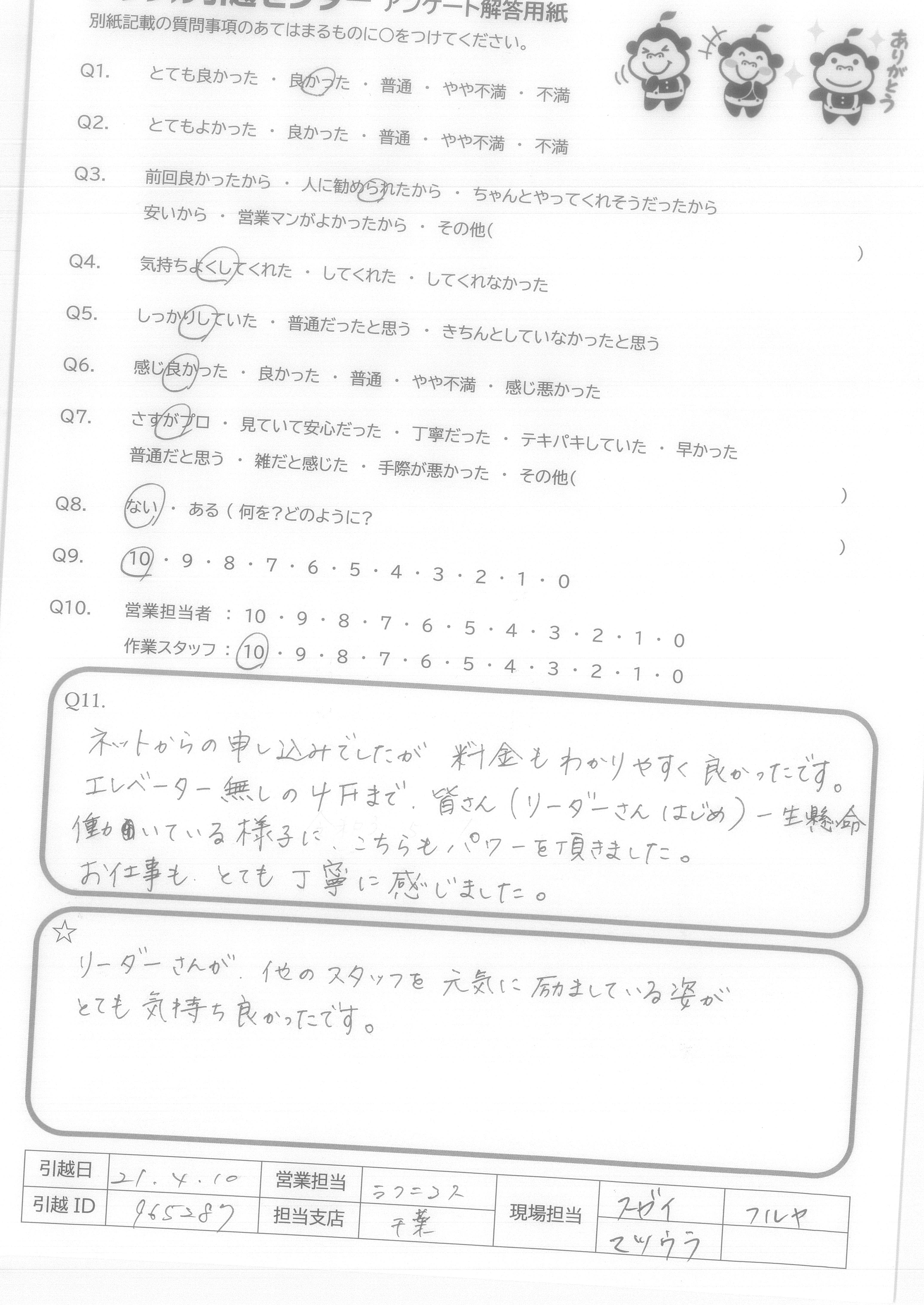 A.今回の引っ越しに際してはじめて御社にお世話になりました。マニュアル化された機械的対応ではなく、プロフェッショナルながらも人間味に溢れたお人柄と対応が最初の電話対応から引っ越し当日の作業開始〜終了まで どこのタイミングにおいても欠けることなく、素晴らしい対応でした。これを実現できる会社・人が御社なんだと、今後の自身や周囲の人達の引っ越しの際にも絶対に御社にお願いしたいと、そう強く感じています。業界を問わずこの様に最初から最後まで期待値を超えるレベルのサービスが提供できるというのは大変貴重なことだと思います。お一人一人の真心が滲み出ていました。作業中、何度か良い意味で、まるで家族か友人に引っ越しを手伝いに来てもらってるような「心地よさ」を感じました。それはプロフェッショナルな円滑な作業に、ほっとする安心感と丁寧な対応が兼ね備わったサービスだったからに違いありません。今回ご担当下さった電話対応の本園様、現場で作業を担当して下さった清水様、徳里様、高西様にこの感謝の気持ちを是非お伝え頂けると幸いです。本当にありがとうございました。 (アンケート回答用紙を頂いたのですが、こちらのオンラインからも可能と拝見しましてオンラインにてアンケート回答させていただきました。念の為、手元にあるアンケート用紙の内容をこちにも記載しておきます。引っ越し日 4/9、営業担当: 本園千恵様、担当支店: 江戸川、現場担当: 清水様、徳里様、高西様)