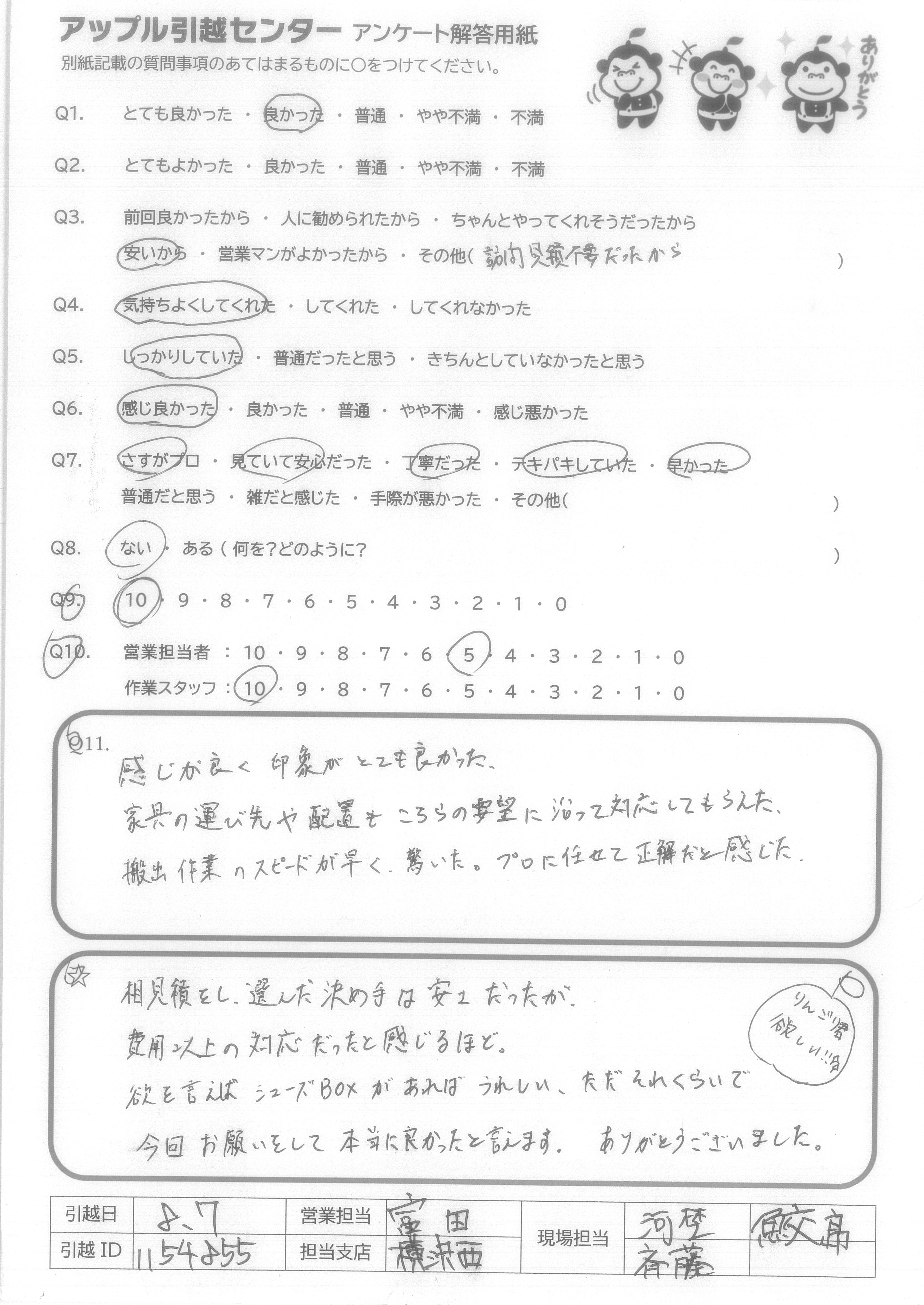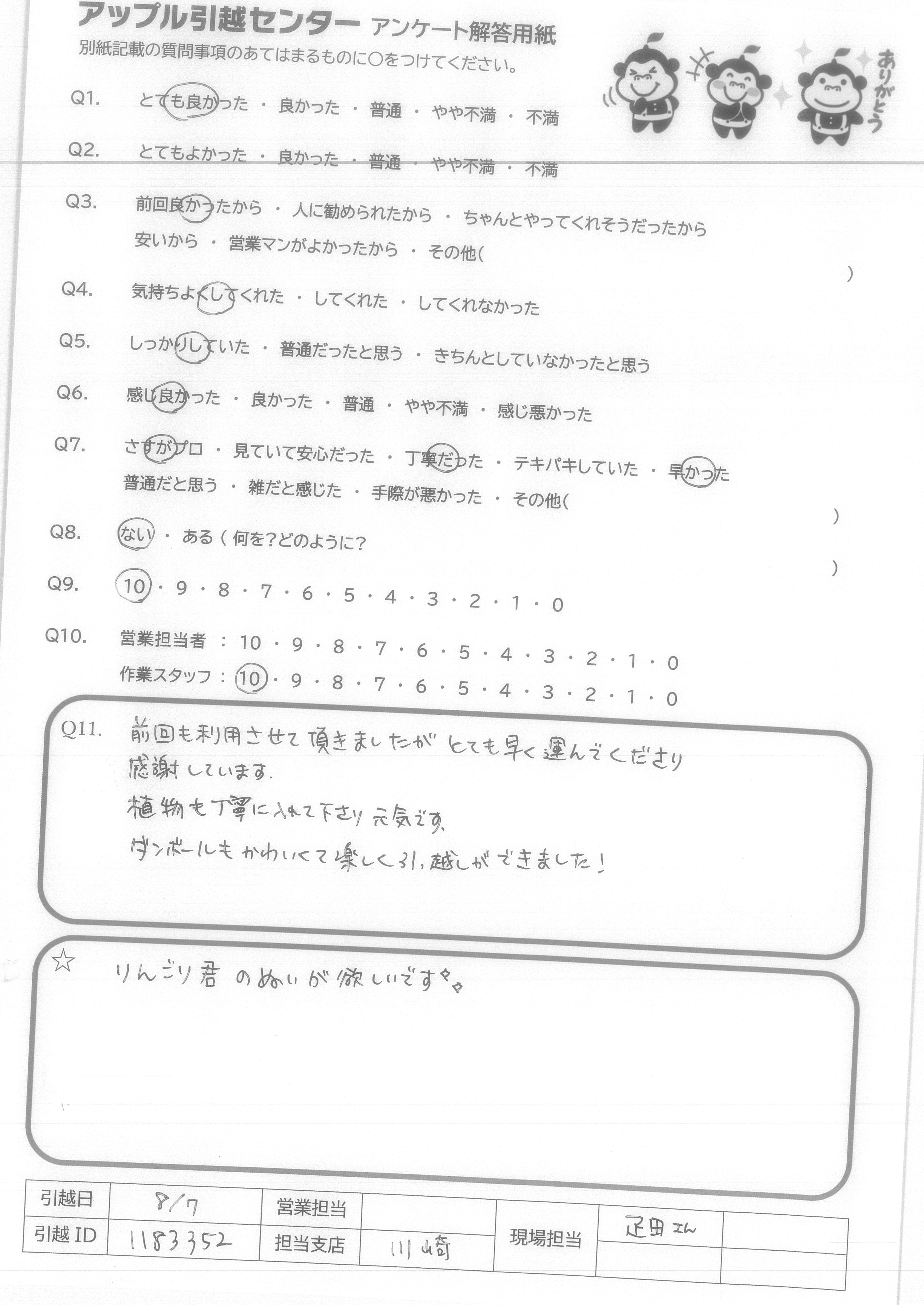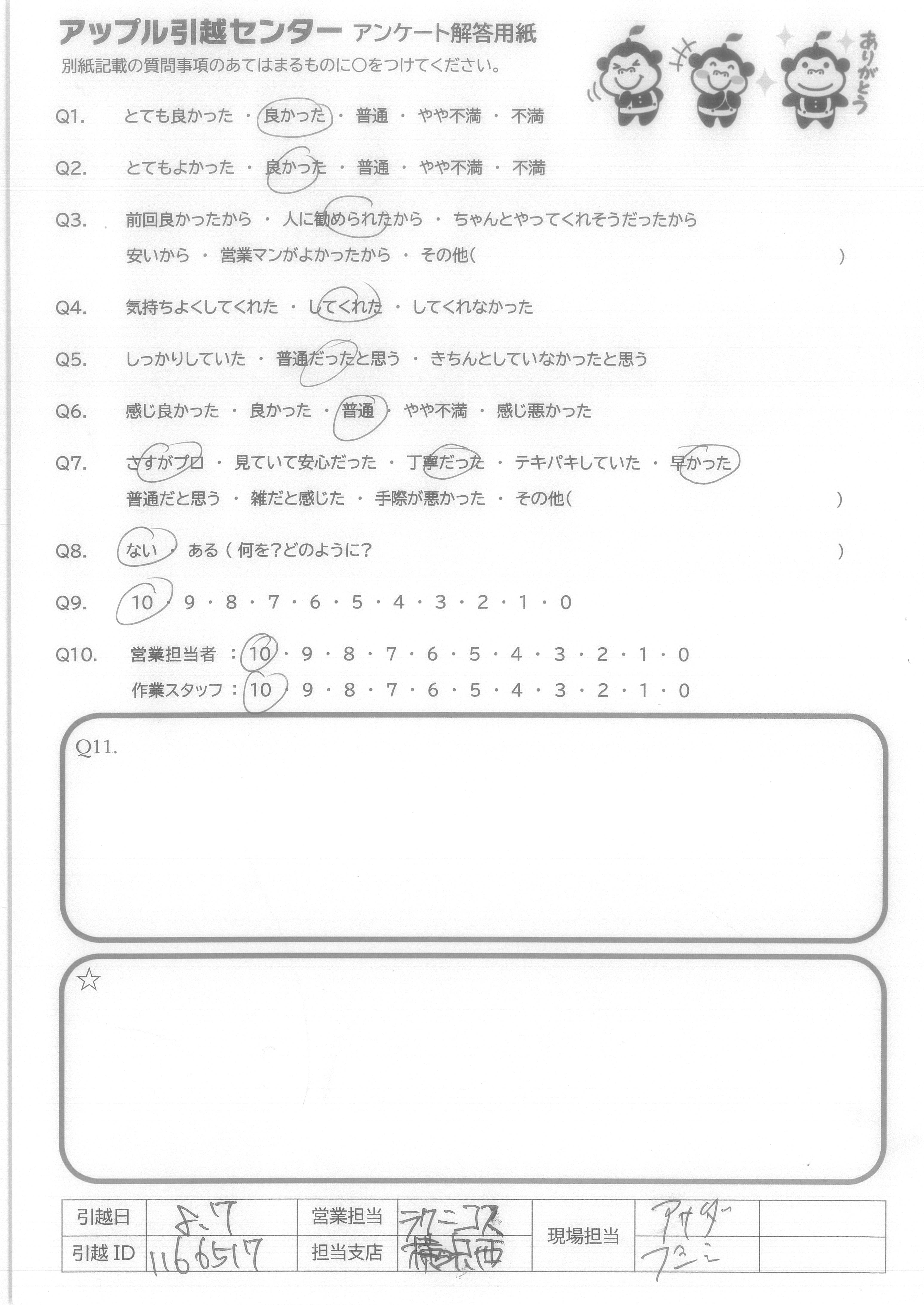 A.この度はありがとうございました。 前回、別の業者の引越しをお願いして嫌な気持ちになりましたが、アップルさんは安心しておまかせできました。