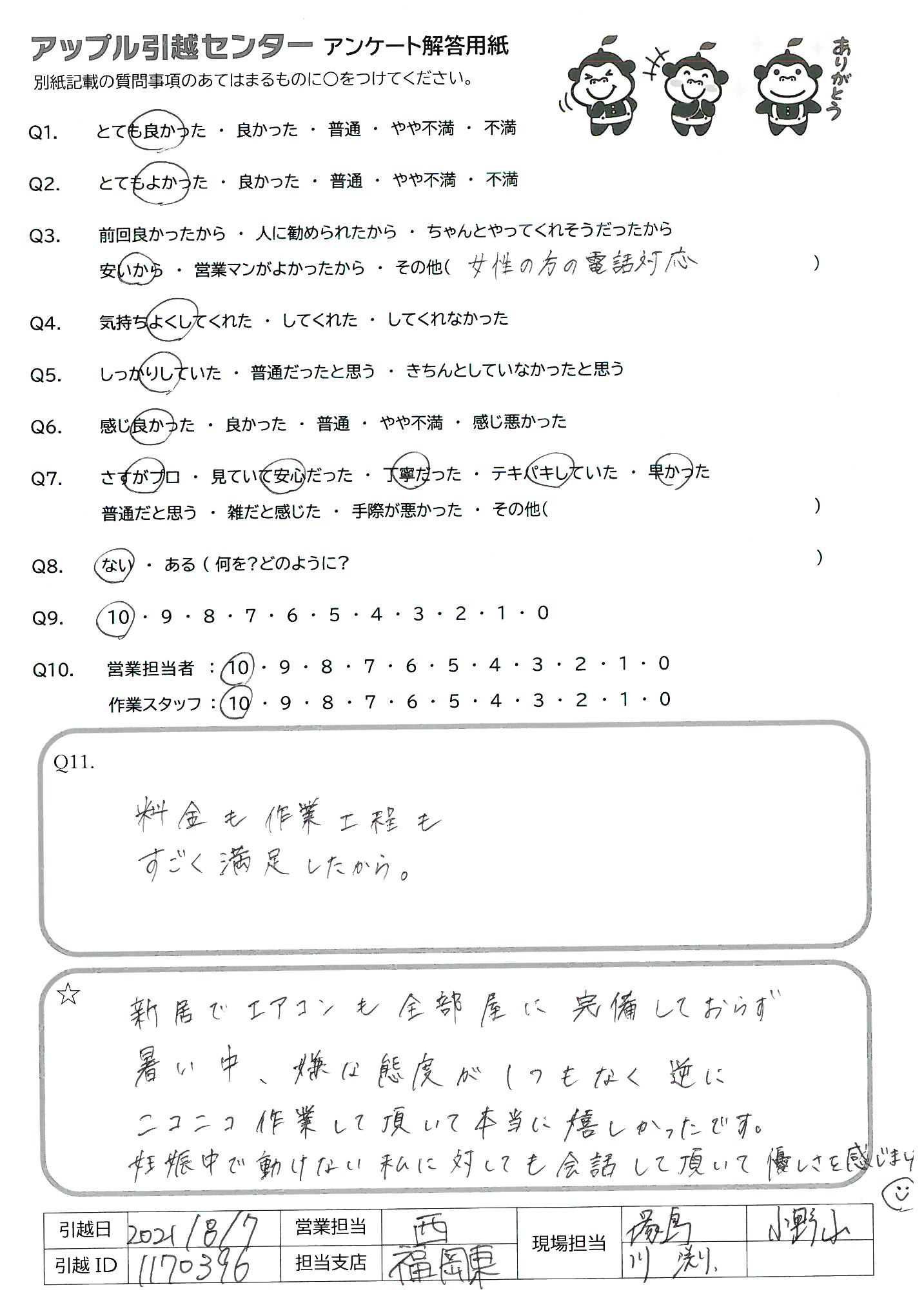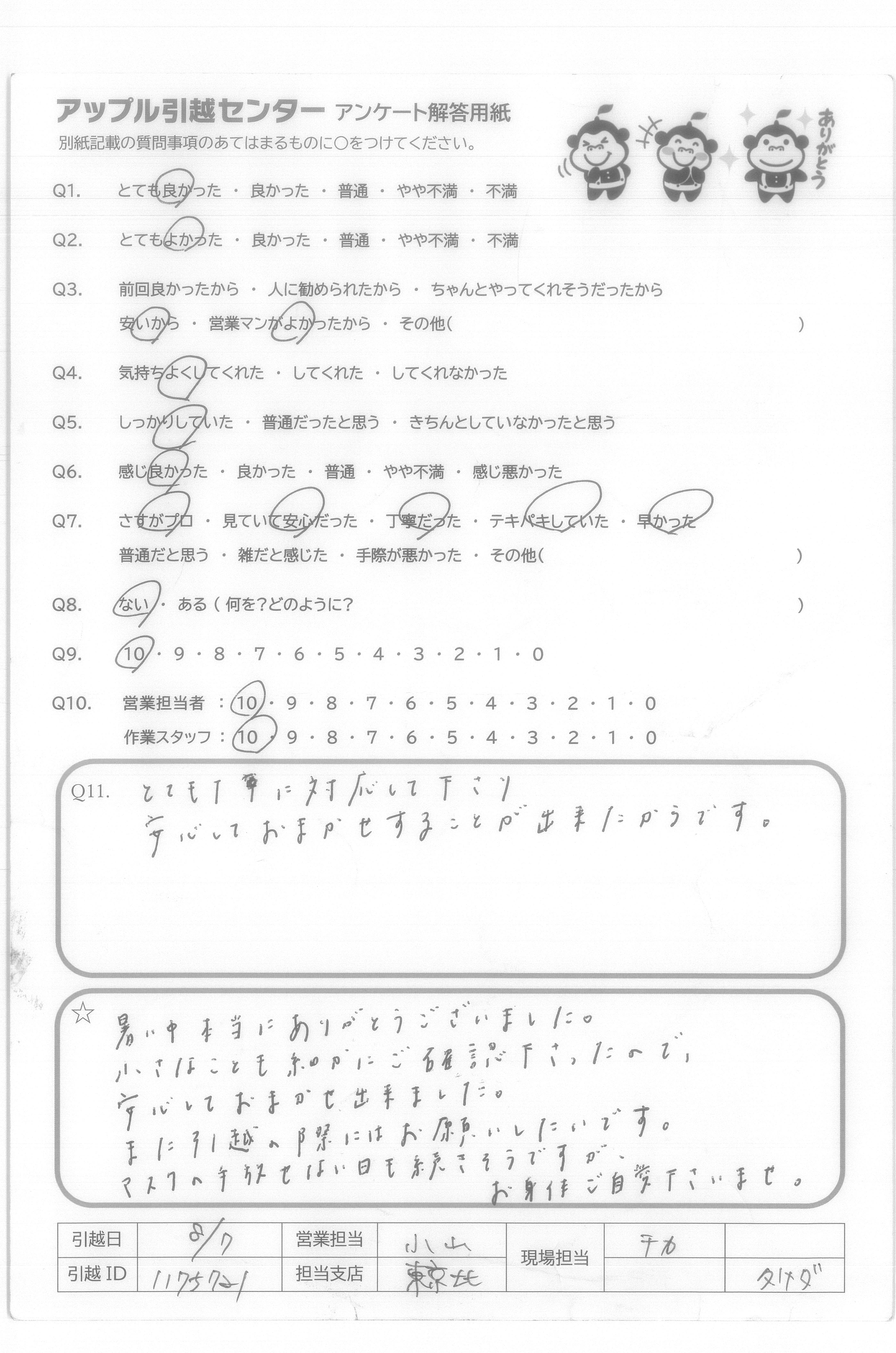A.暑い中本当にありがとうございました。 小さなことも細かにご確認下さったので、安心しておまかせ出来ました。 また引越の際にはお願いしたいです。 マスクの手放せない日も続きそうですが、お身体ご自愛下さいませ。