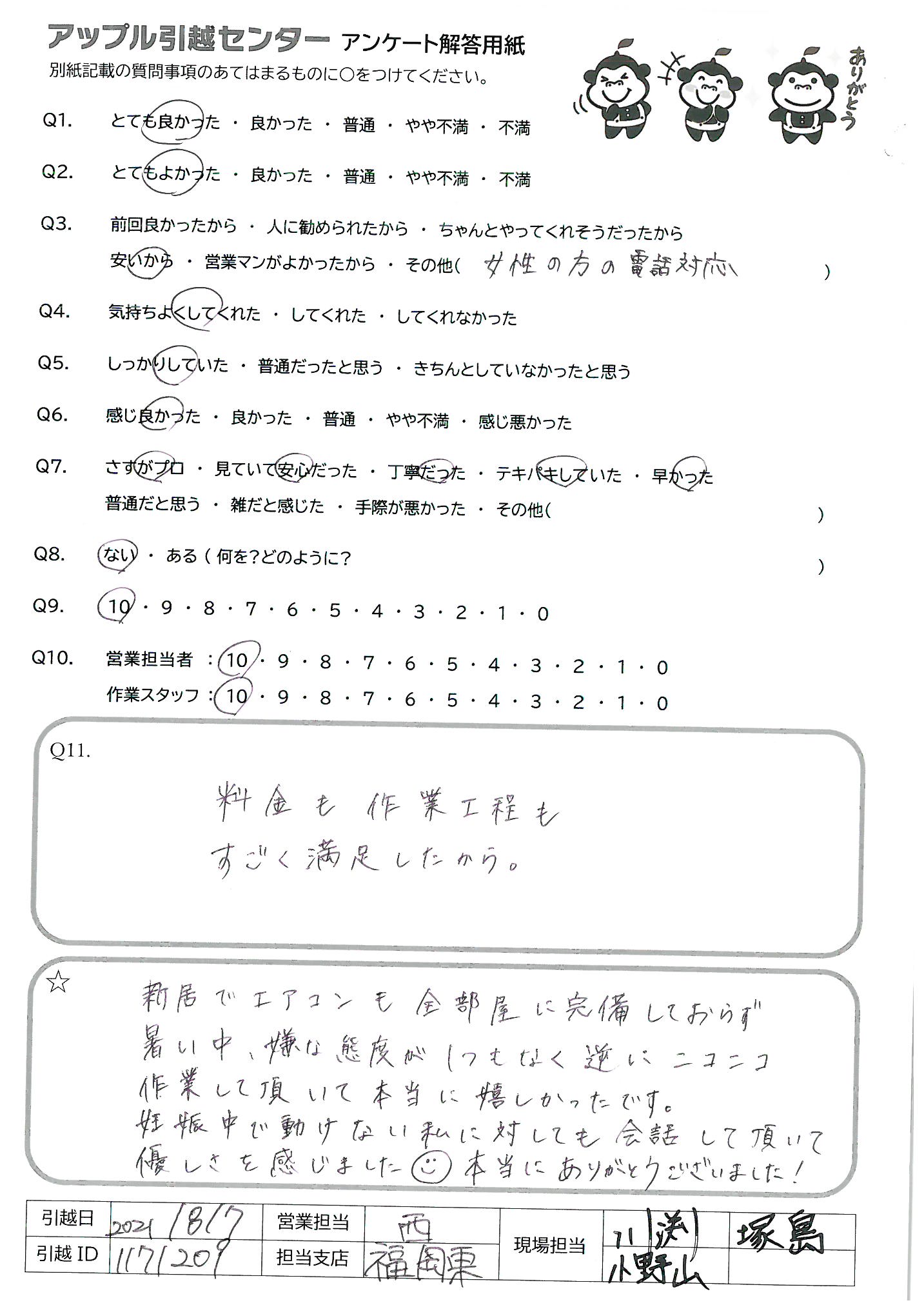 引越し日:2021年08月07日 エリア:神奈川県川崎市中原区