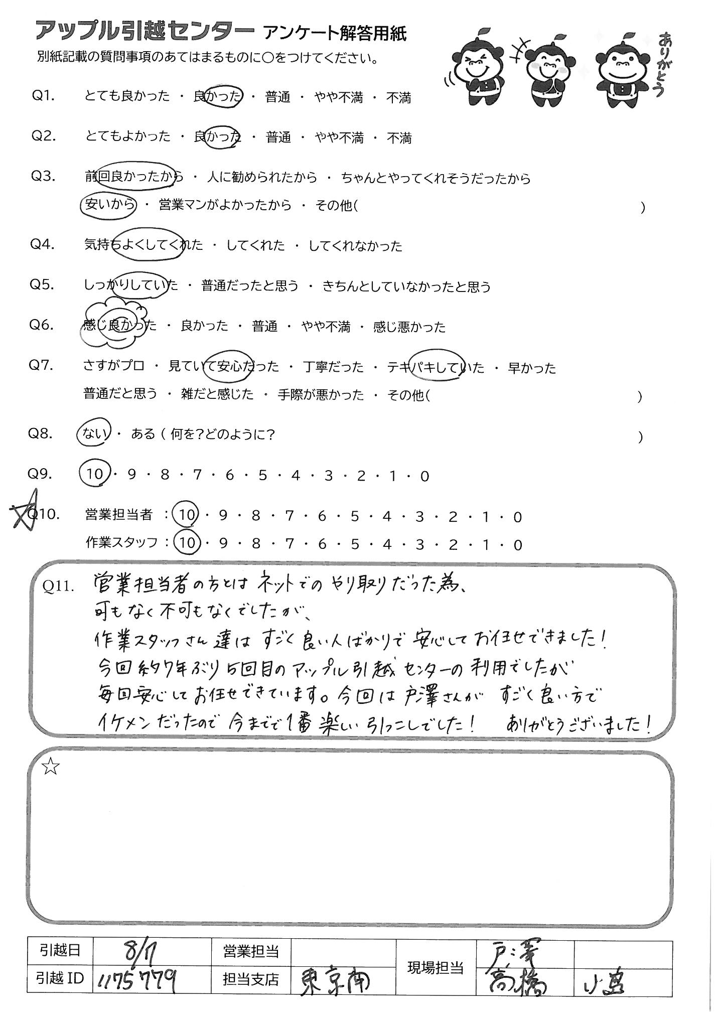 A.営業担当者の方とはネットでのやり取りだった為、 可もなく不可もなくでしたが、 作業スタッフさん達はすごく良い人ばかりで、安心してお任せできました! 今回約7年ぶり5回目のアップル引越センターの利用でしたが毎回安心してお任せできています。今回は戸澤さんがすごく良い方でイケメンだったので今までで1番楽しい引っこしでした!ありがとうございました!