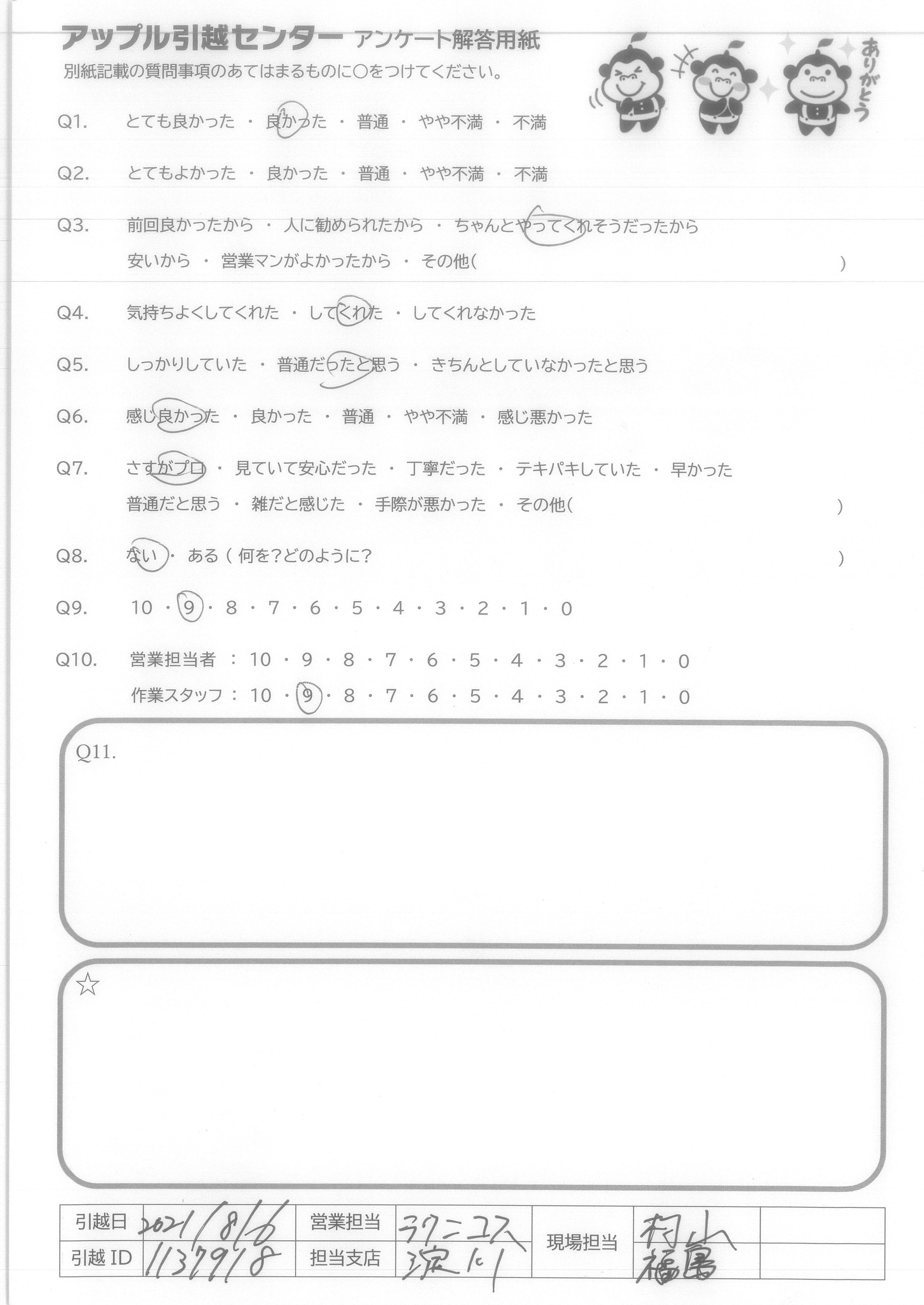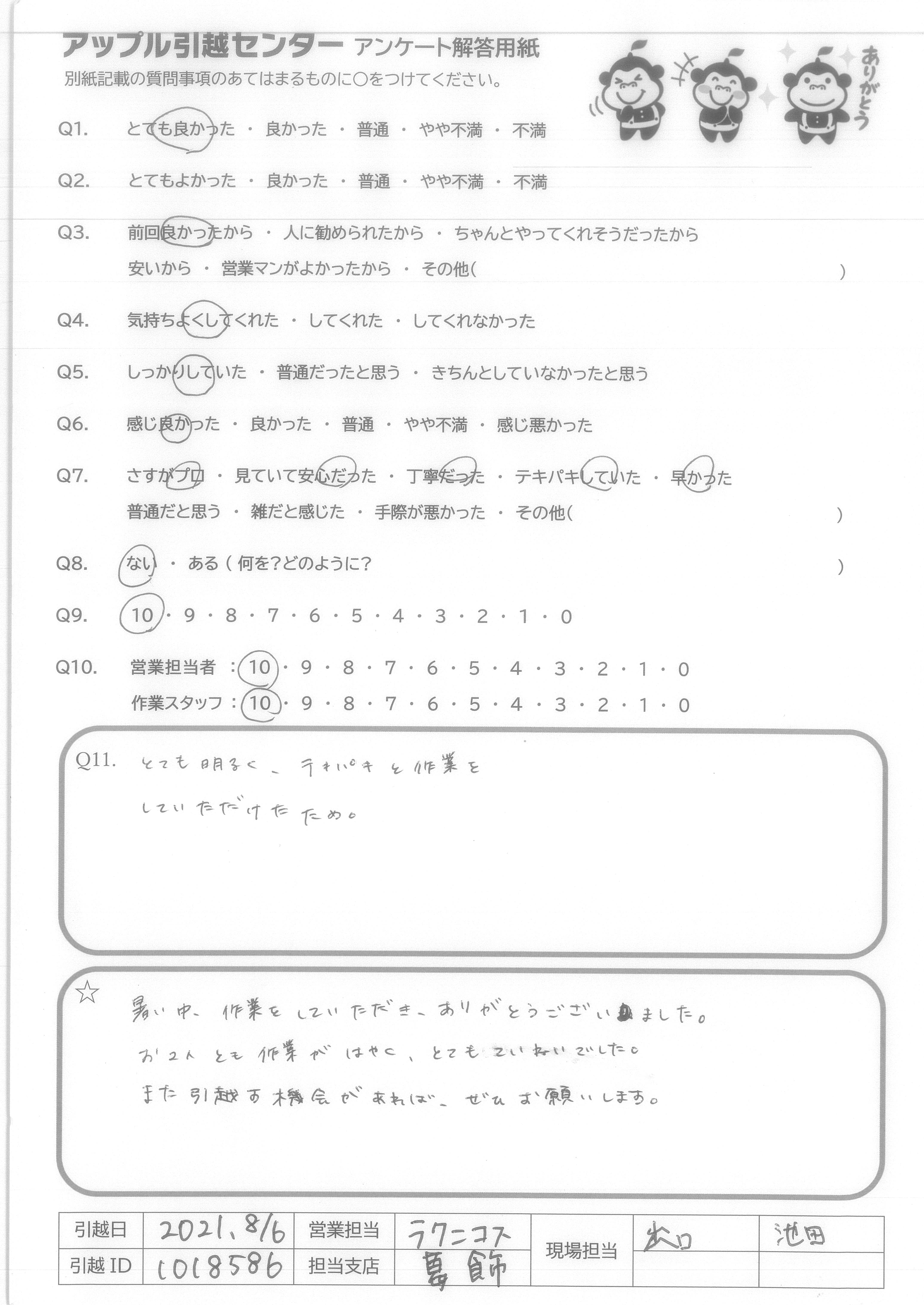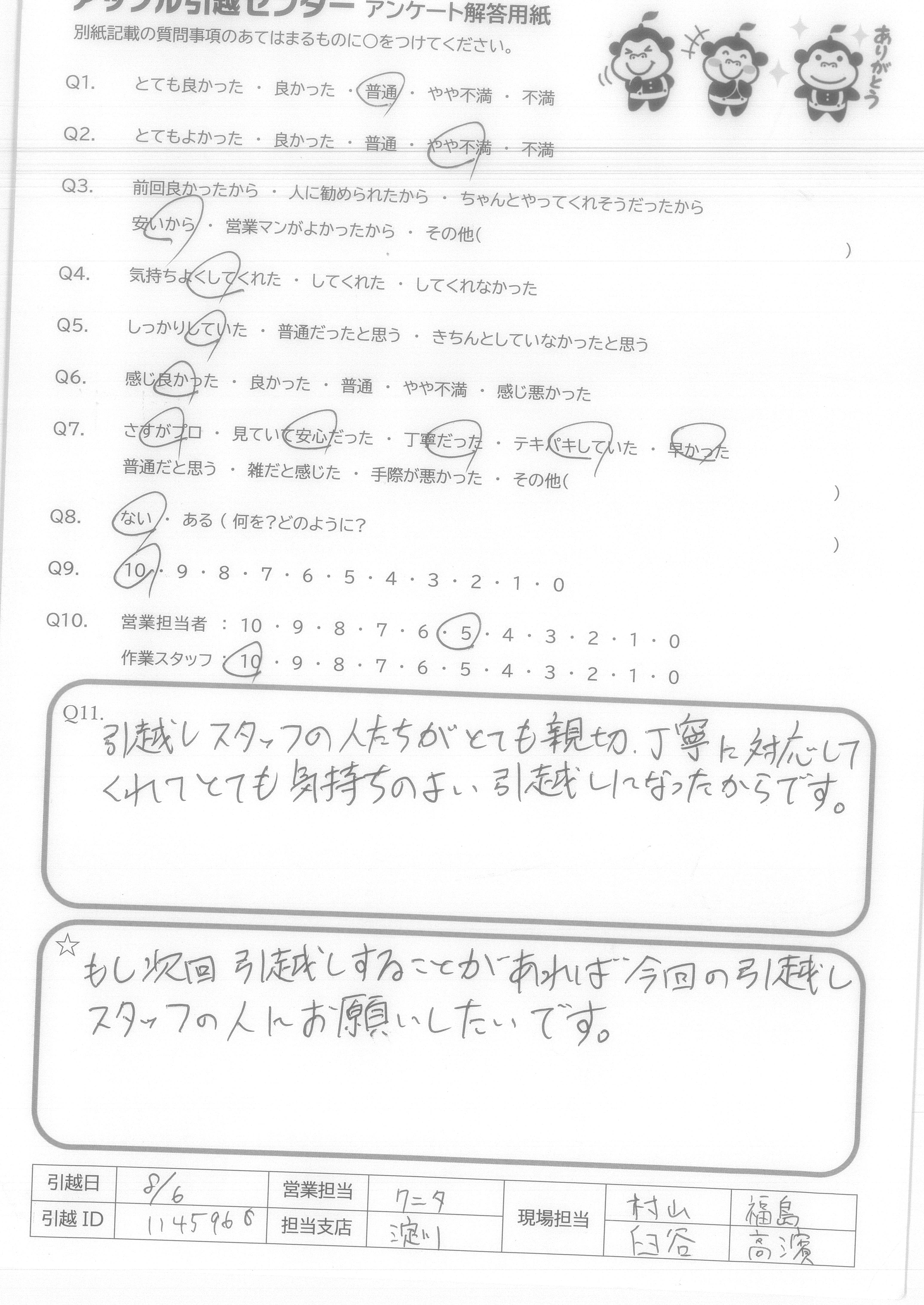 A.暑い中、作業をしていただき、ありがとうございました。 お2人ともとても作業がはやく、とてもていねいでした。 また引越す機会があれば、ぜひお願いします。