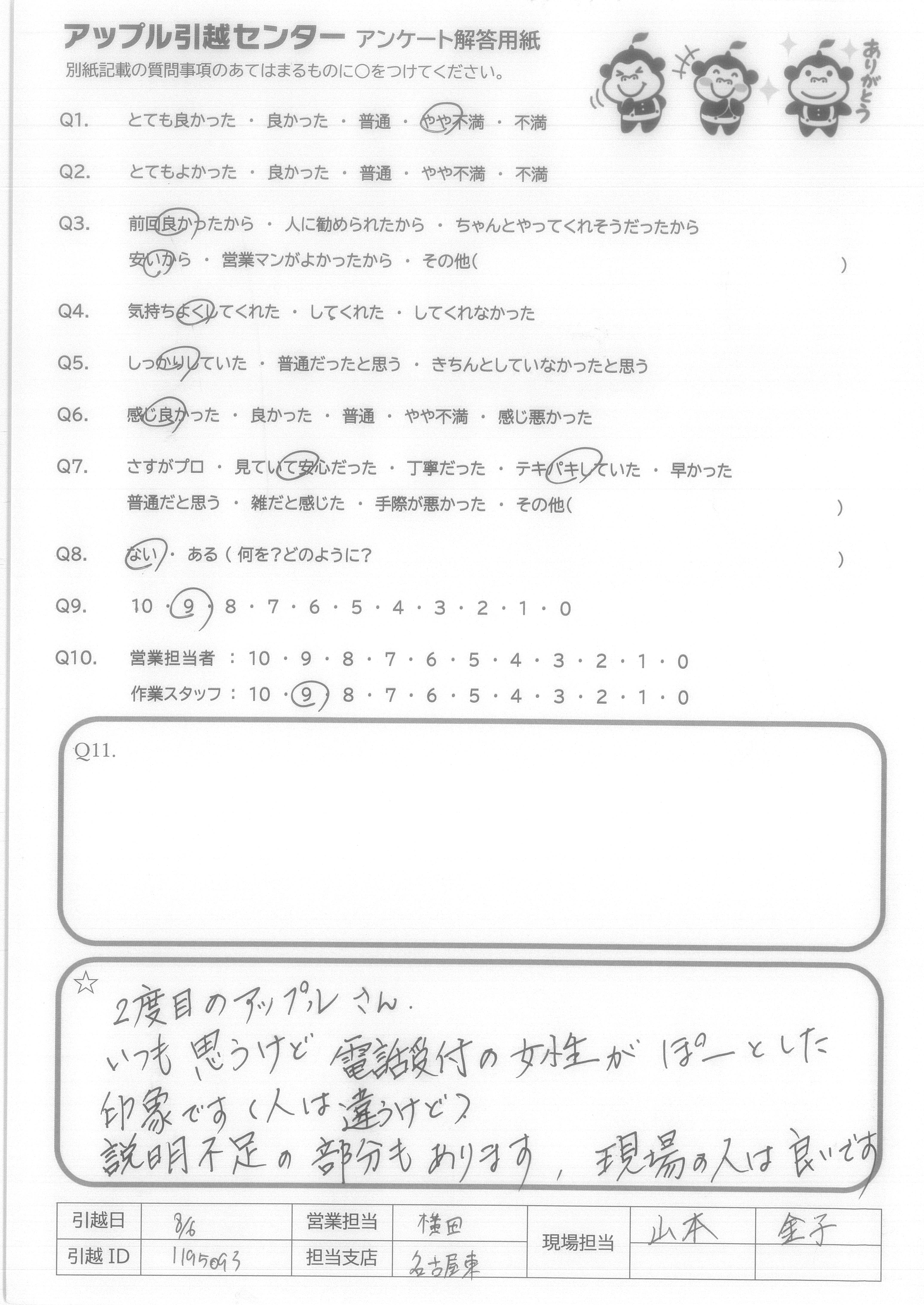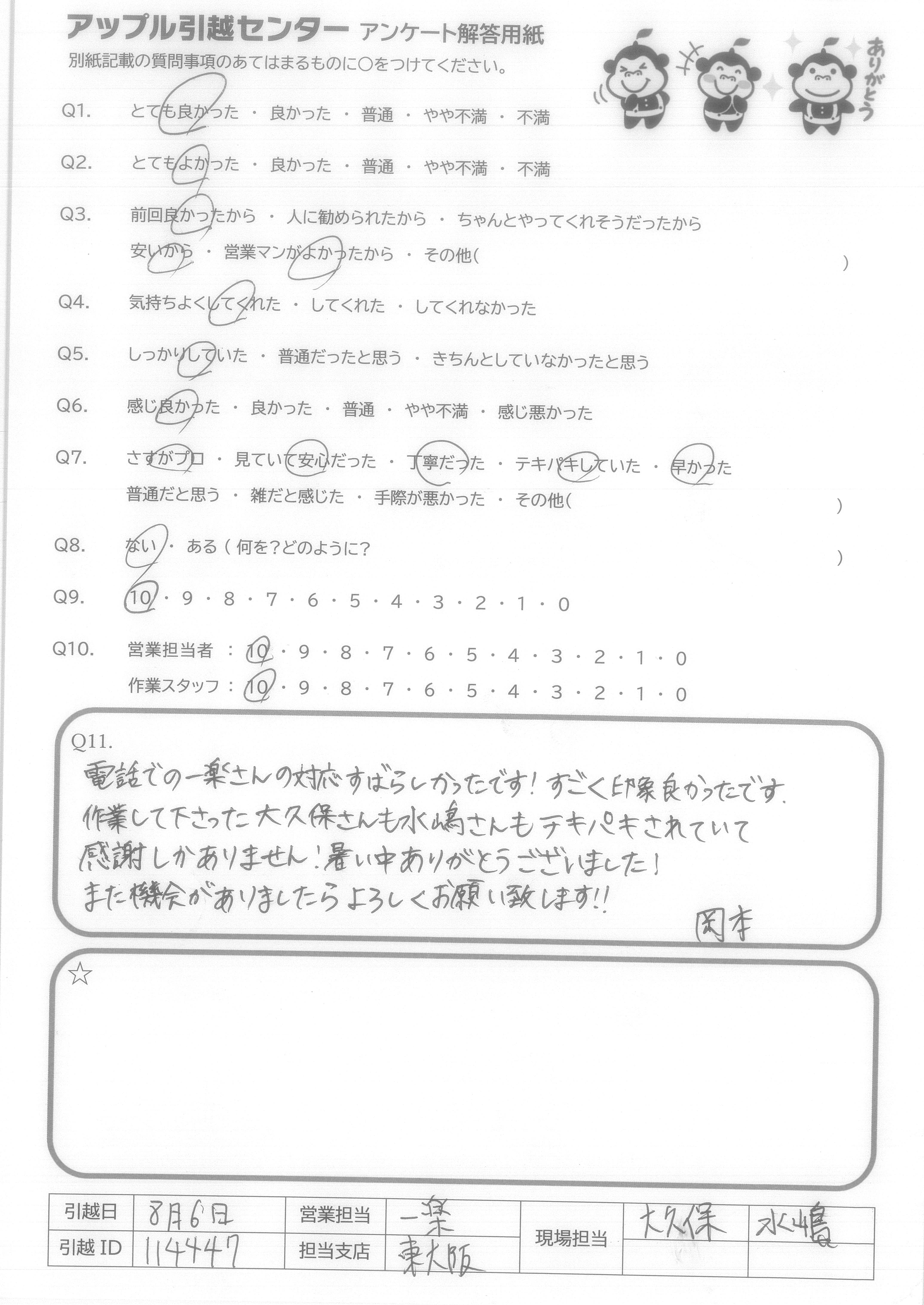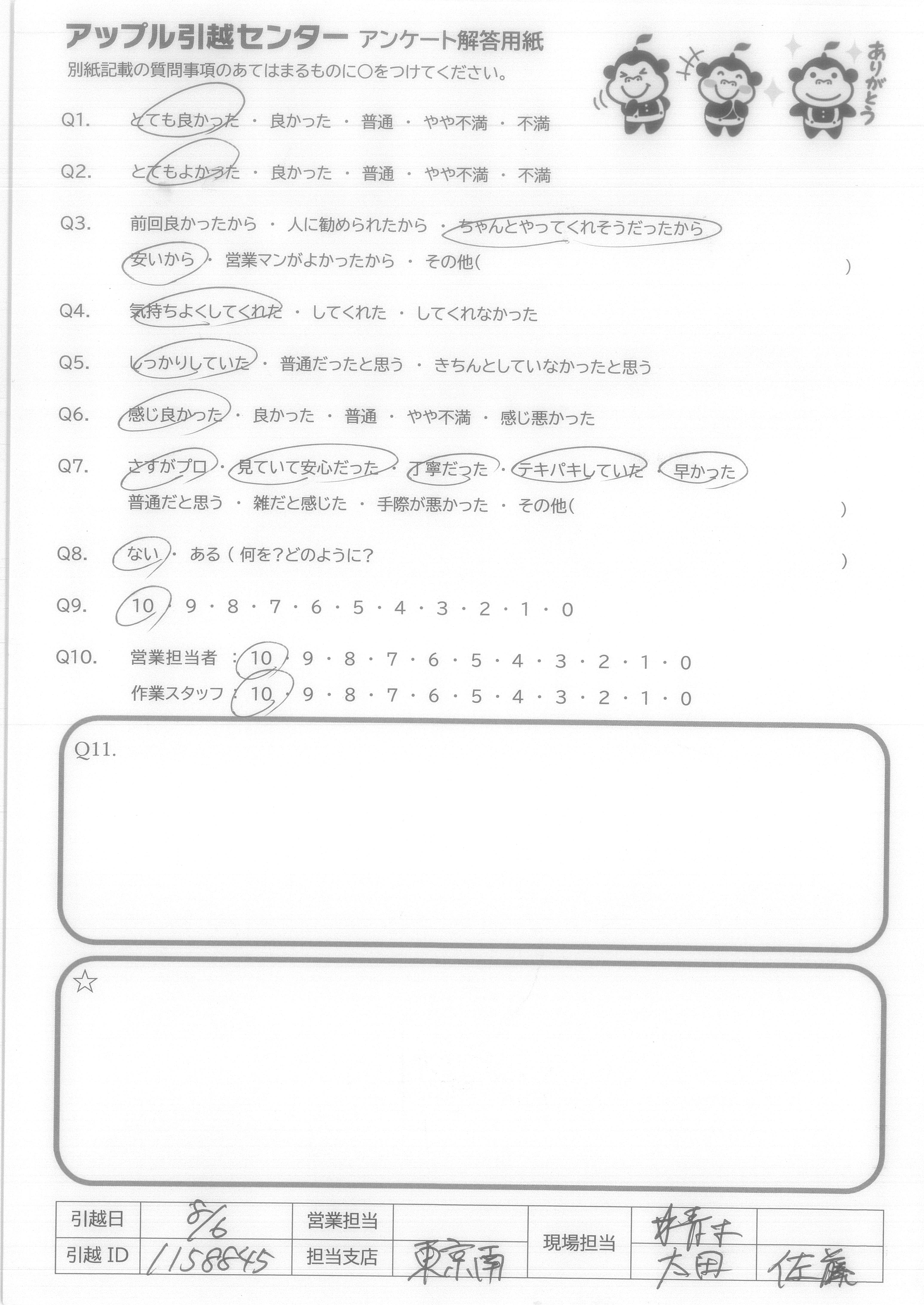A.暑い中、作業をしていただき、ありがとうございました。 お2人ともとても作業がはやく、とてもていねいでした。 また引越す機会があれば、ぜひお願いします。