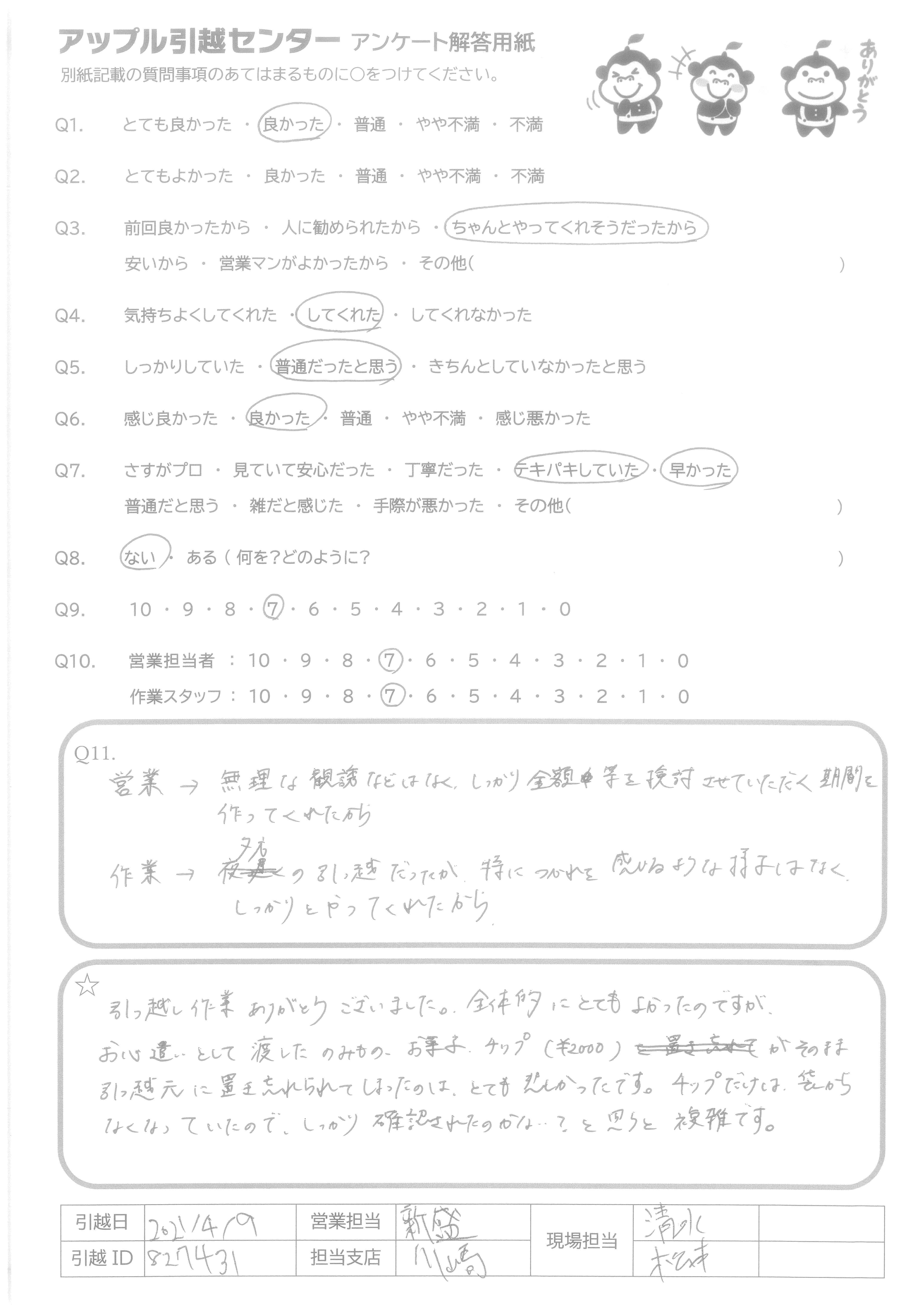A.引っ越し作業ありがとうございました。全体的にとてもよかったのですが、お心遣いとして渡したのみもの、お菓子、チップ(¥2000)がそのまま引っ越元に置き忘れられてしまったのは、とても悲しかったです。チップだけは袋からなくなっていたので、しっかり確認されたのかな・・・?と思うと複雑です。