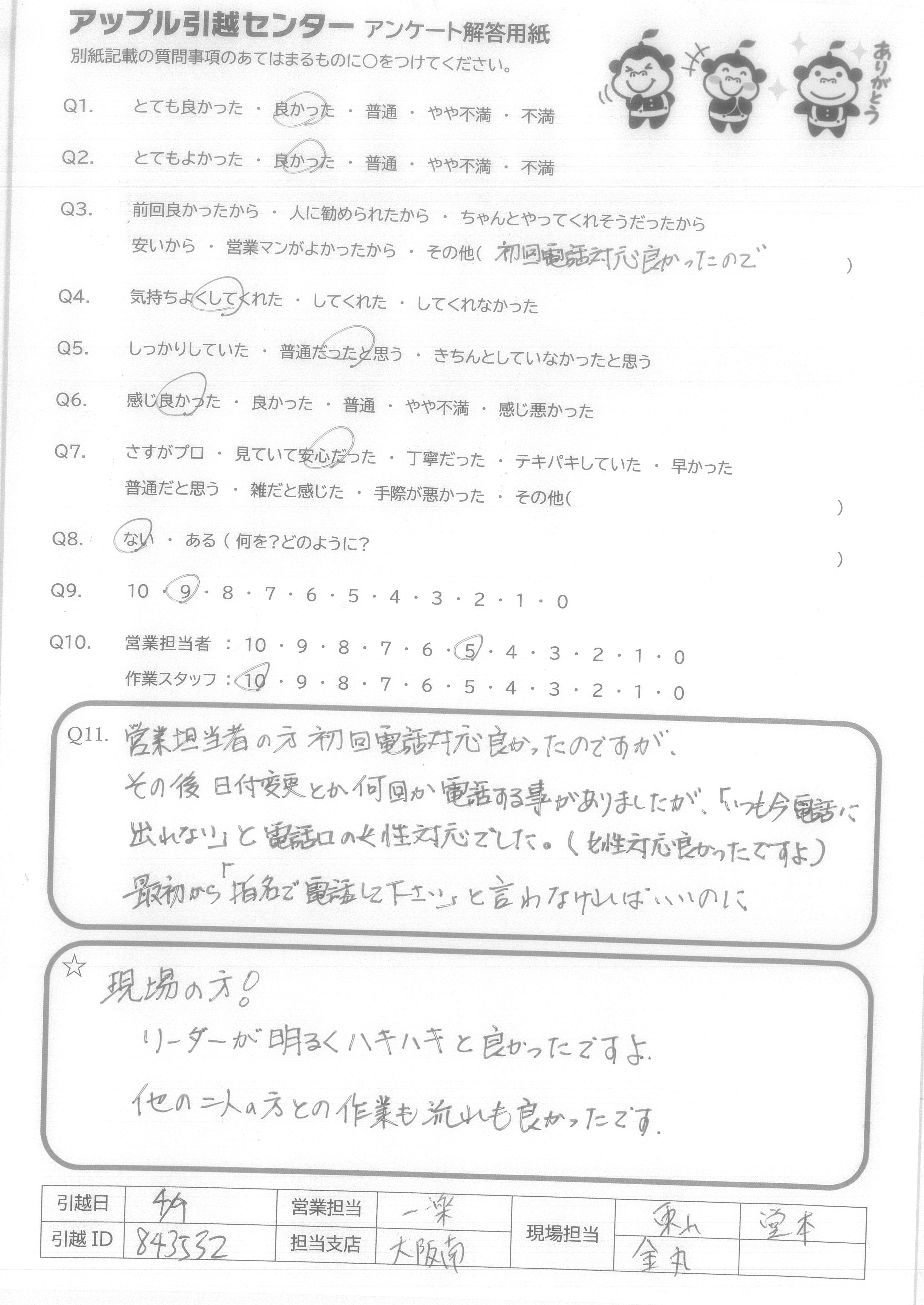 A.電話でこちらの要望に対し、コールセンターの方がとても親見になって対応してくださり、とても安心しました。(確かオオルイ?さんだったと思います。)ありがとうございました! 家族、友人に安心してすすめられる引越し業者ですね。 これからもがんばってください。