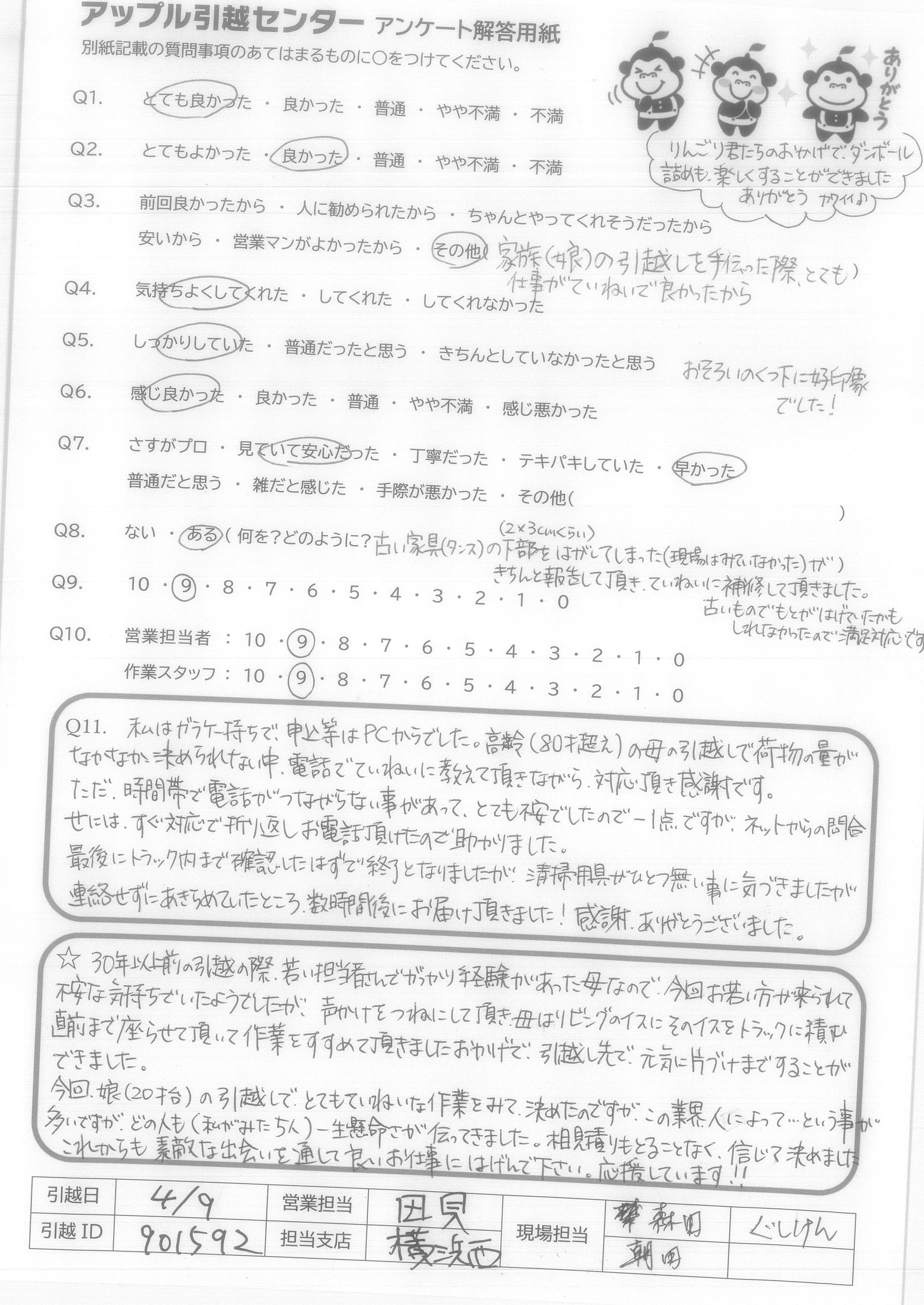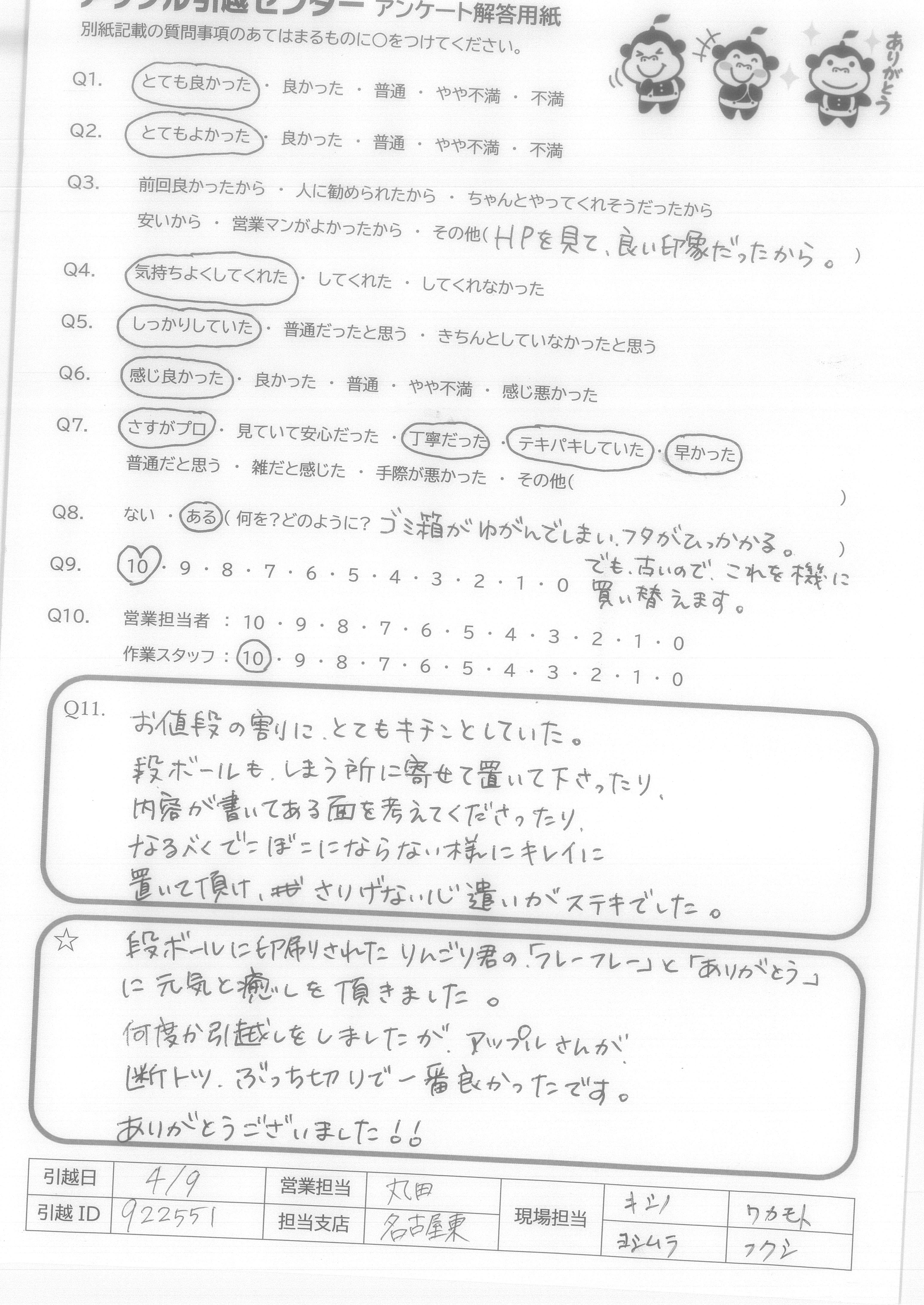 A.荷物がかなり多いと思っていましたが、テキパキと素早く運んでいただけて良かったです。HPの入力のみのためつみ残しを不安に思っていましたが、全てはこんでもらえて助かりました。見積書の発行についても対応いただけて良かったです。ダンボールもかわいくて、次回があればぜひまたお願いしたいと思えました。ありがとうございました。