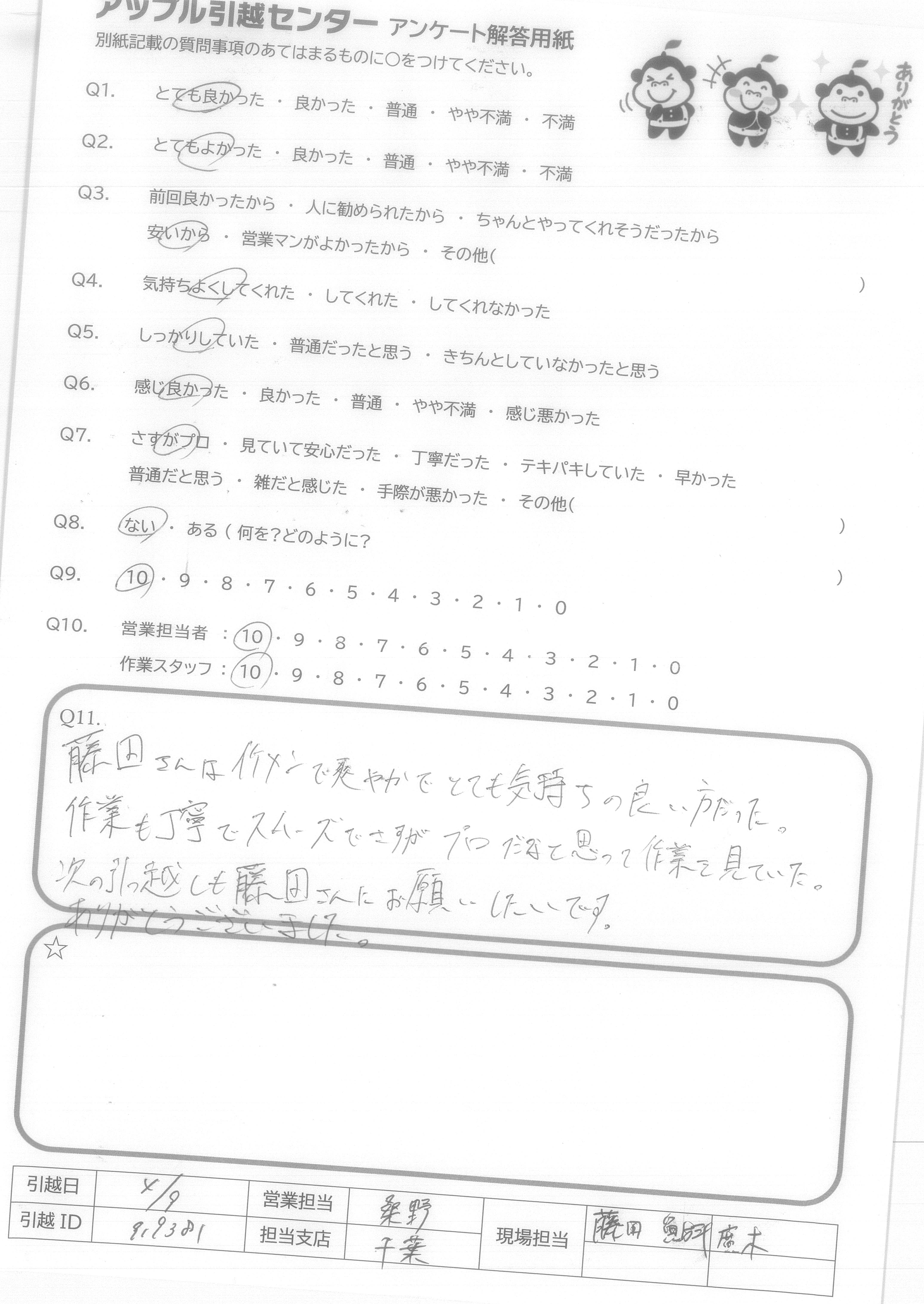 A.藤田さんはイケメンで爽やかでとても気持ちの良い方だった。 作業も丁寧でスムーズでさすがプロだなと思って作業を見ていた。 次の引っ越しも藤田さんにお願いしたいです。 ありがとうございました。