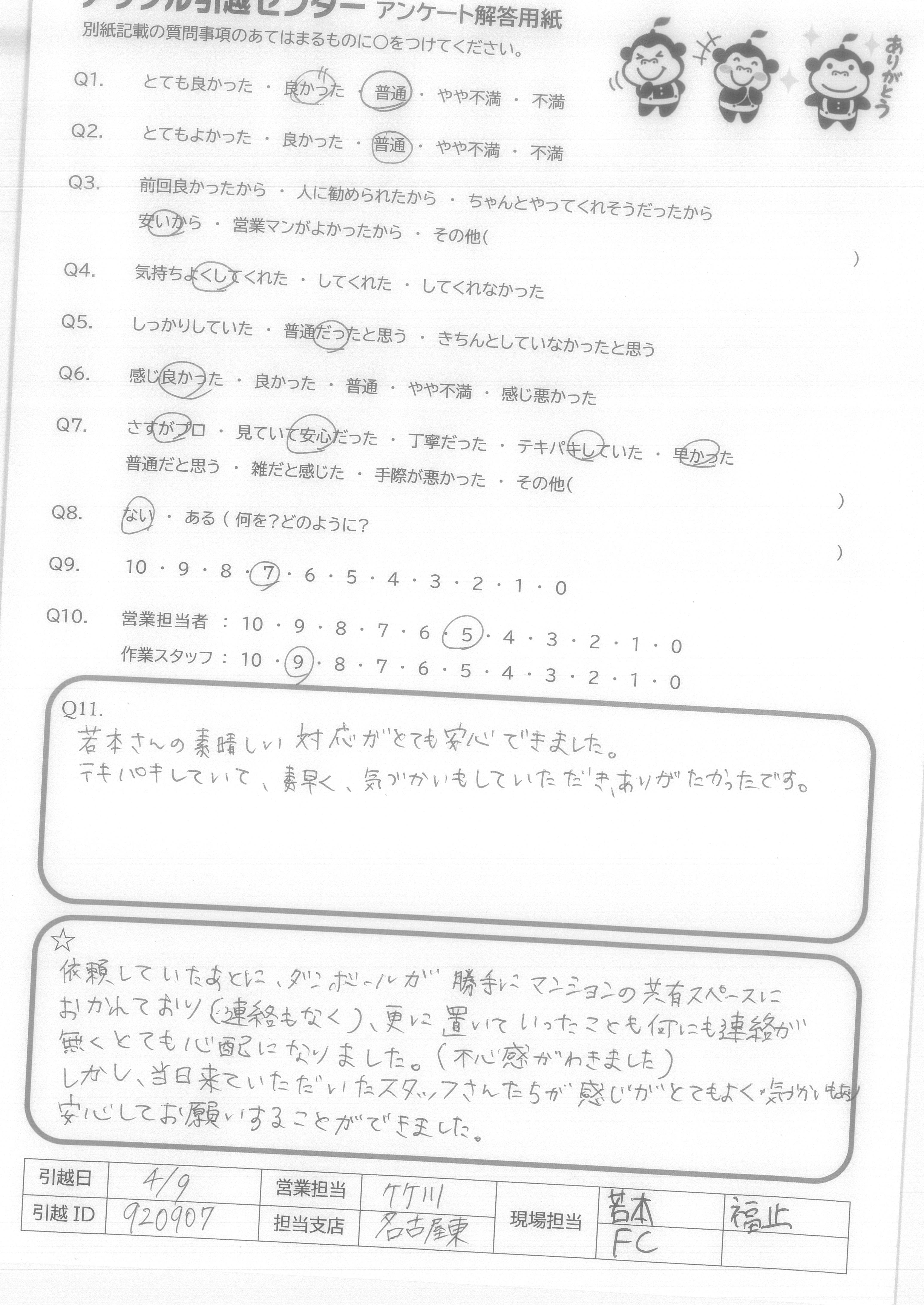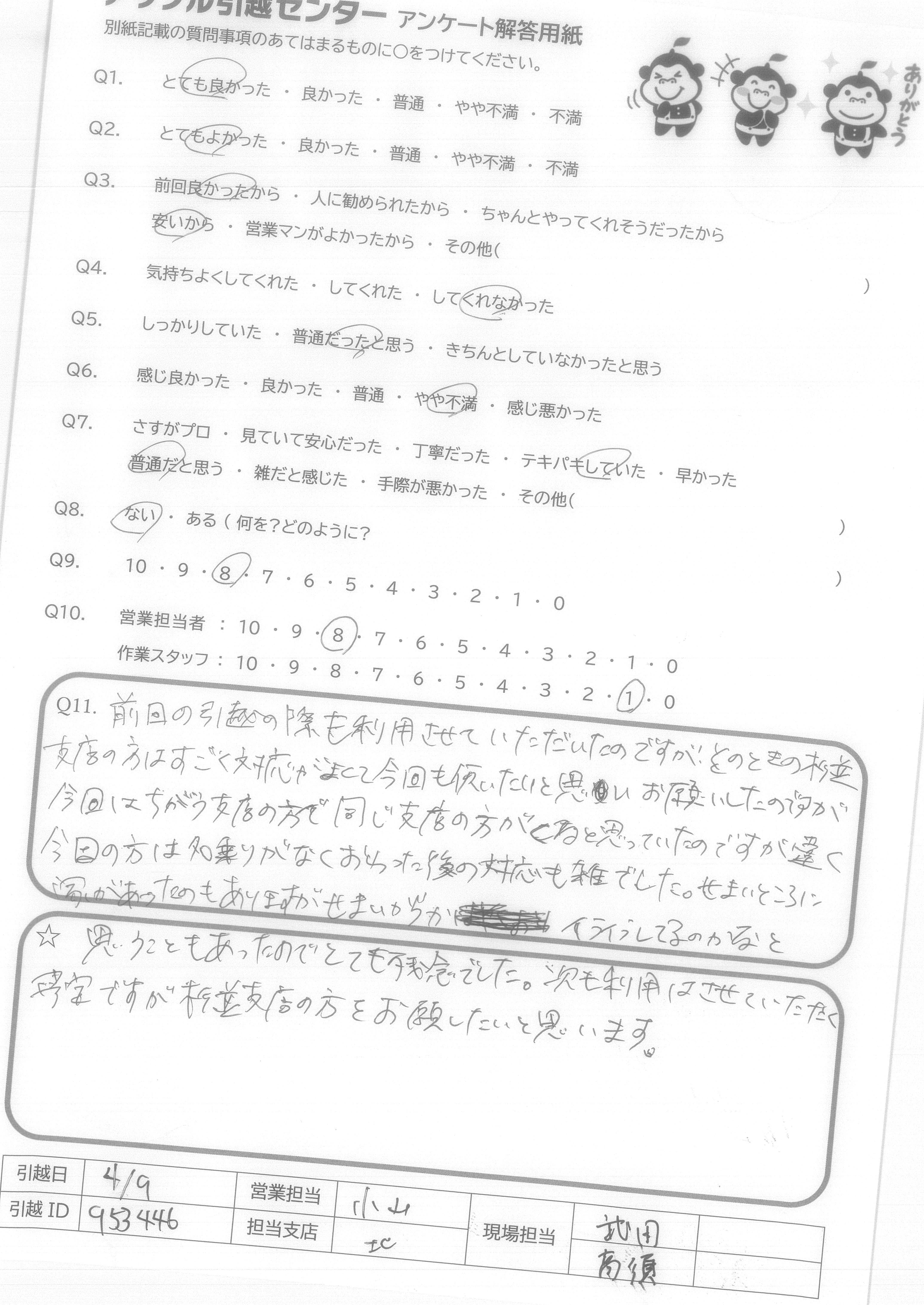 A.前回の引越の際も利用させていただいたのですが、そのときの杉並支店の方はすごく対応がよくて今回も使いたいと思いお願いしたのですが今回はちがう支店の方で同じ支店の方がくると思っていのですが違く今回の方は名乗りがなくおわった後の対応も雑でした。せまいところに家があったのもありますがせまいからかイライラしてるのかなと思うこともあったのでとても残念でした。次も利用はさせていただく予定ですが杉並支店の方をお願したいと思います。