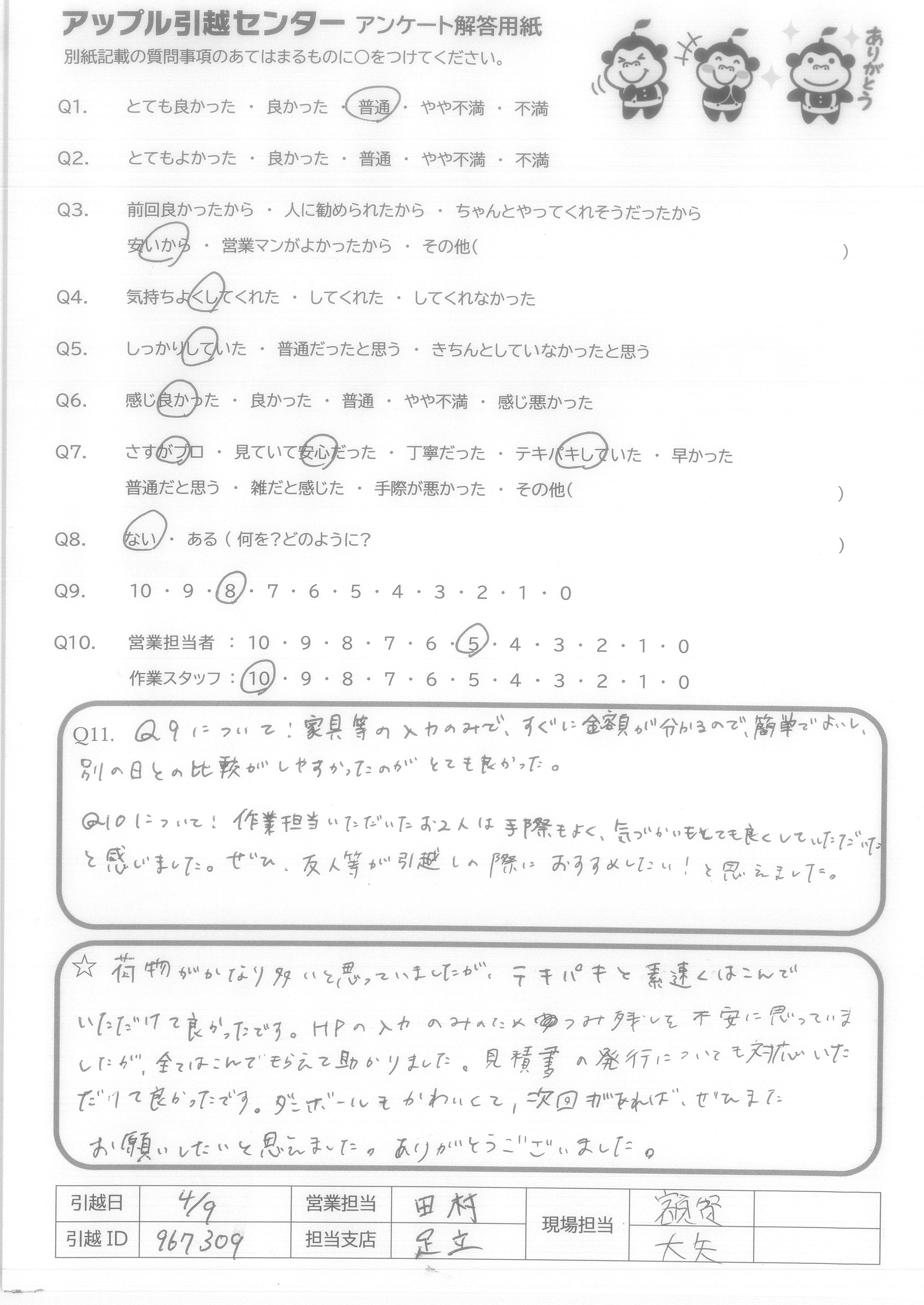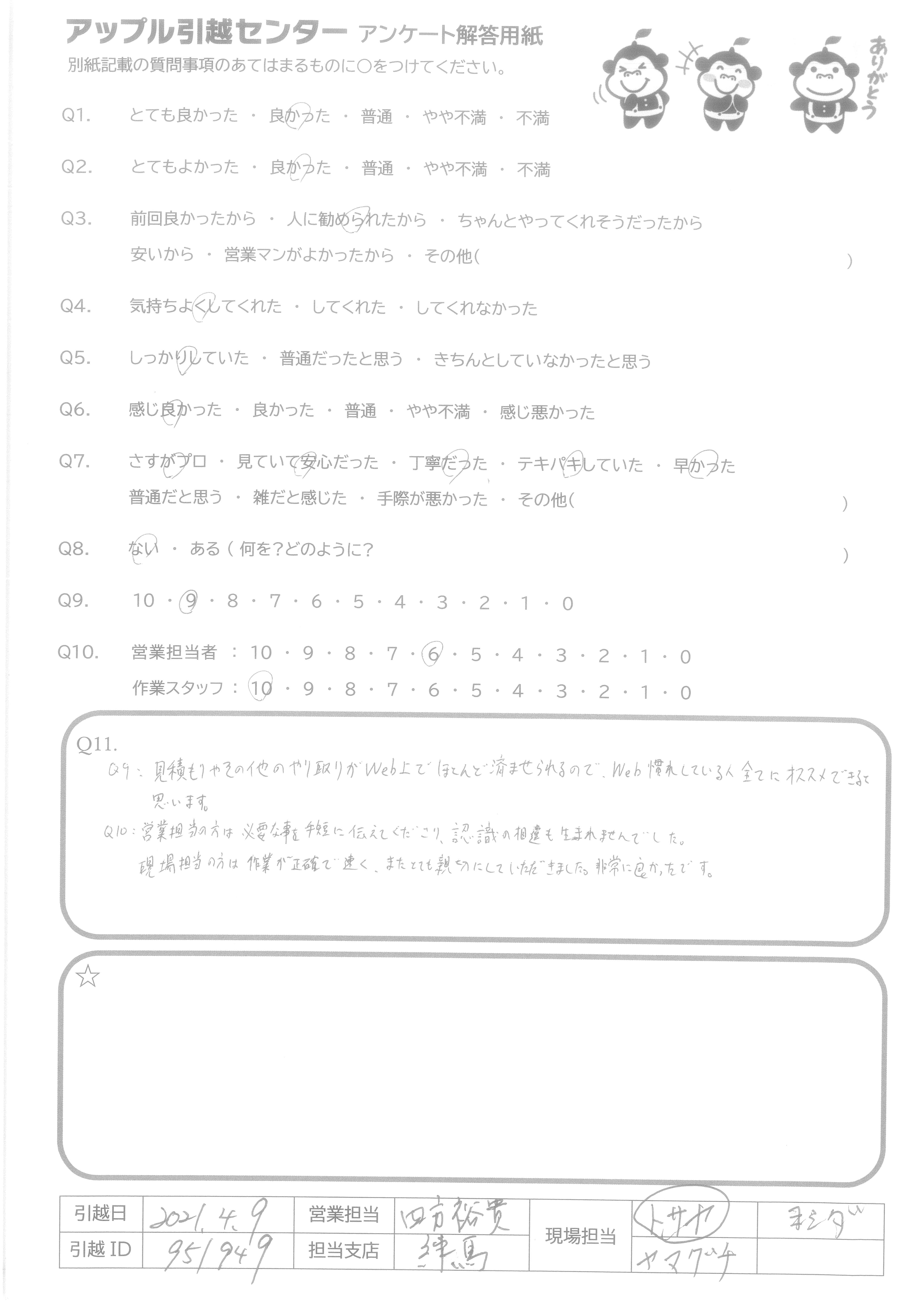 A.Q9について:家具等の入力のみで、すぐに金額が分かるので、簡単でよいし、別の日との比較がしやすかったのがとても良かった。 Q10について:作業担当いただいたお2人は手際もよく、気づかいもとても良くしていただいたと感じました。ぜひ、友人等が引越しの際におすすめしたい!と思えました。